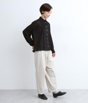 ナチュラルな風合いをより豊かに惹き立てた、ヴィンテージ感が特徴的なコットンスラブのガーゼ生地を使用しています。薄手で繊細さがあり、通気性もよく快適に着用できる生地感です。