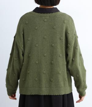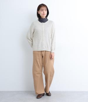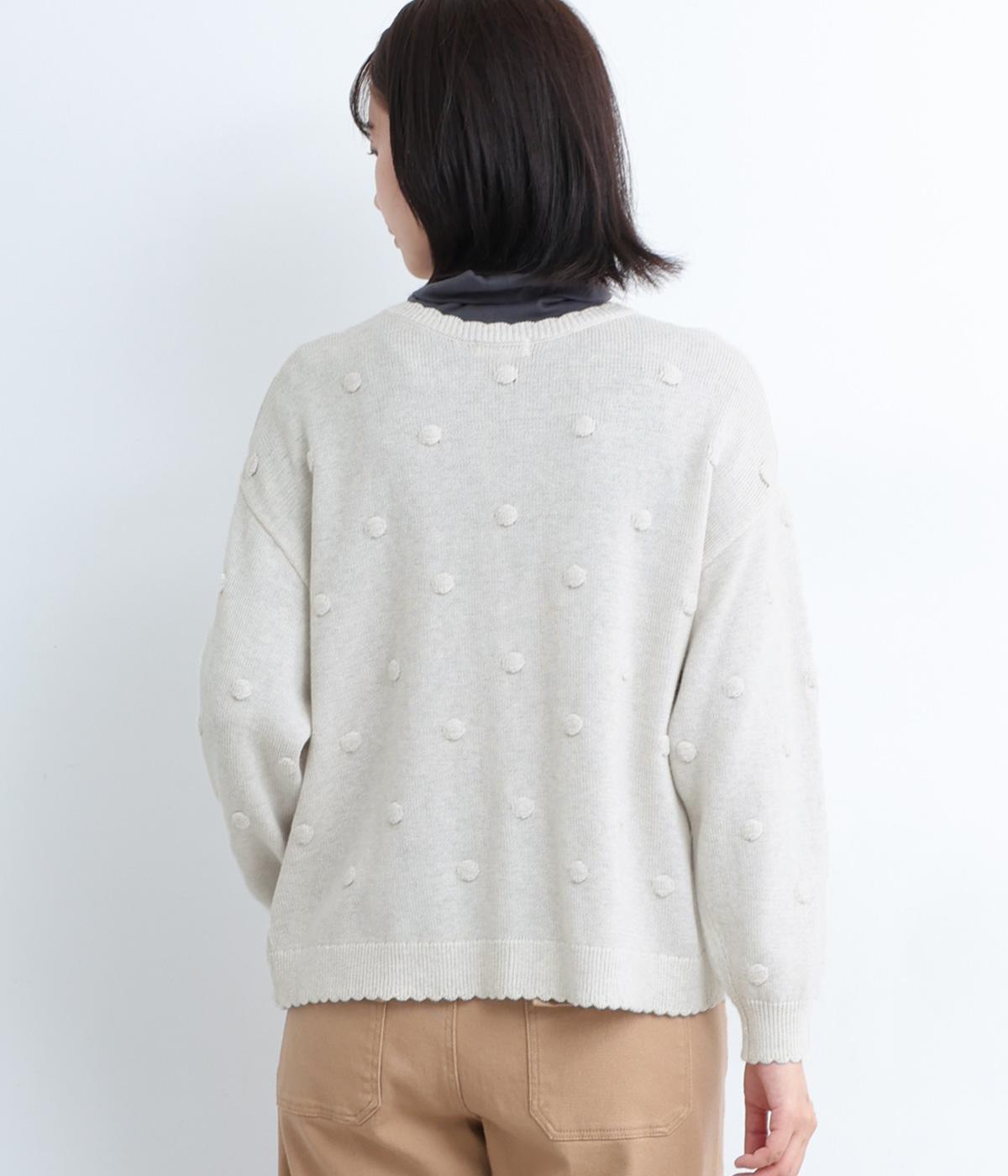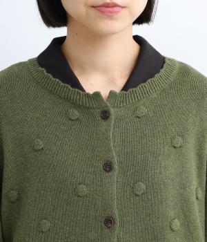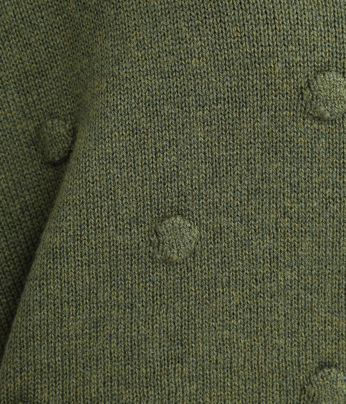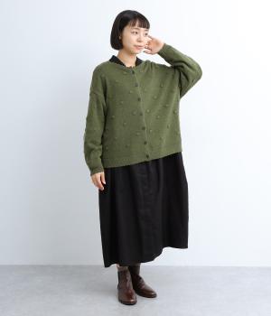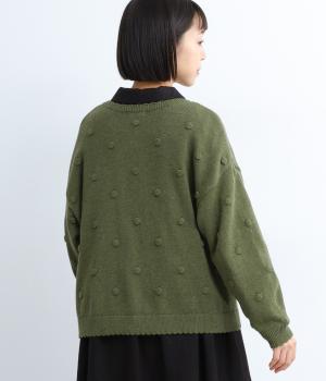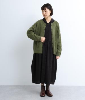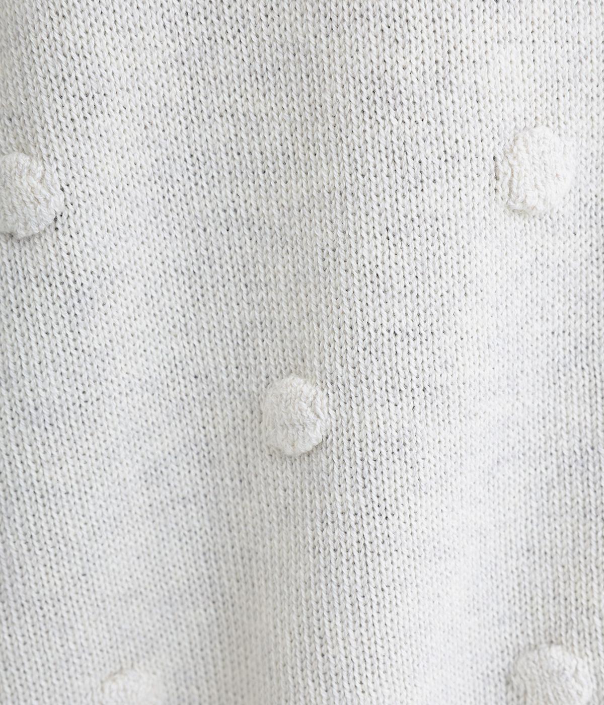 あたたかみがありながらも、やわらかく軽やかな肌ざわりのコットンウール。伸縮性があり、さらっと着やすいのが特徴です。ポコポコと立体的のあるドット柄をほどこしました。