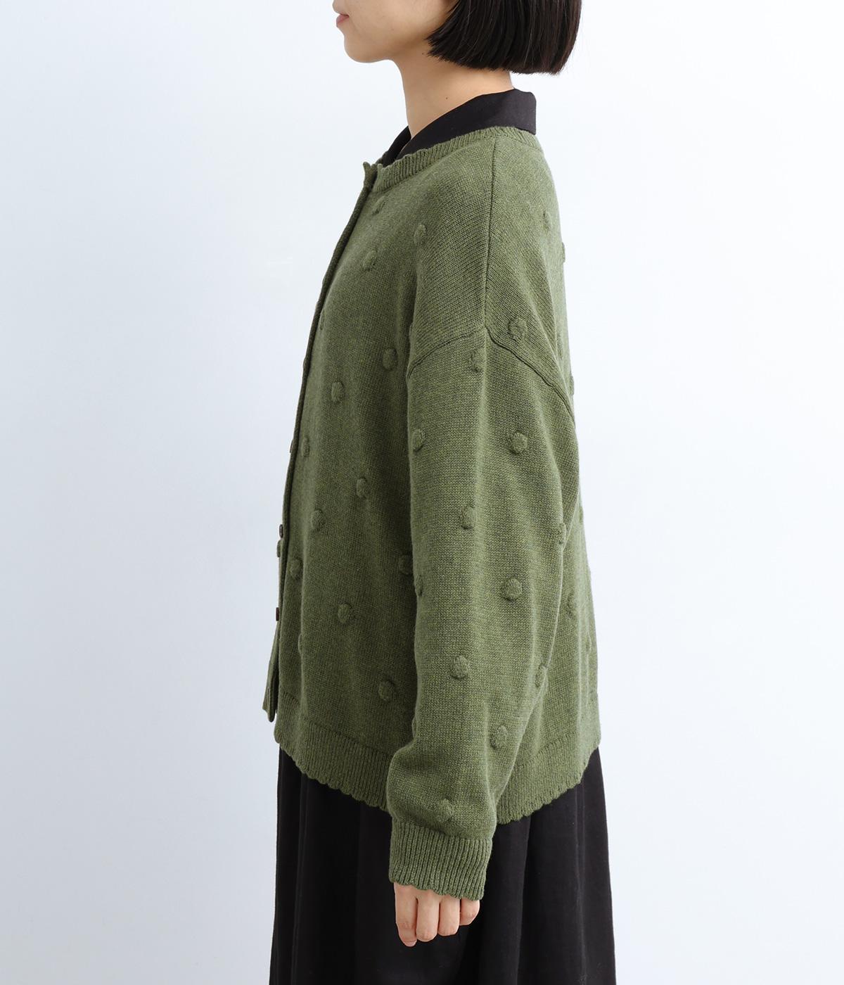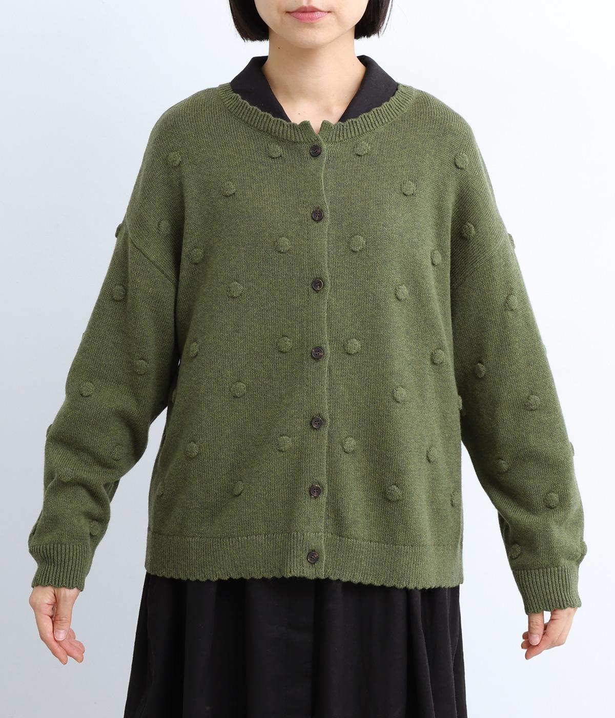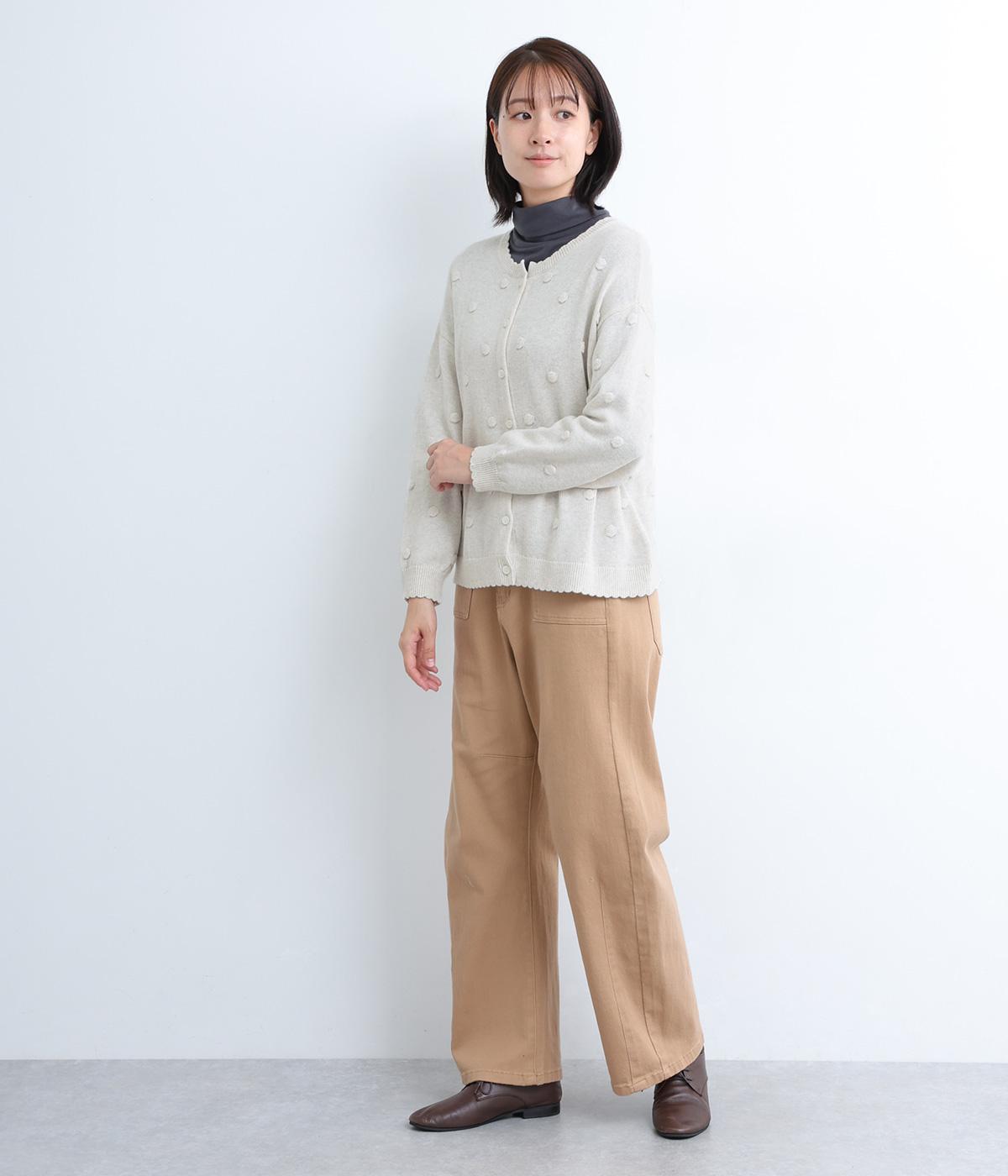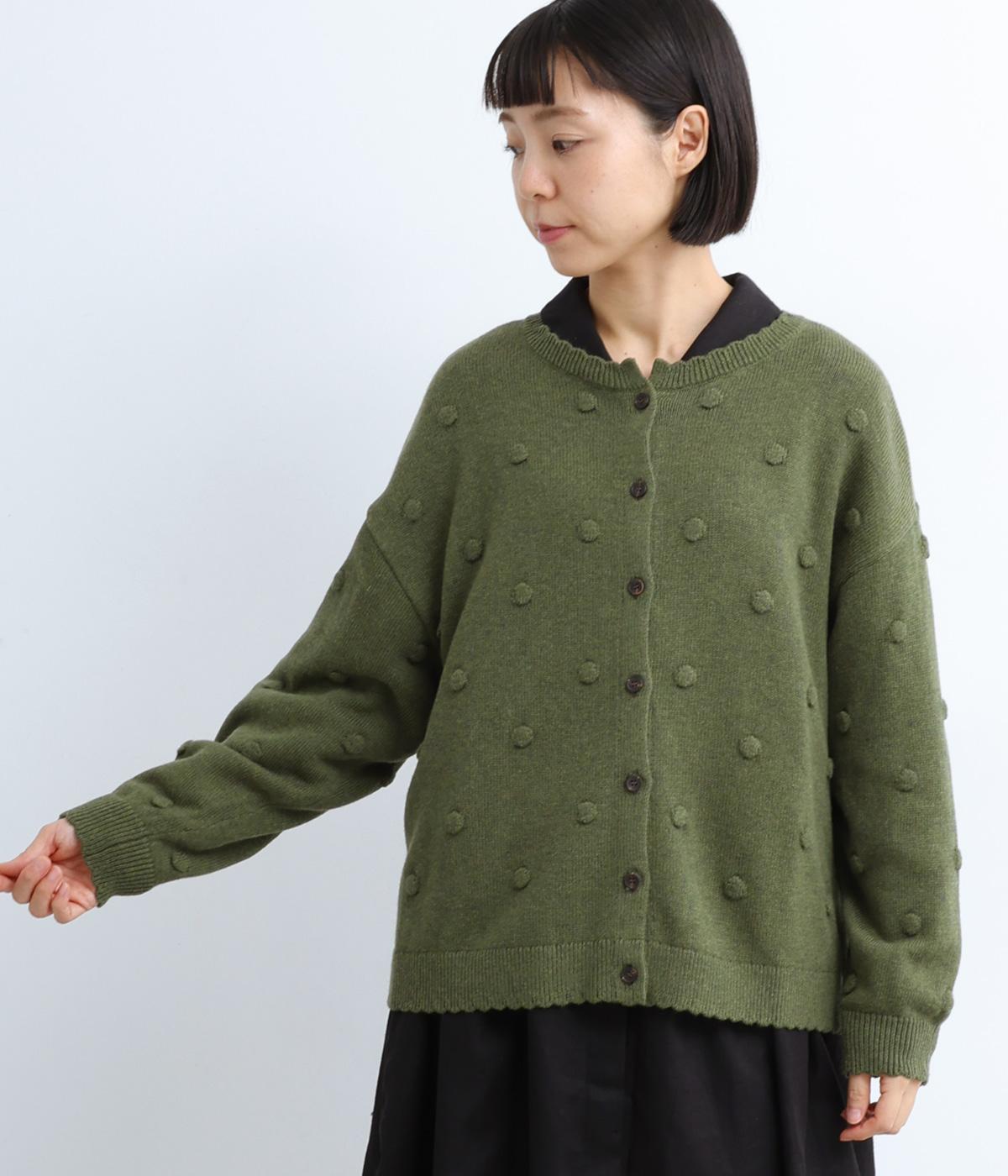 あたたかみがありながらも、やわらかく軽やかな肌ざわりのコットンウール。伸縮性があり、さらっと着やすいのが特徴です。ポコポコと立体的のあるドット柄をほどこしました。