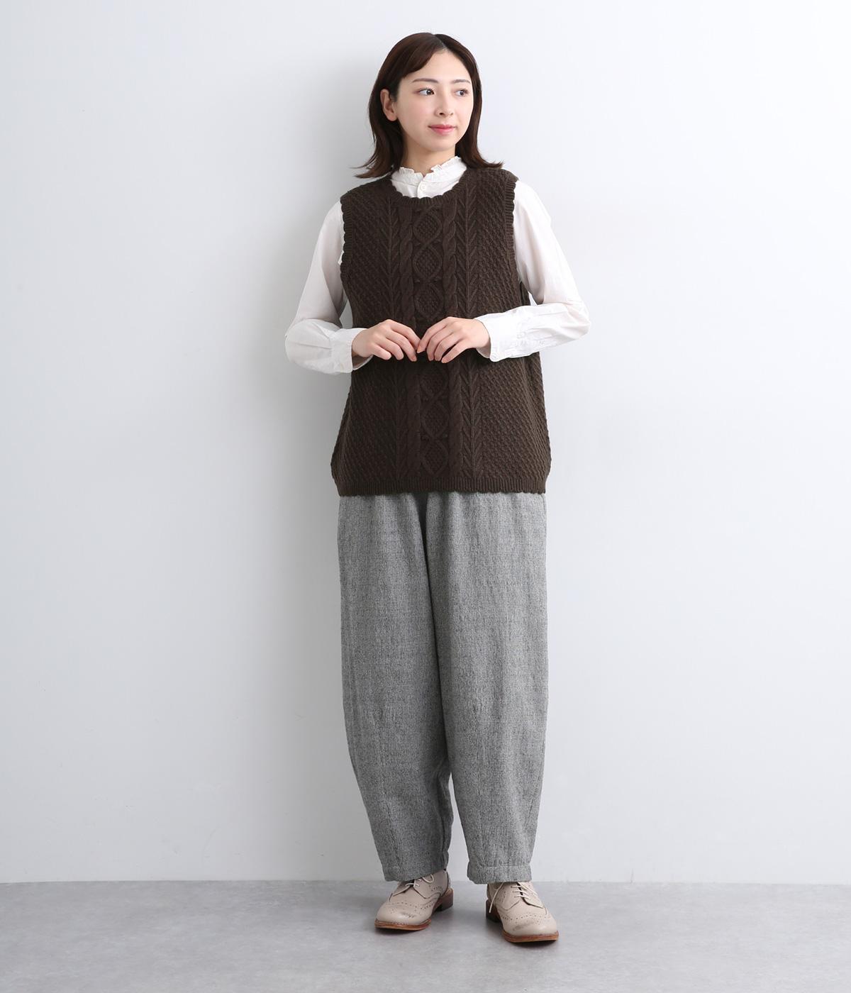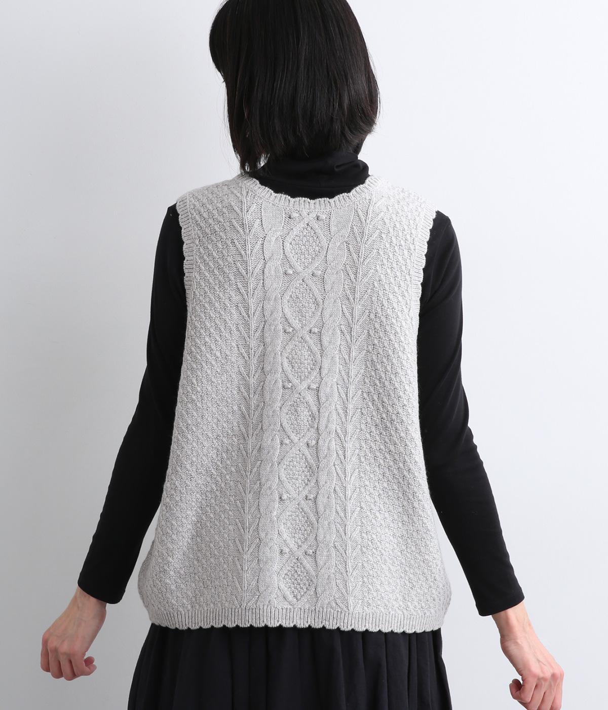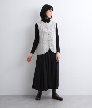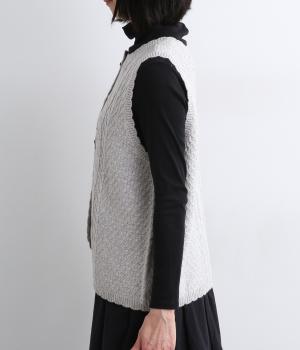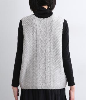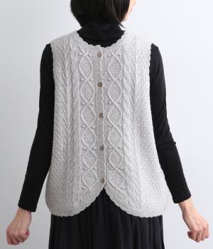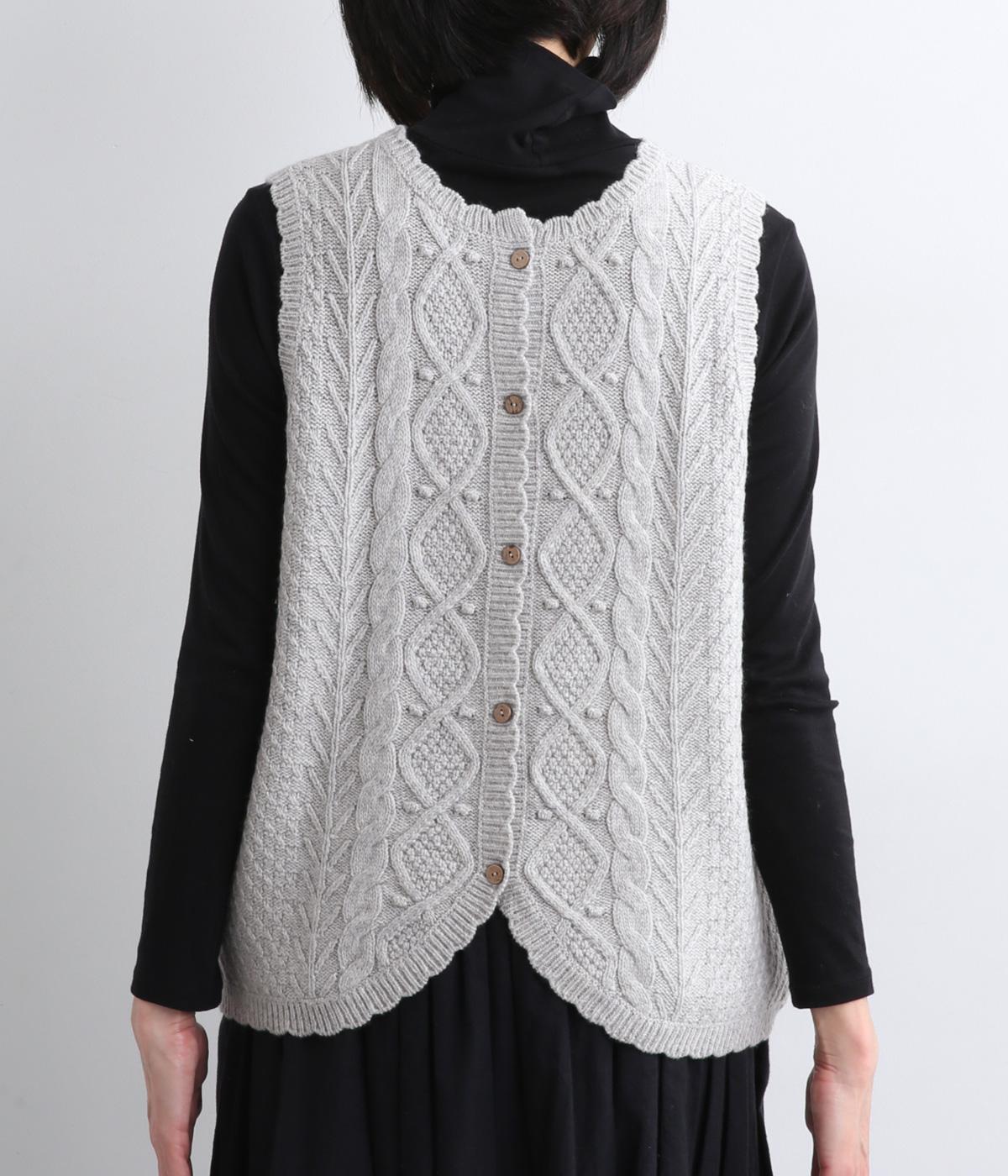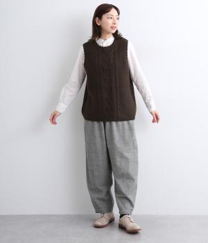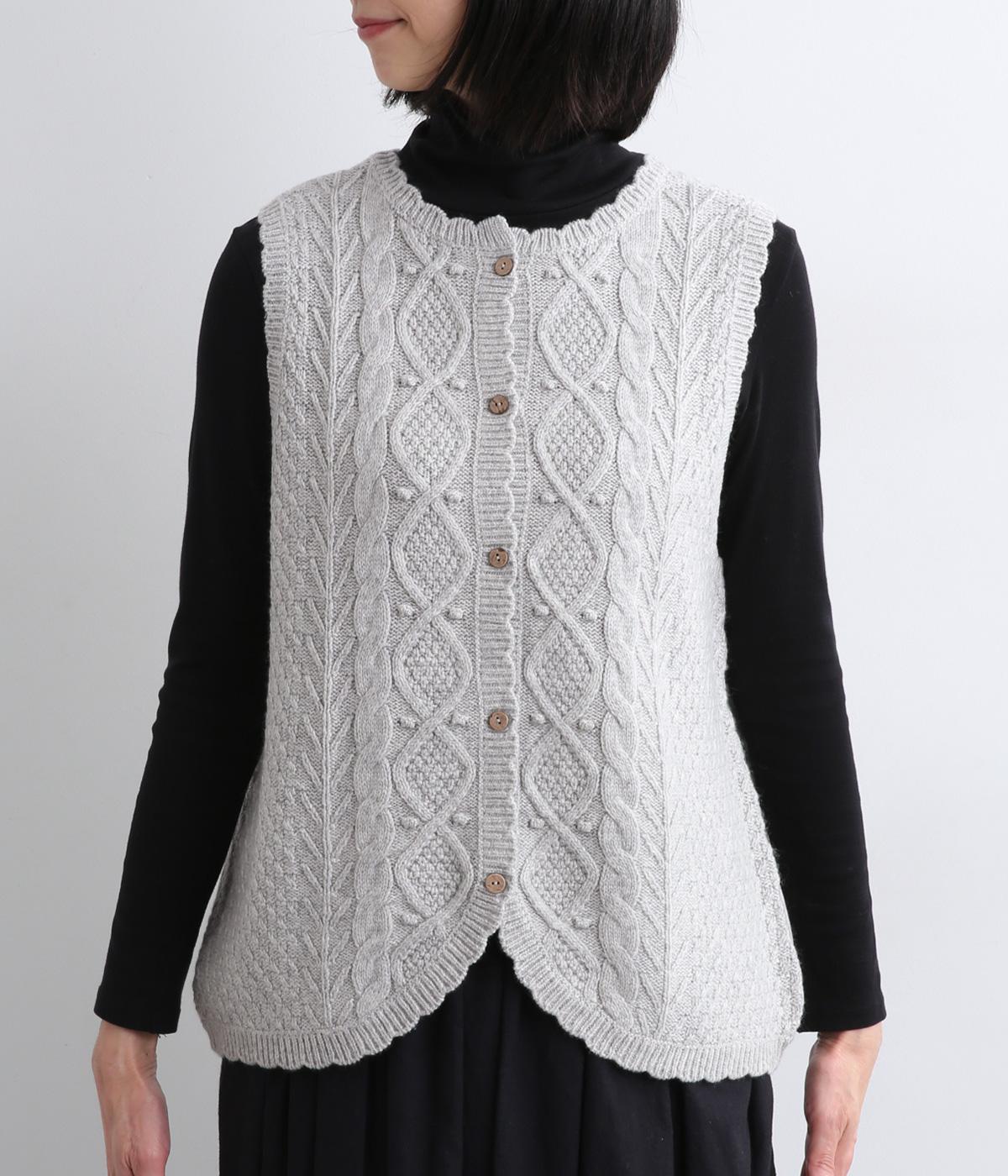 スカラップの縁取りがポイントの愛らしいベスト。前開きでもプルオーバーでも着られる2wayデザインです。丸く仕立てた前開きの裾がやさしい印象を与え、羽織るだけでコーディネートに奥行きをプラスします。