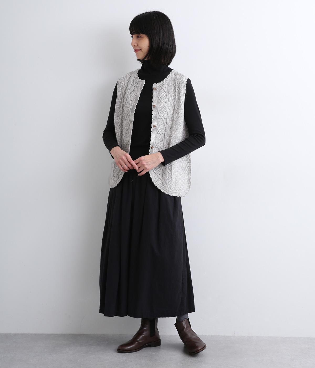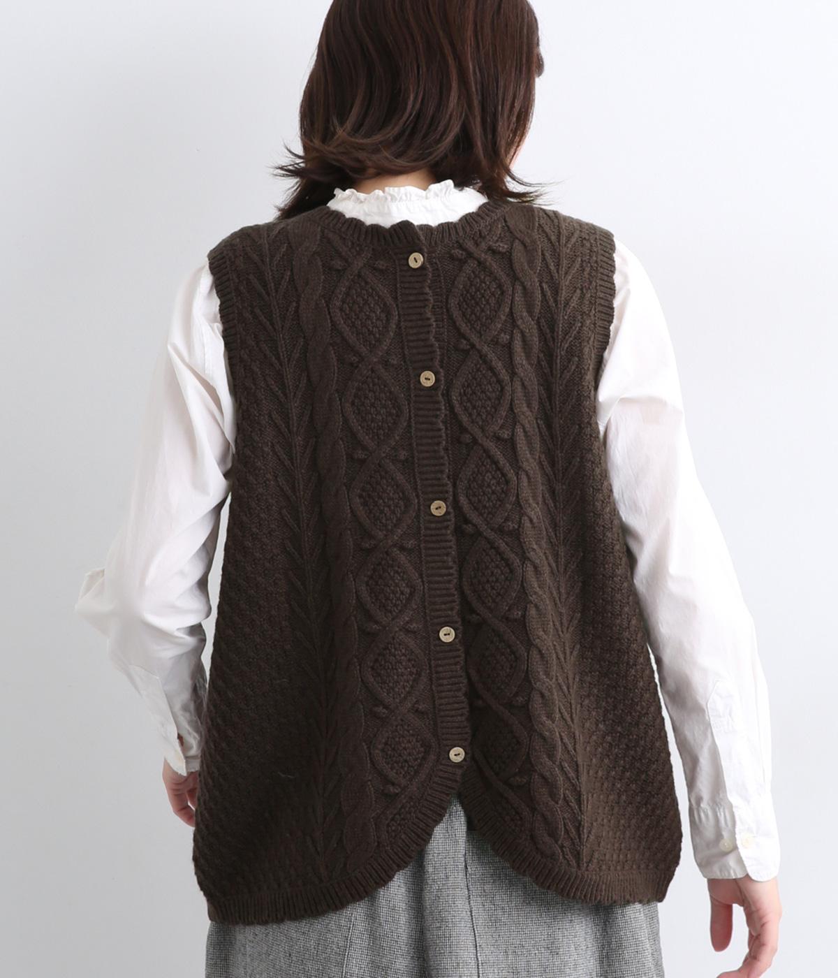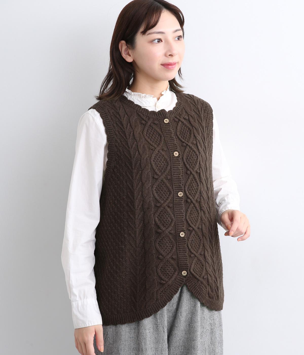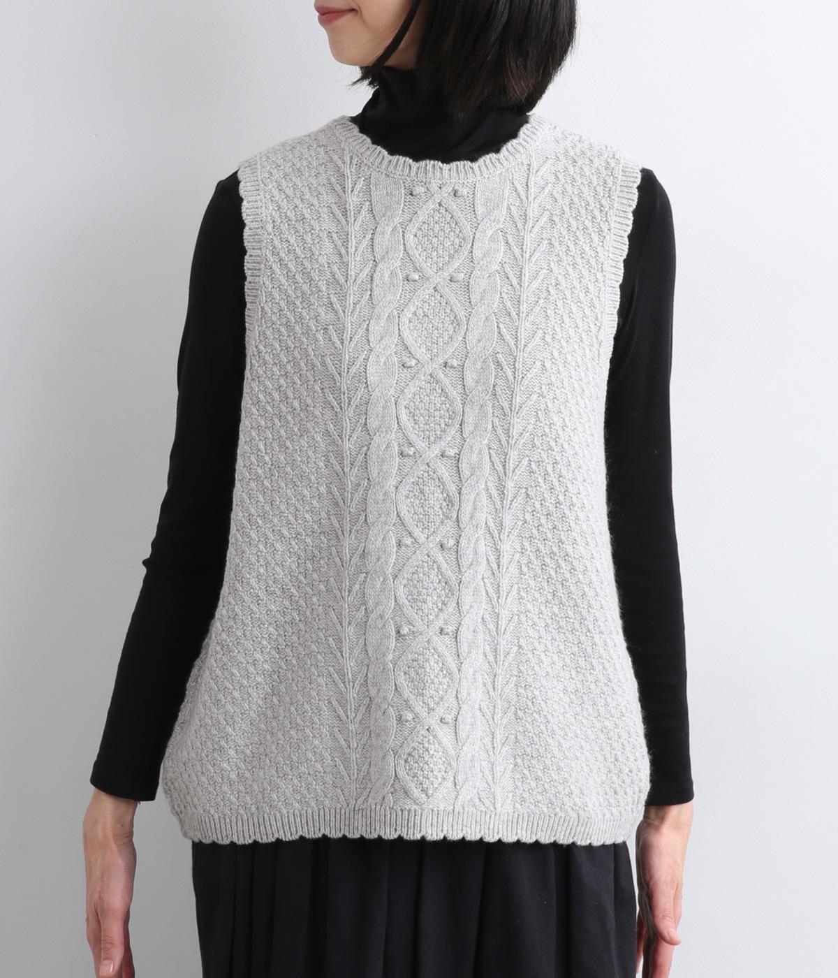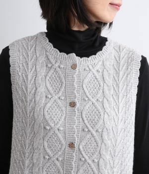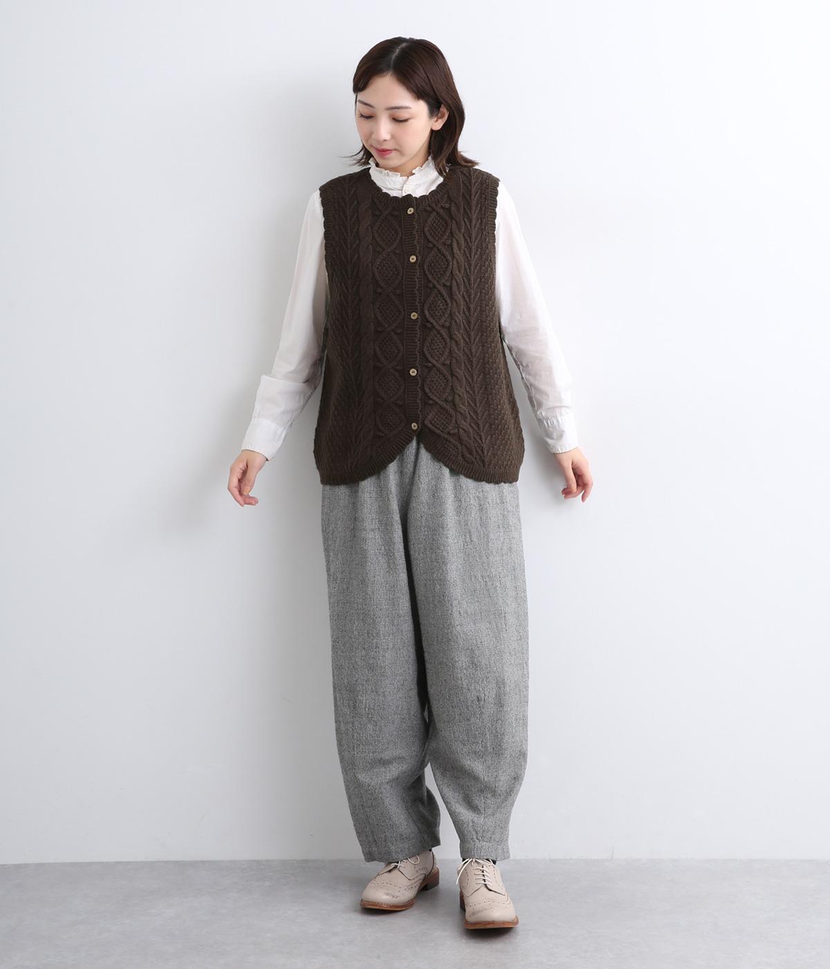 スカラップの縁取りがポイントの愛らしいベスト。前開きでもプルオーバーでも着られる2wayデザインです。丸く仕立てた前開きの裾がやさしい印象を与え、羽織るだけでコーディネートに奥行きをプラスします。