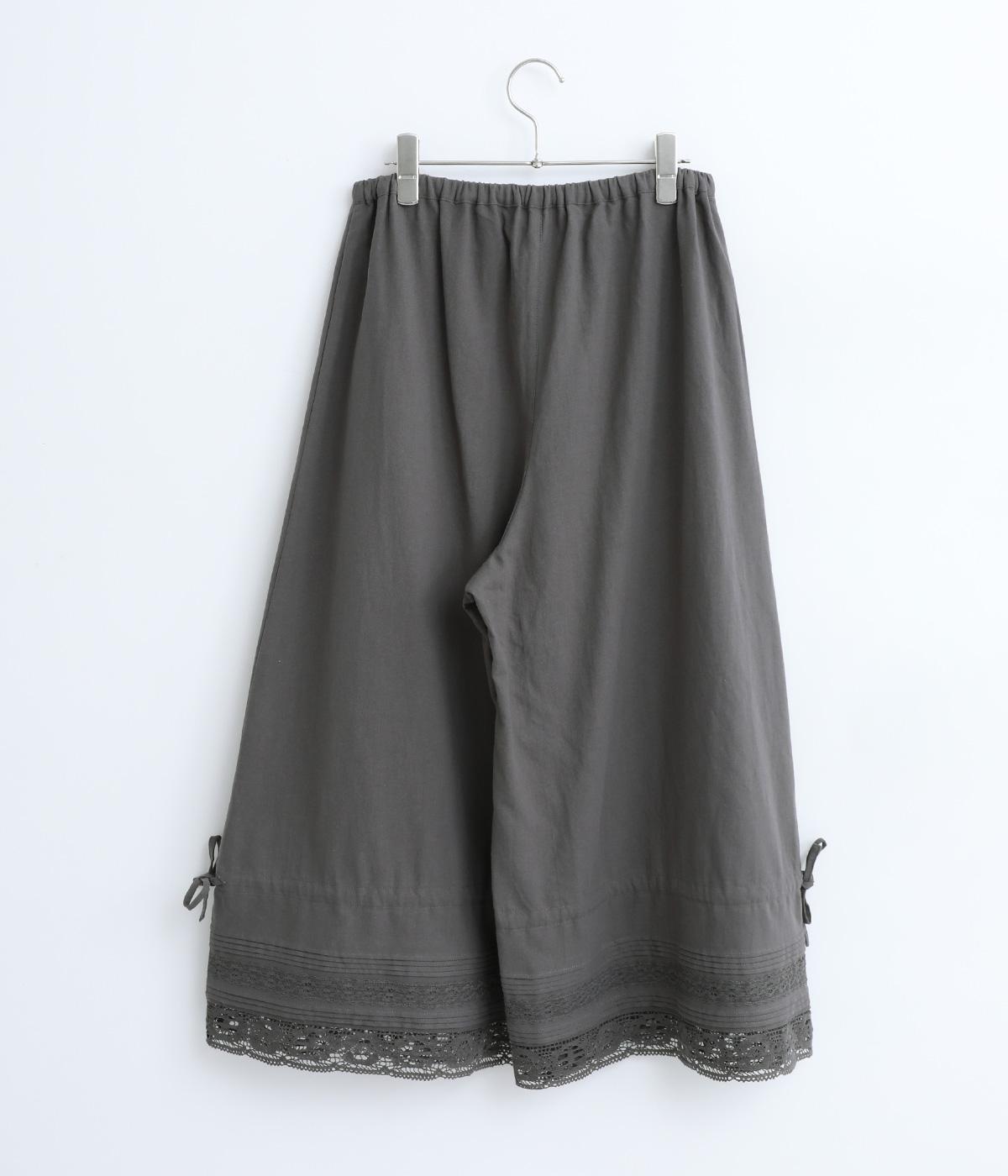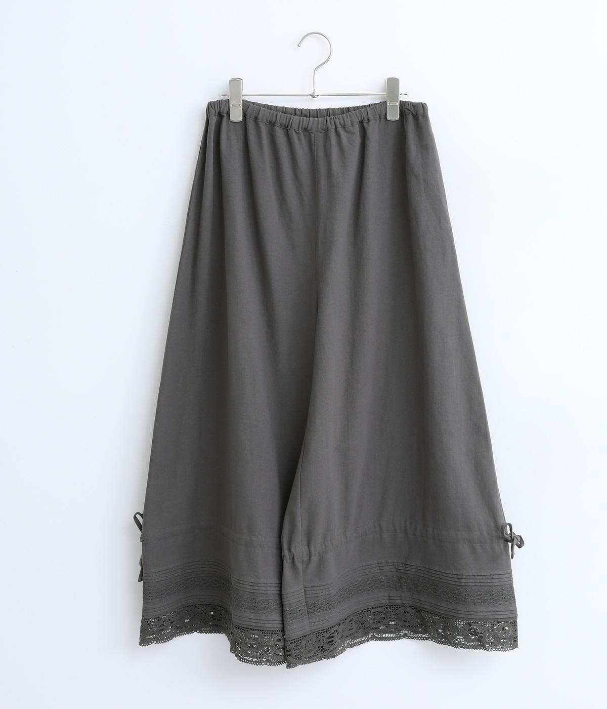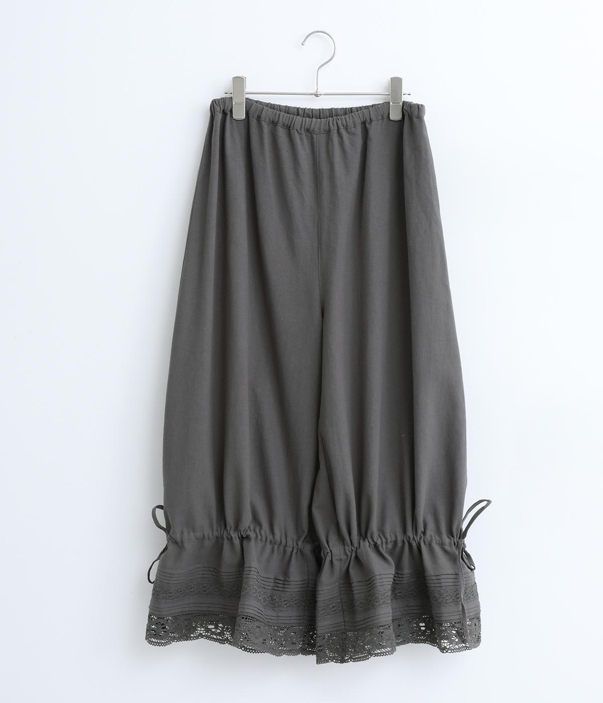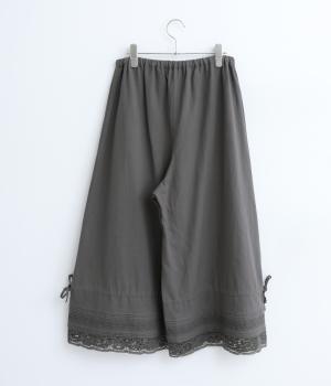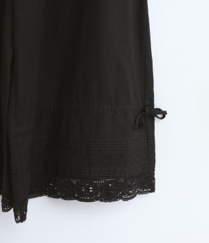 裾にピンタックやレースでロマンティックなディテールを添えたペチコートパンツ。ゆったりとワイドなキュロットタイプで、リボンをしぼってバルーンシルエットもたのしめる2way仕様。ウエストは総ゴム&内紐のイージー仕上げです。