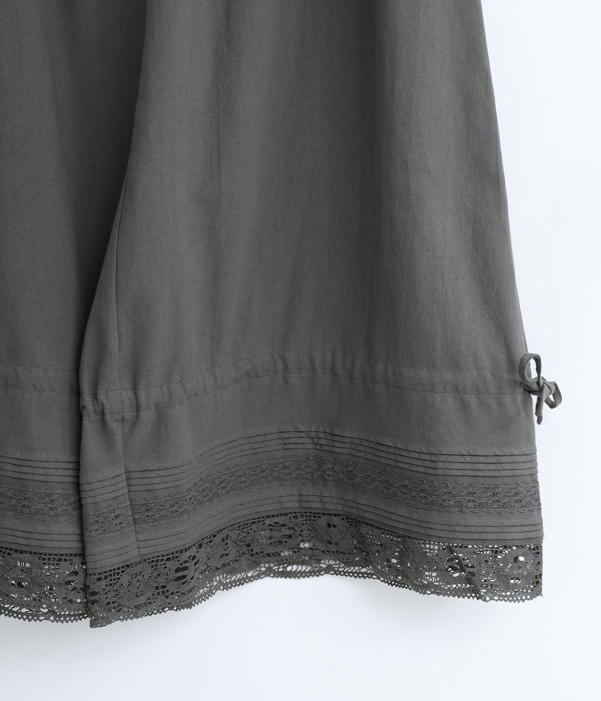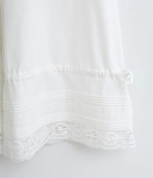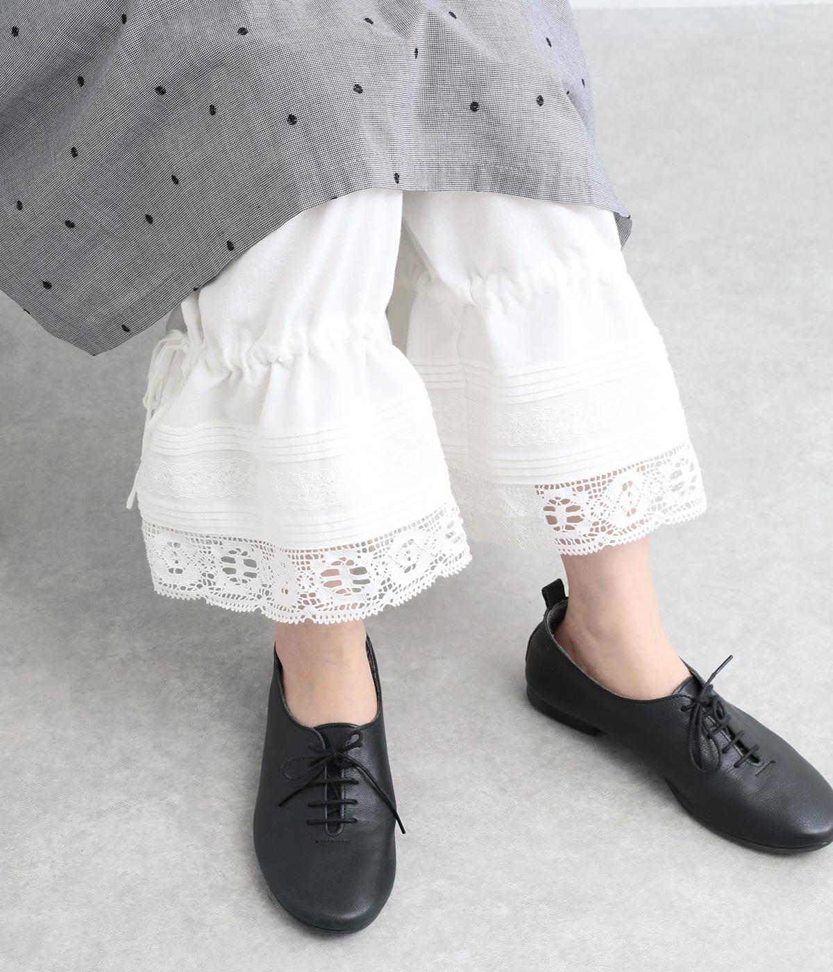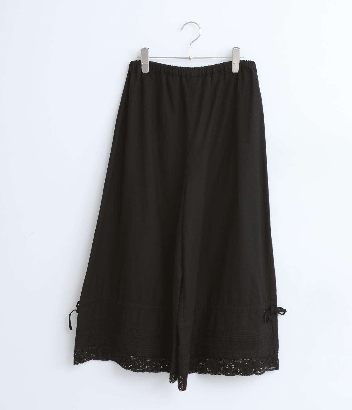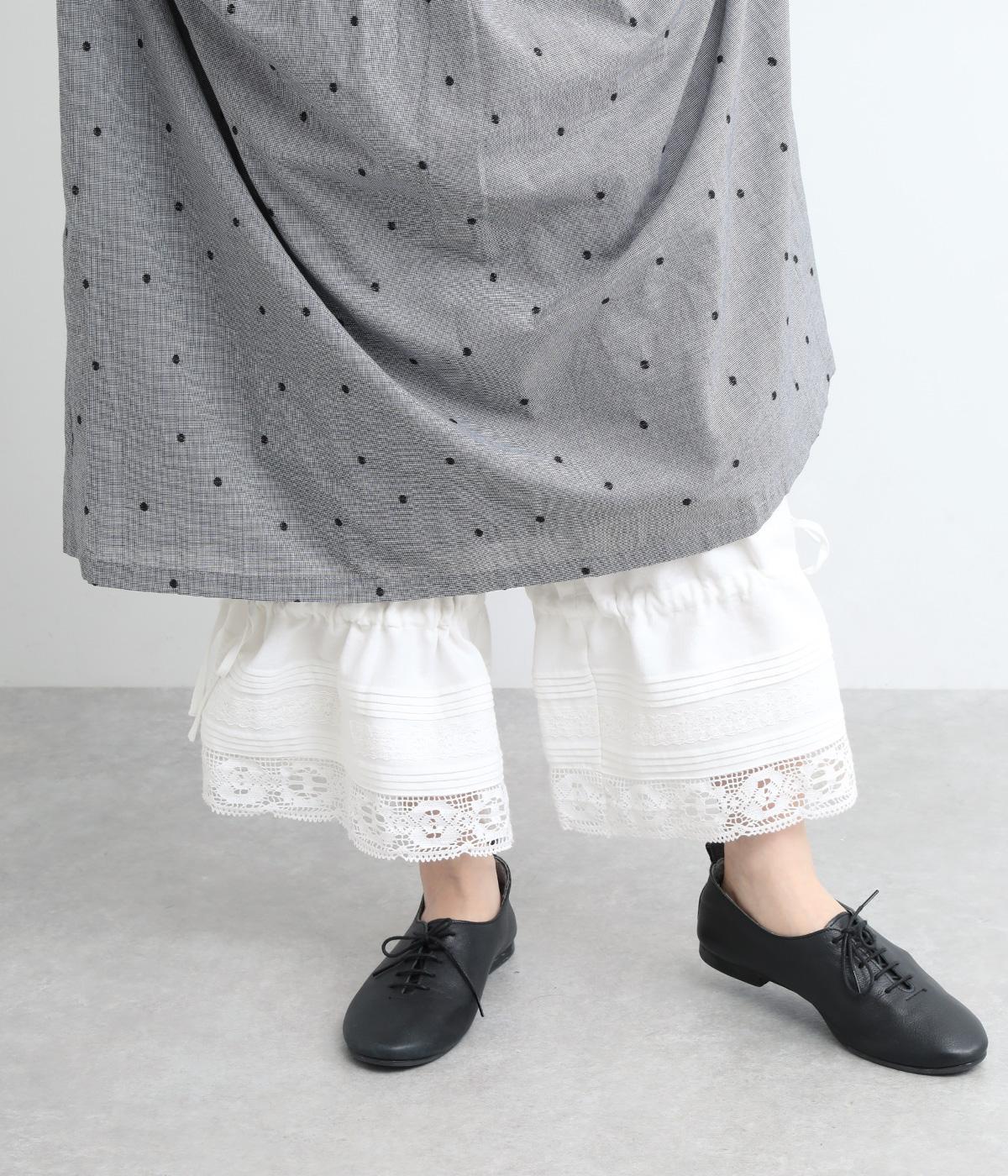 裾にピンタックやレースでロマンティックなディテールを添えたペチコートパンツ。ゆったりとワイドなキュロットタイプで、リボンをしぼってバルーンシルエットもたのしめる2way仕様。ウエストは総ゴム&内紐のイージー仕上げです。