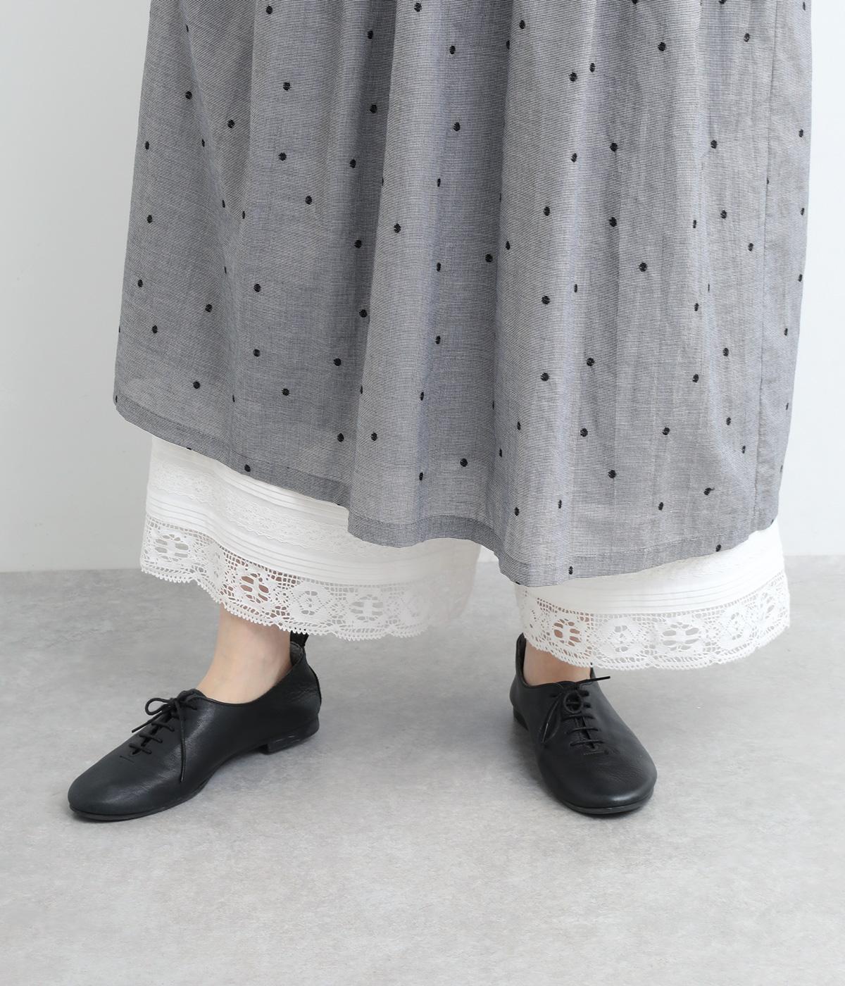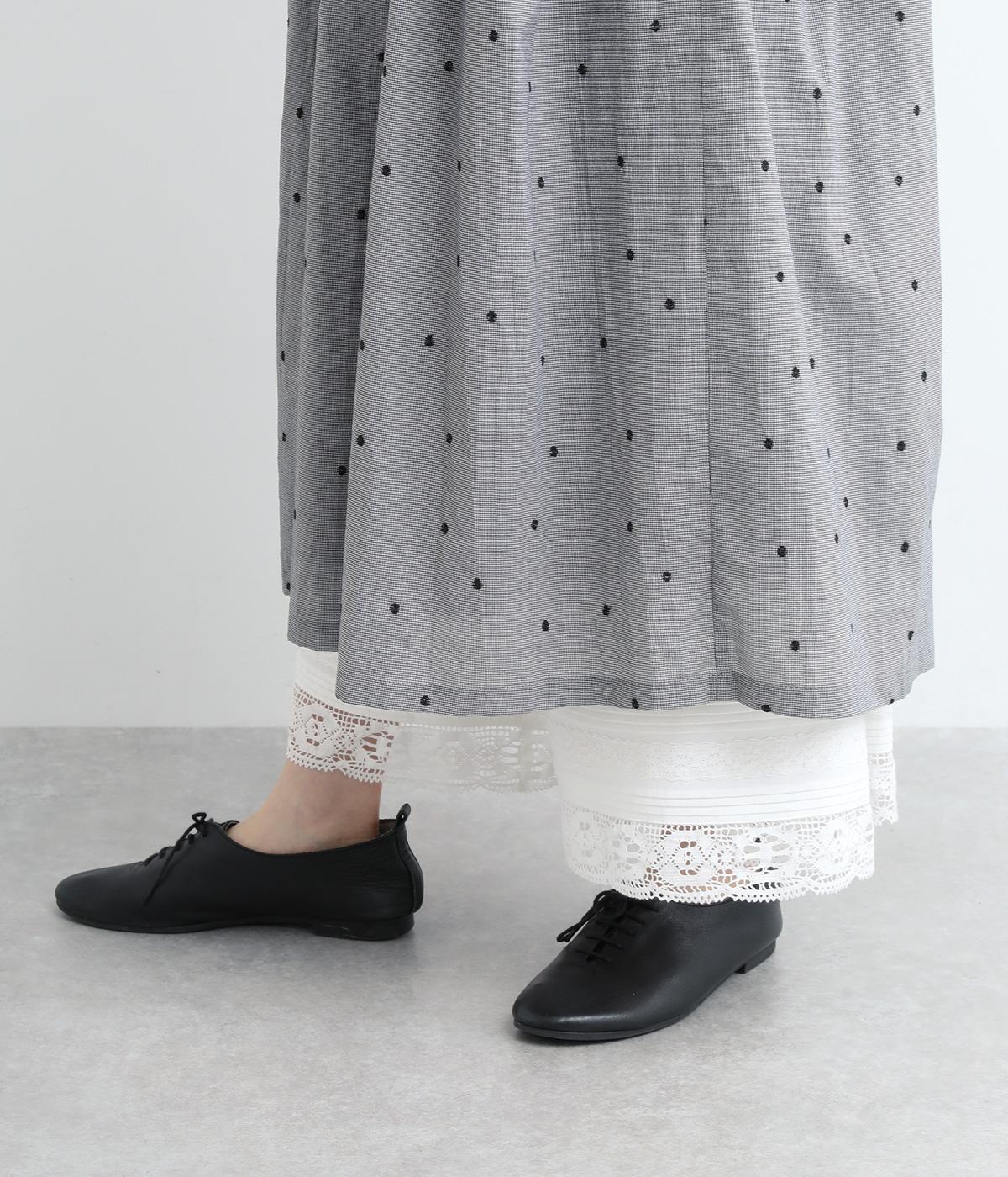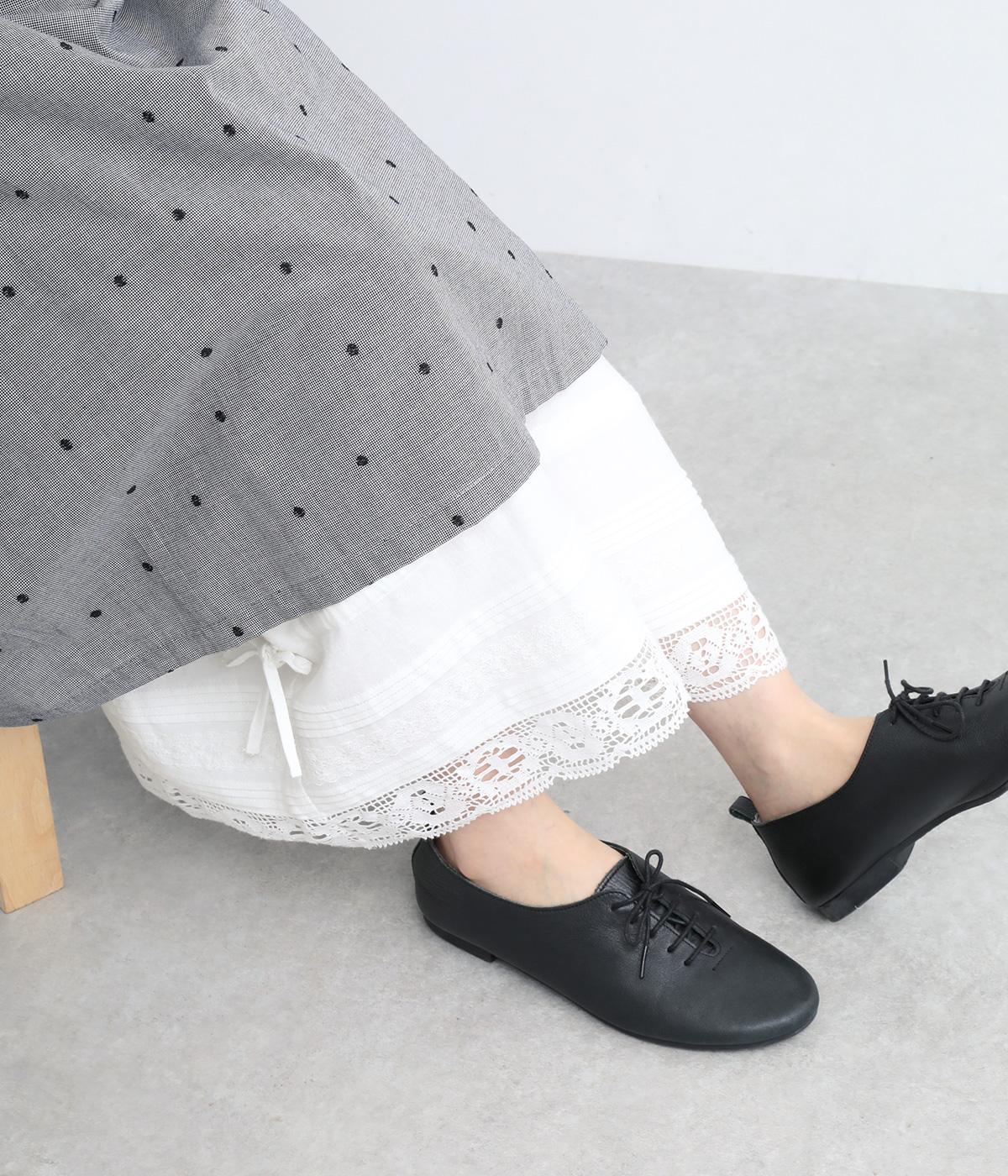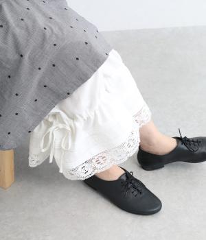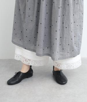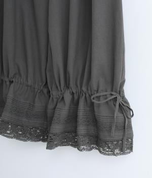 裾にピンタックやレースでロマンティックなディテールを添えたペチコートパンツ。ゆったりとワイドなキュロットタイプで、リボンをしぼってバルーンシルエットもたのしめる2way仕様。ウエストは総ゴム&内紐のイージー仕上げです。