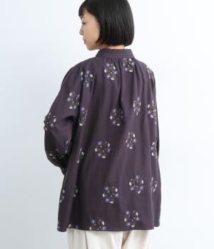袖口とスタンドカラーにほどこしたタックプリーツが上品な印象のブラウス。シックで大人らしい花柄刺しゅうがサークル型を描き、華やかさをプラスします。長めの着丈で気になるヒップをカバーできるのも◎。