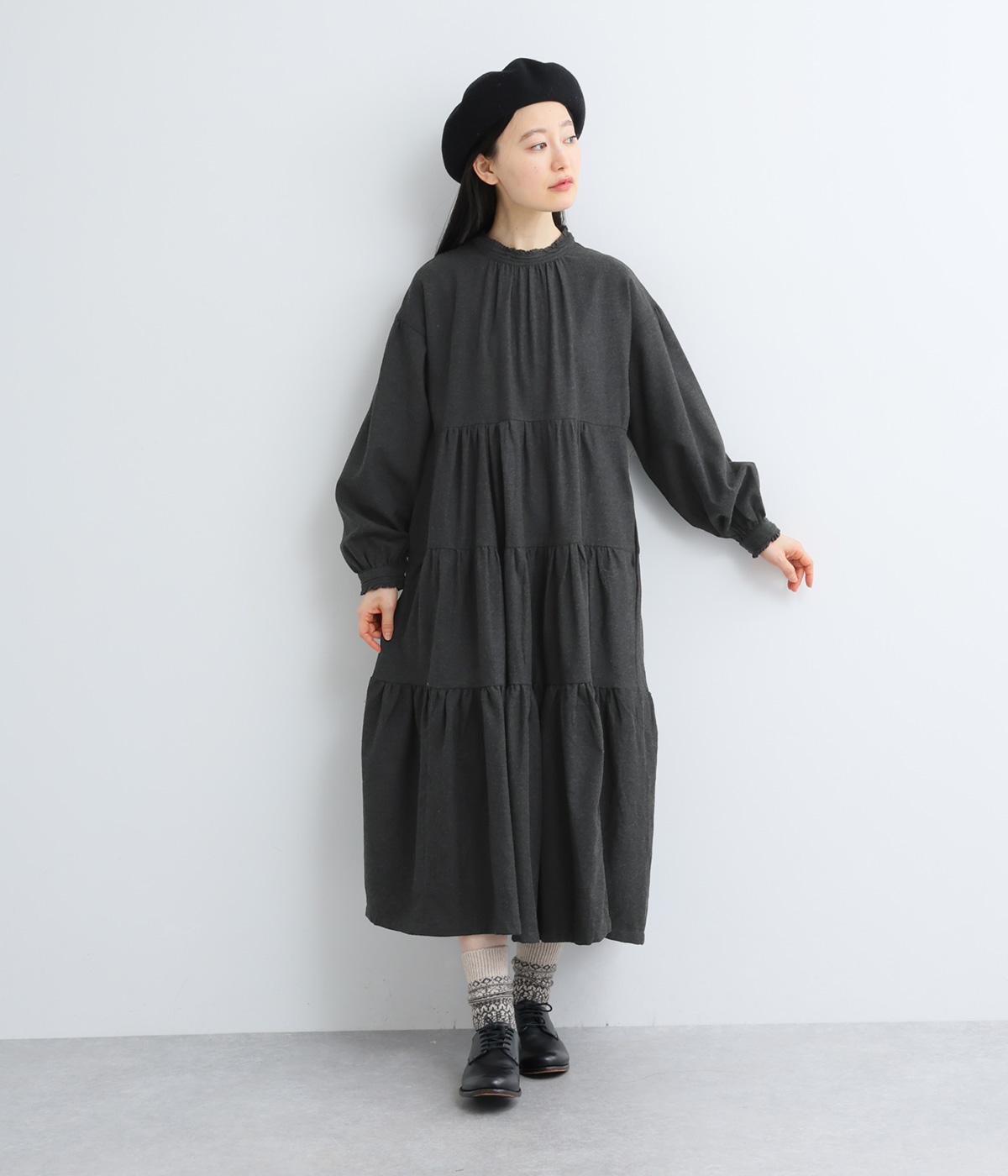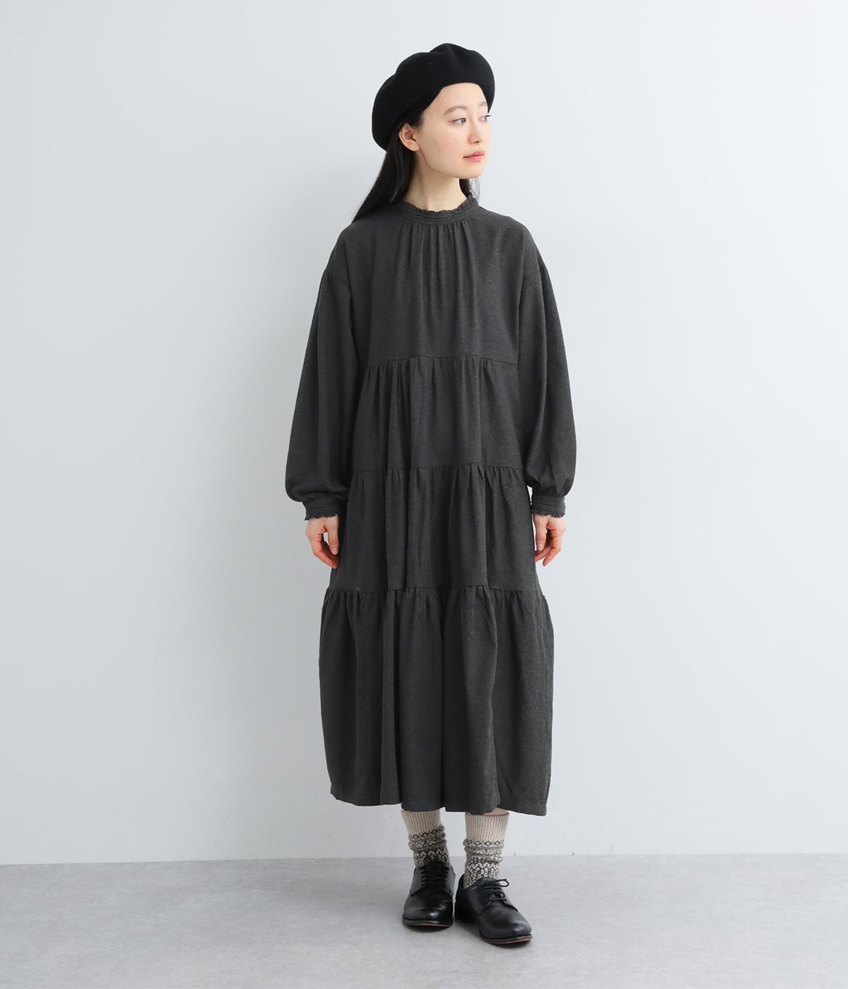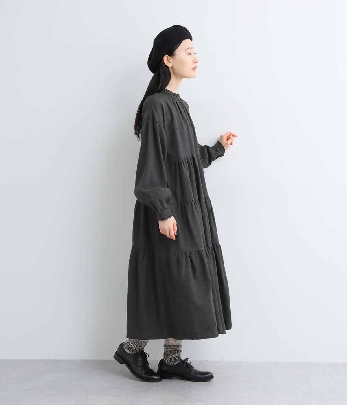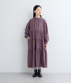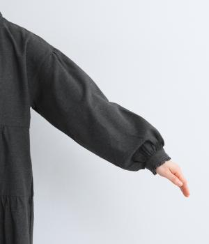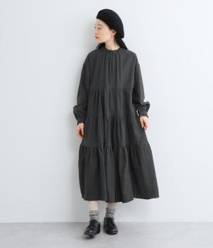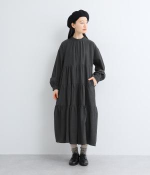 大人かわいい雰囲気漂うティアードワンピースです。首元と袖口にはさりげないフリルを添えて、ほんのり可憐なアクセントに。たっぷりの生地感が優雅なドレープをつくり、上品な印象に仕上げています。