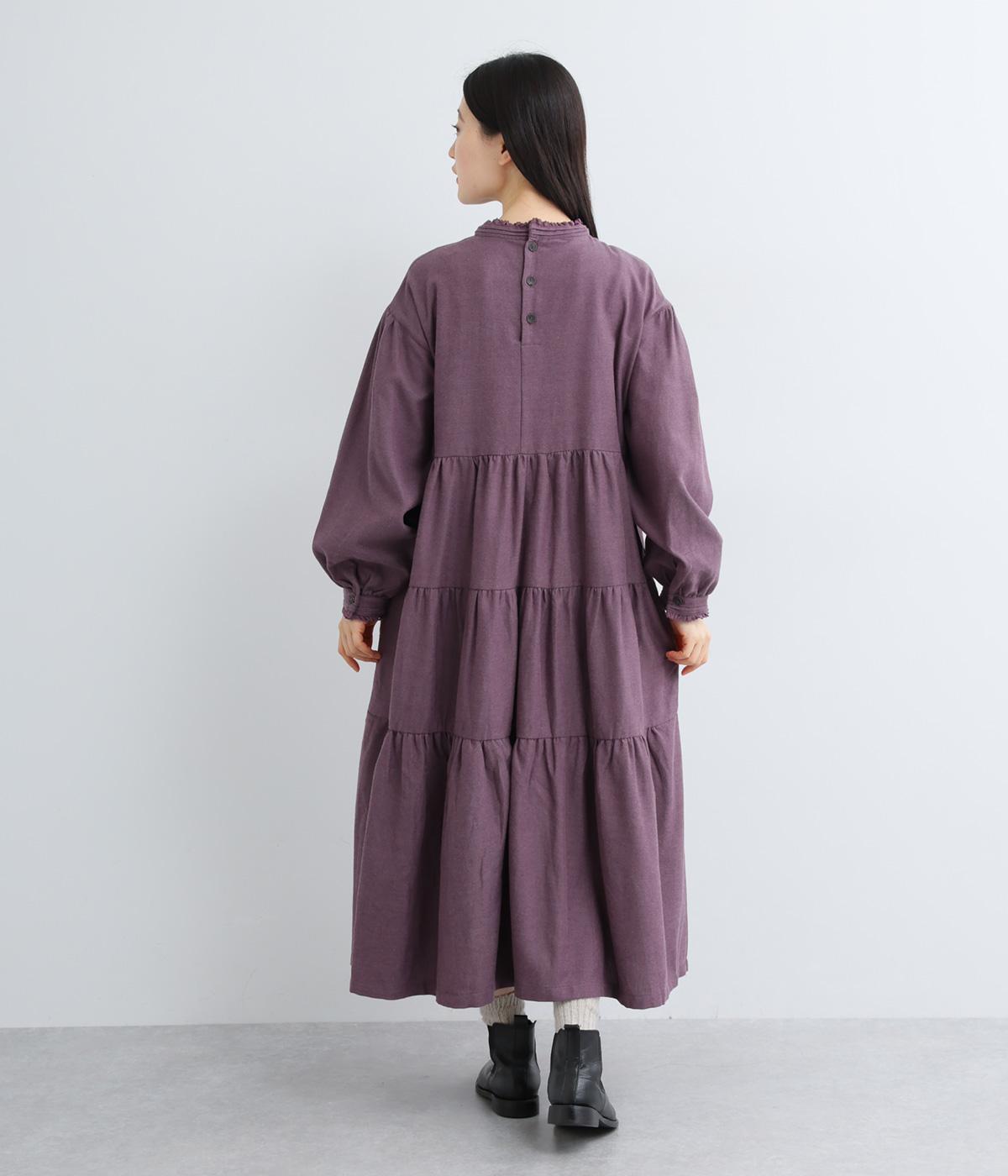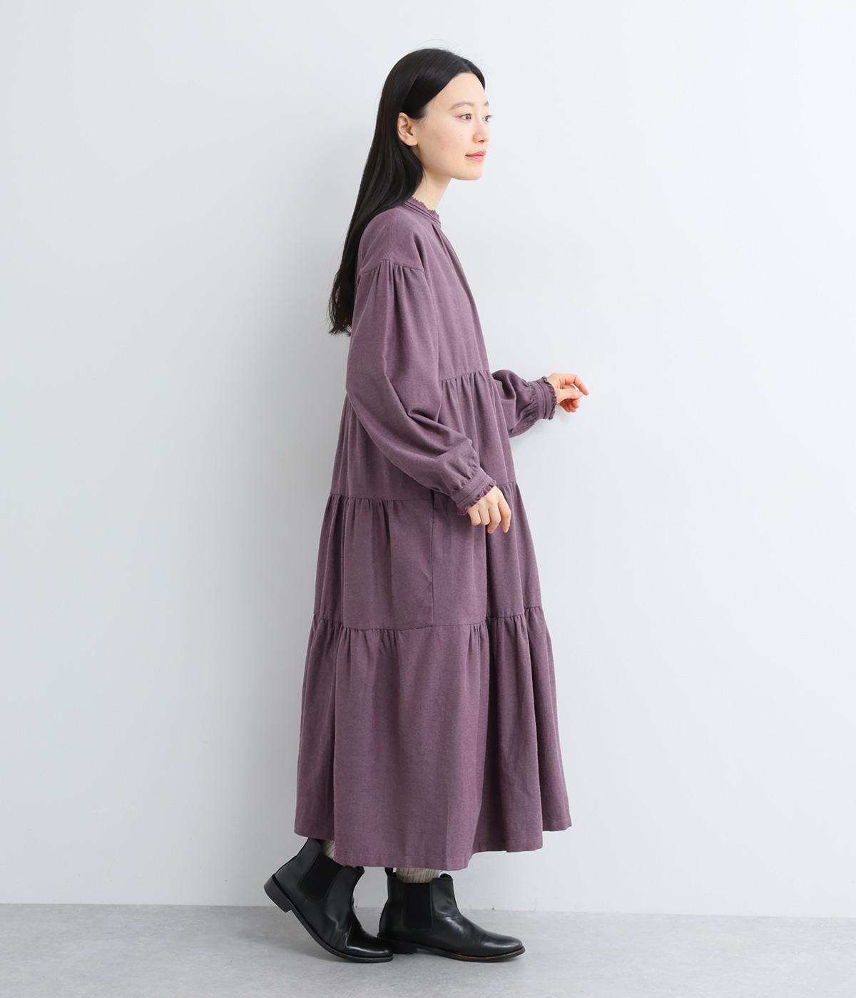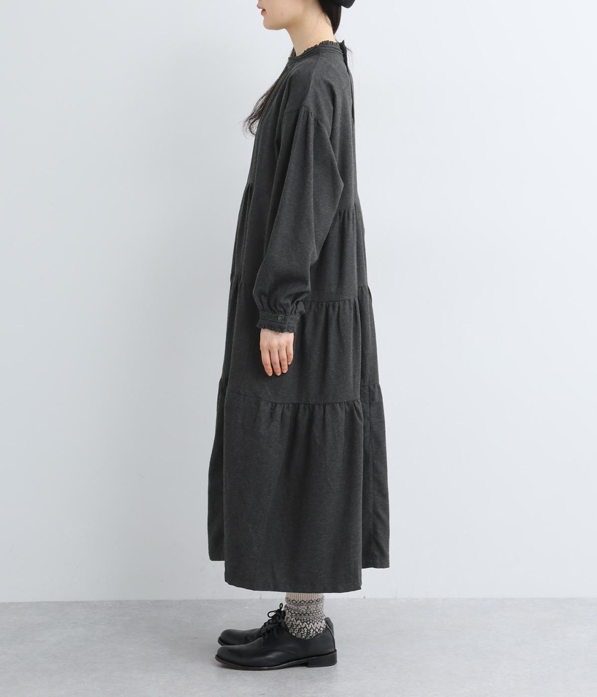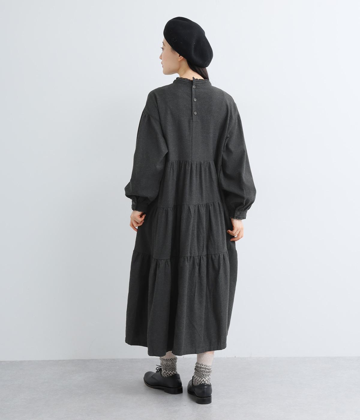 大人かわいい雰囲気漂うティアードワンピースです。首元と袖口にはさりげないフリルを添えて、ほんのり可憐なアクセントに。たっぷりの生地感が優雅なドレープをつくり、上品な印象に仕上げています。