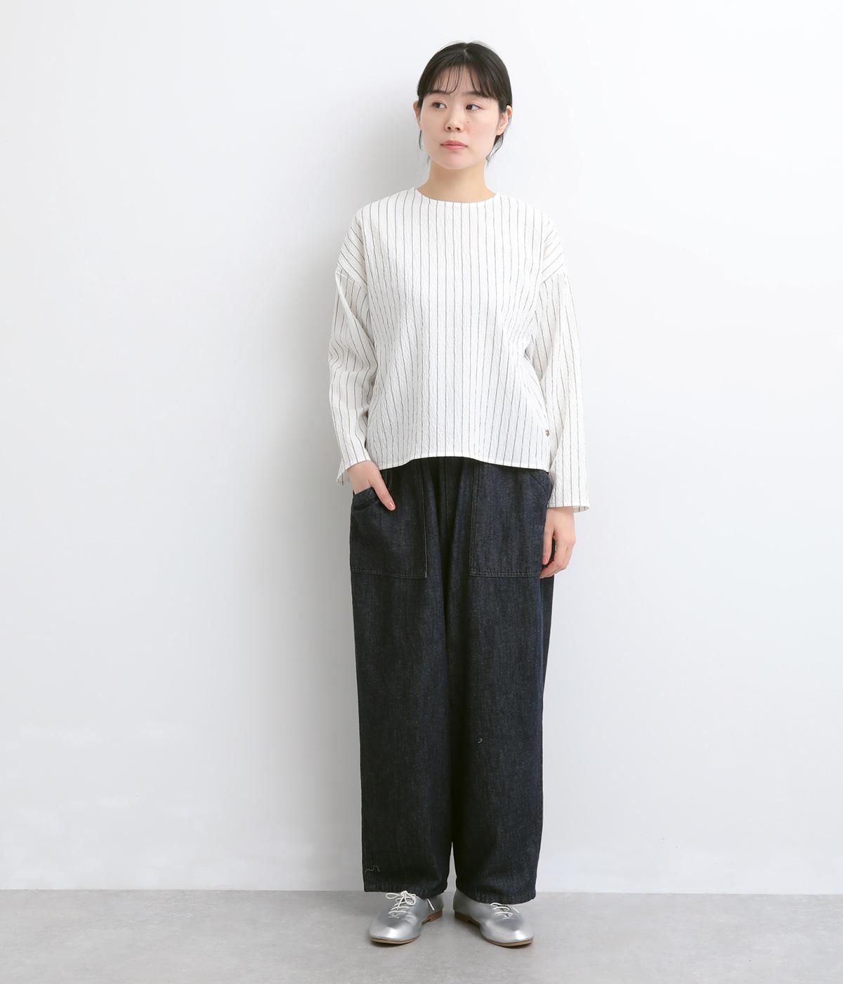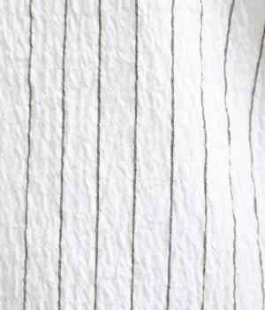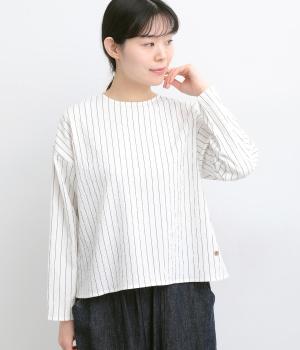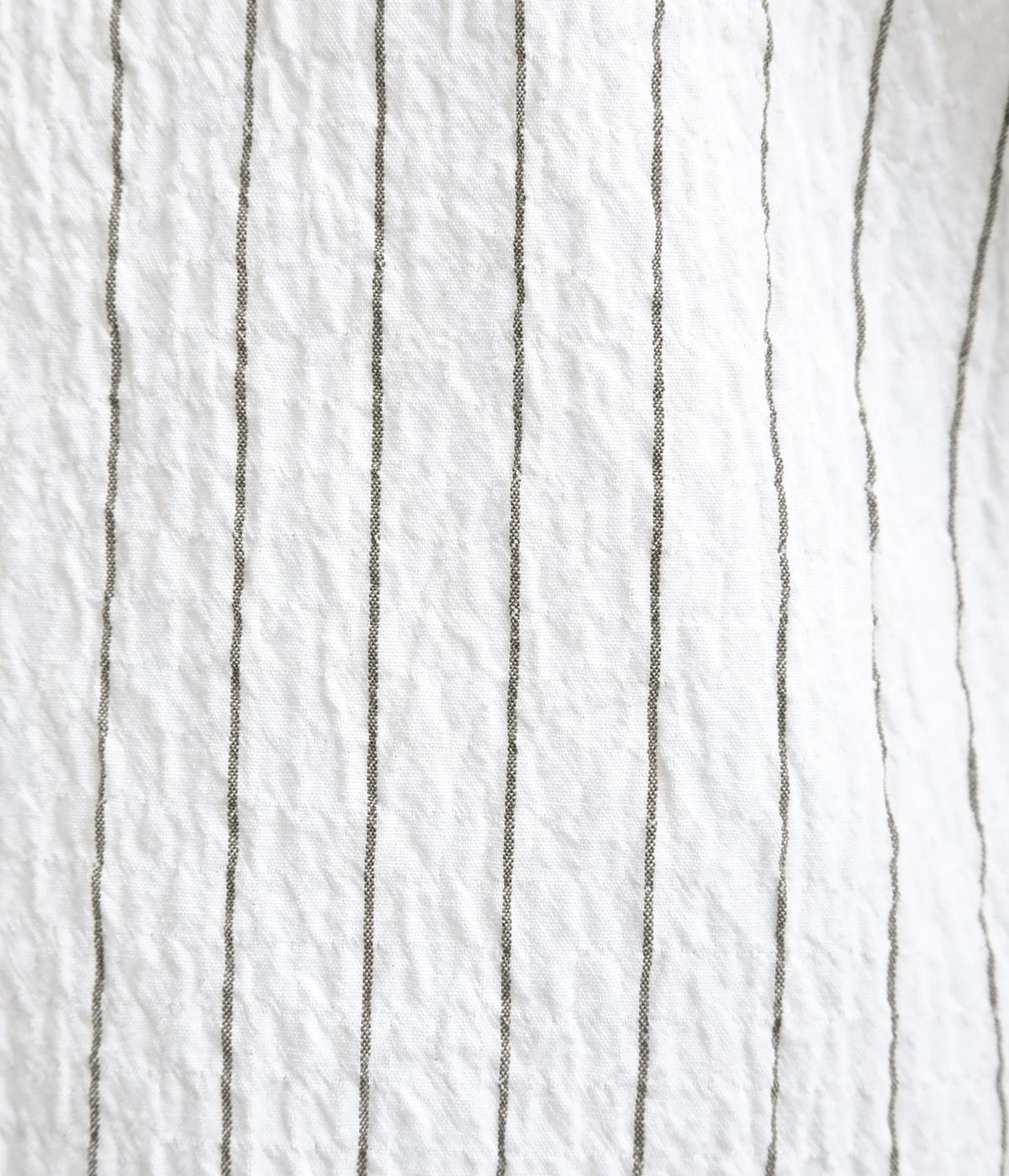 ほどよいコシのある混紡生地を使用しています。軽やかでやわらかな肌ざわりに、伸縮性を備えた快適な着心地です。シャーリングの細やかな凹凸がやさしい表情の素材です。