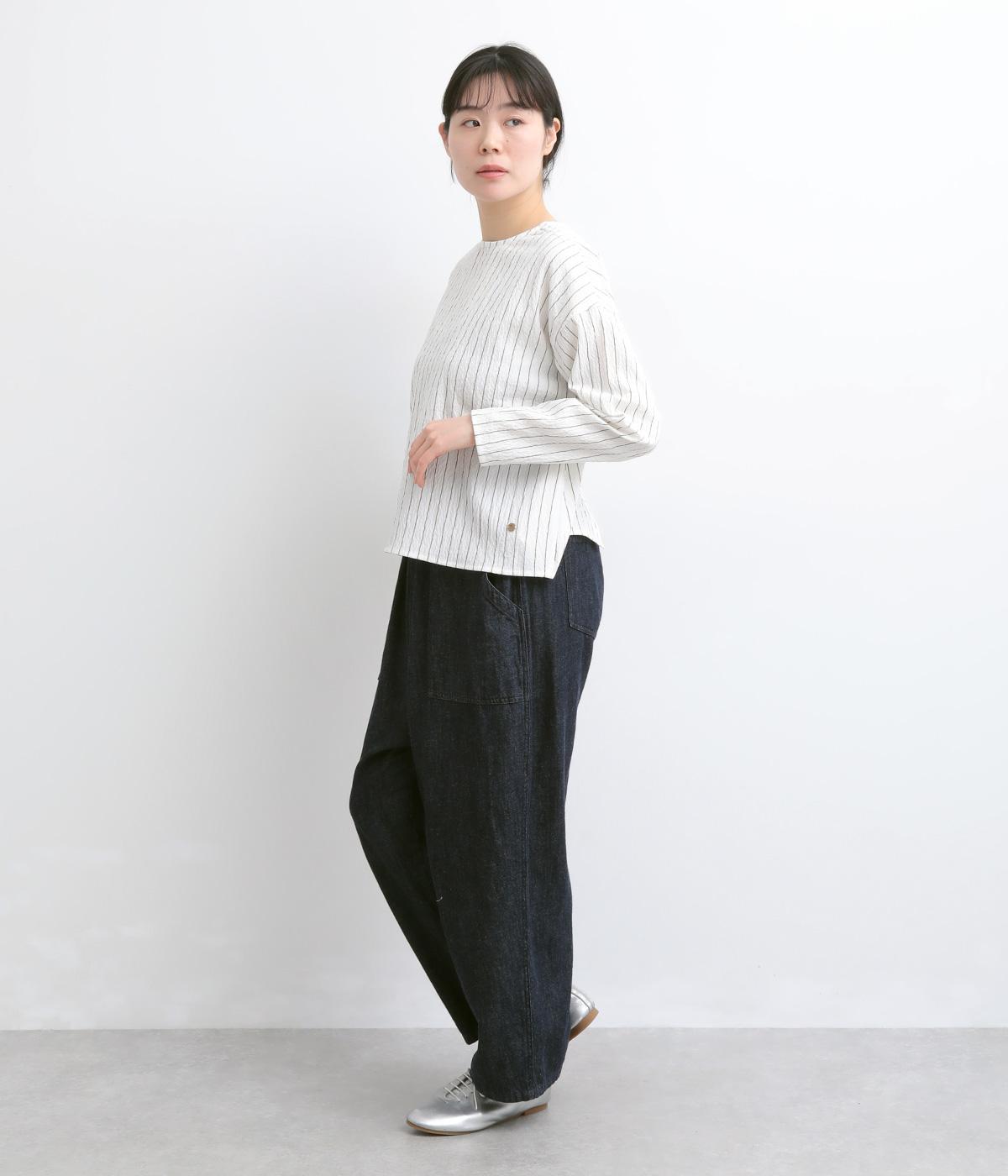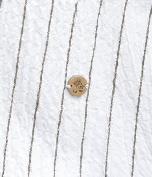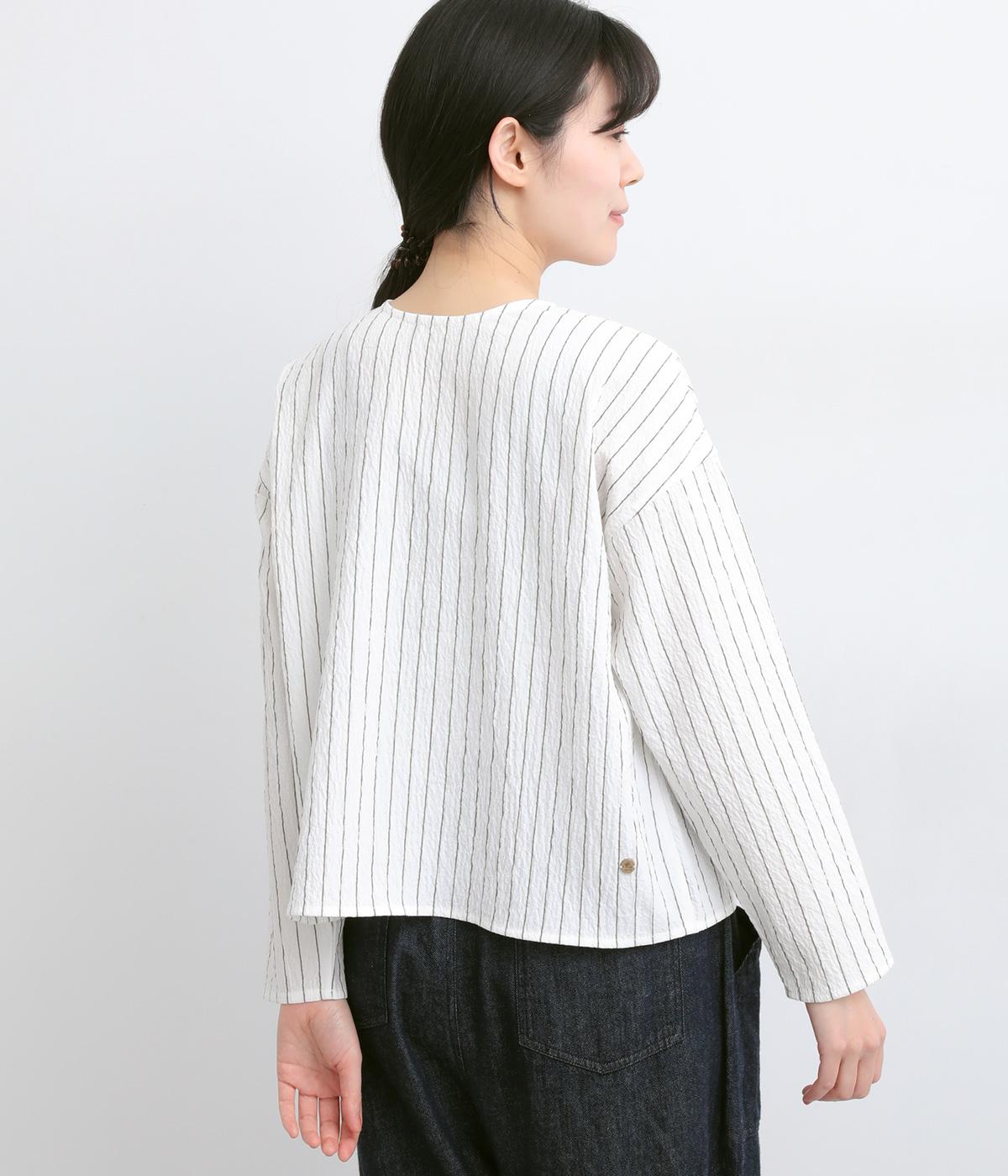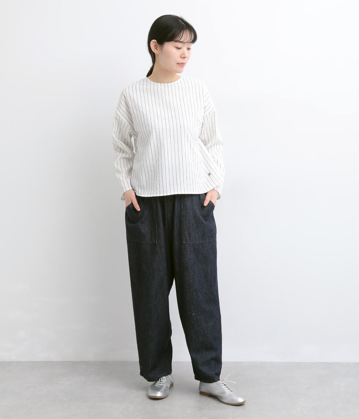 ほどよいコシのある混紡生地を使用しています。軽やかでやわらかな肌ざわりに、伸縮性を備えた快適な着心地です。シャーリングの細やかな凹凸がやさしい表情の素材です。