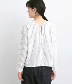 やわらかなシャーリング生地で前後どちらでも着られるブラウスを仕立てました。ふんわりとした素材がナチュラルな雰囲気を引き立てます。季節の花を集めたブーケの彫り柄プレートがさりげないアクセントに。リボンの面は、スプリングホック仕様です。