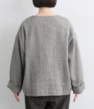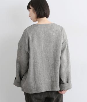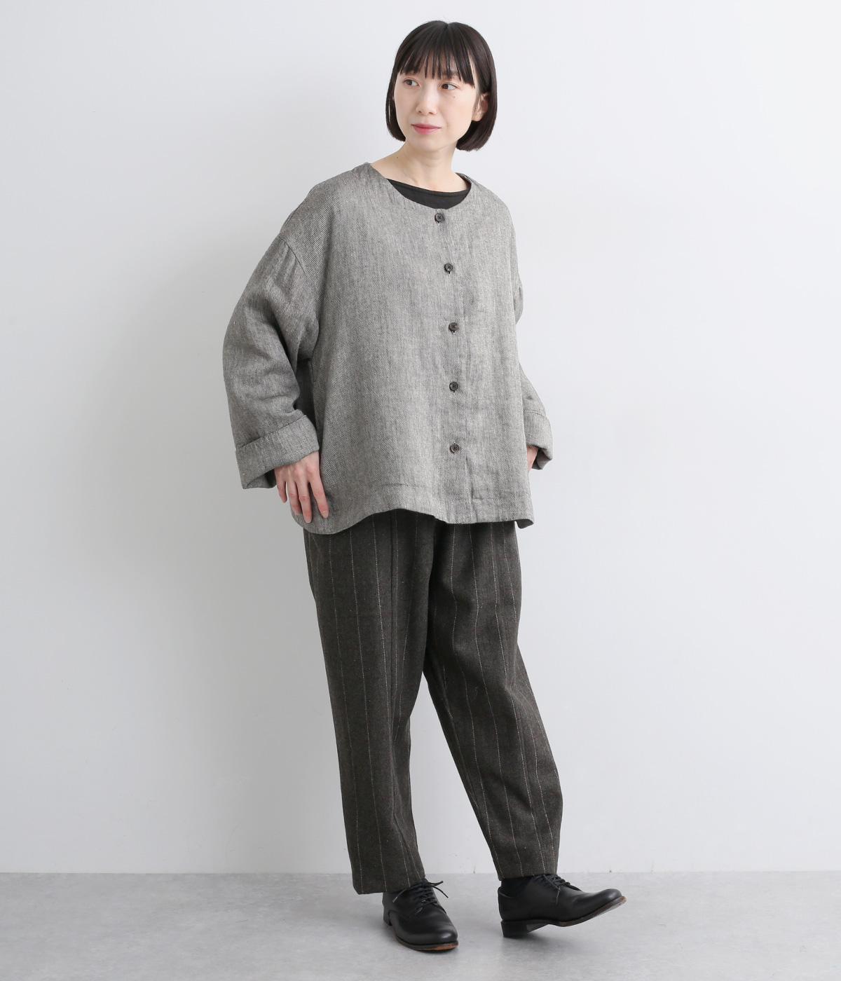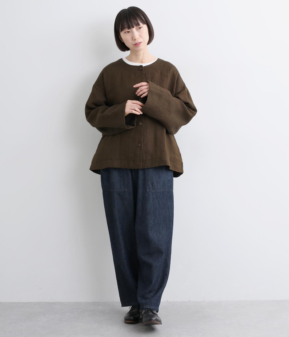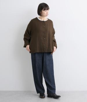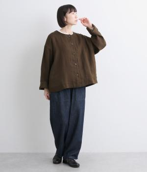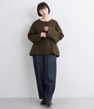 リネンのシャリ感とネップのあるナチュラルな表情が魅力の生地を使用しました。ラフな表情できれいめになり過ぎない雰囲気の素材感に仕上がりました。