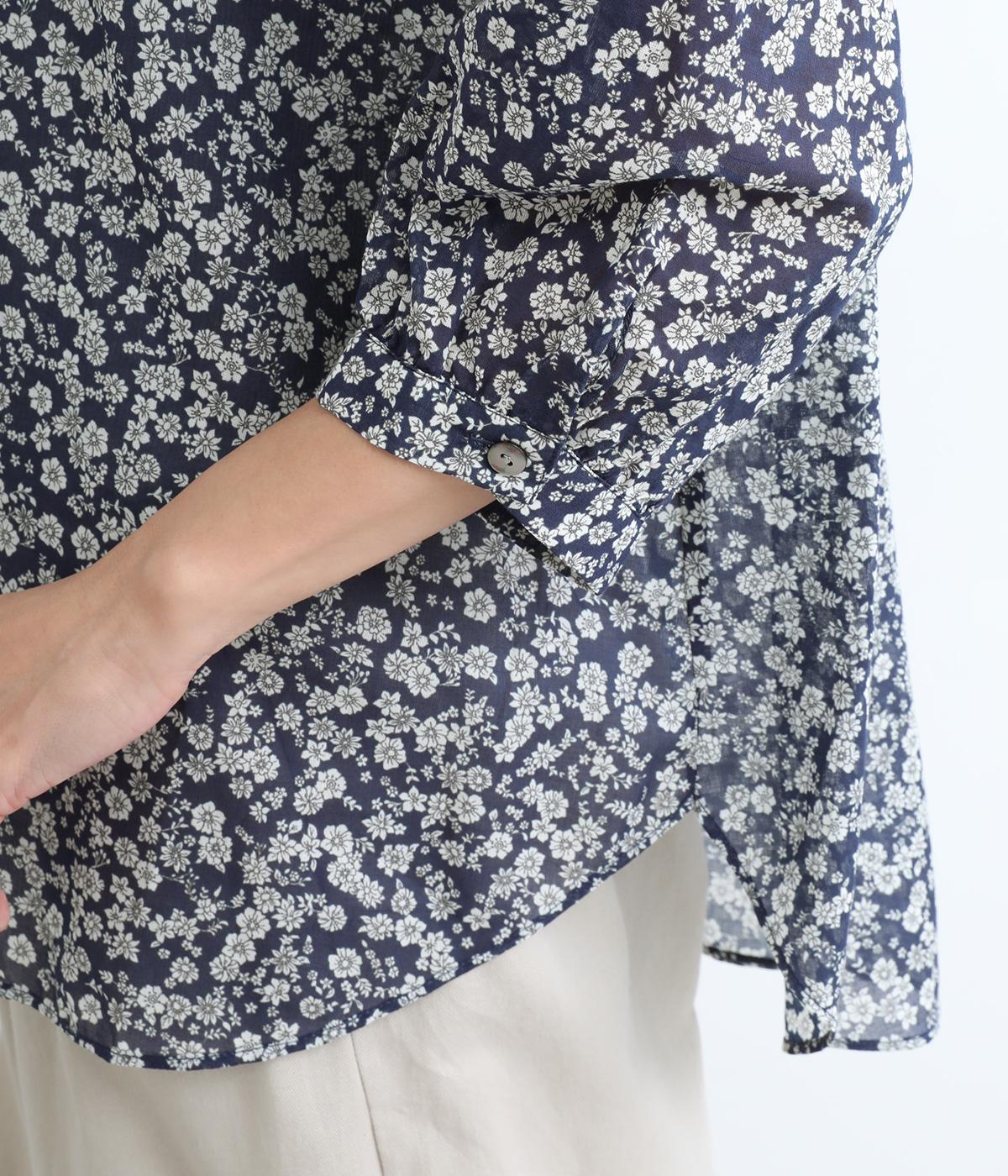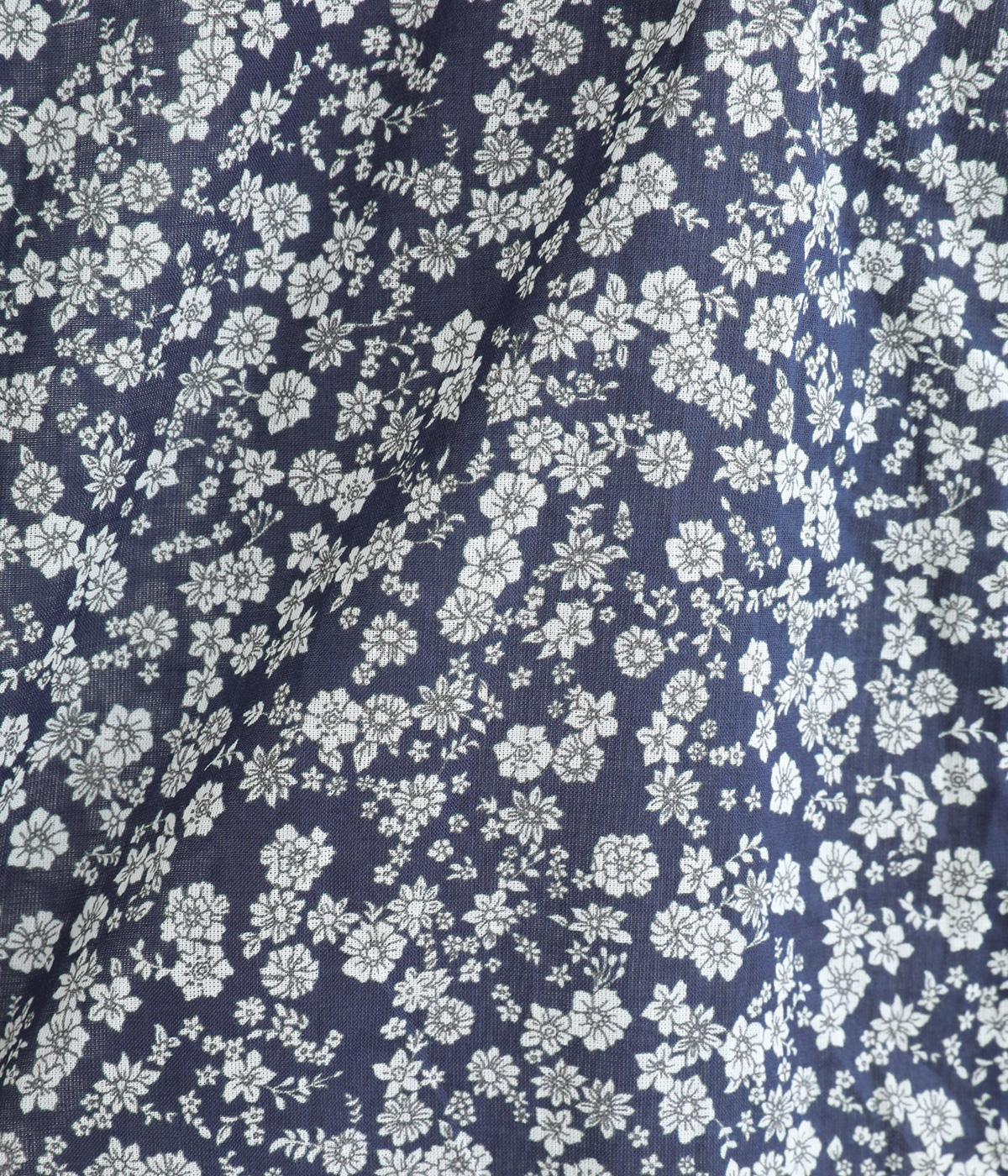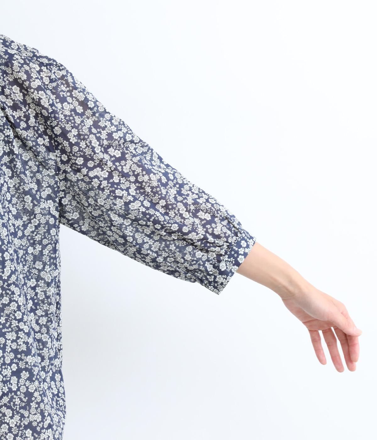 ソフトで肌あたりが良く、繊細さを感じさせる薄手のシアーコットンクロスを使用しています。総柄生地で華やかながらも、透け感のある素材で軽やかな印象に仕上がっています。