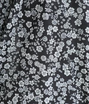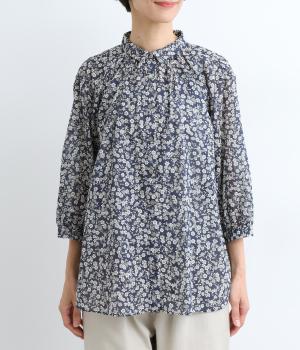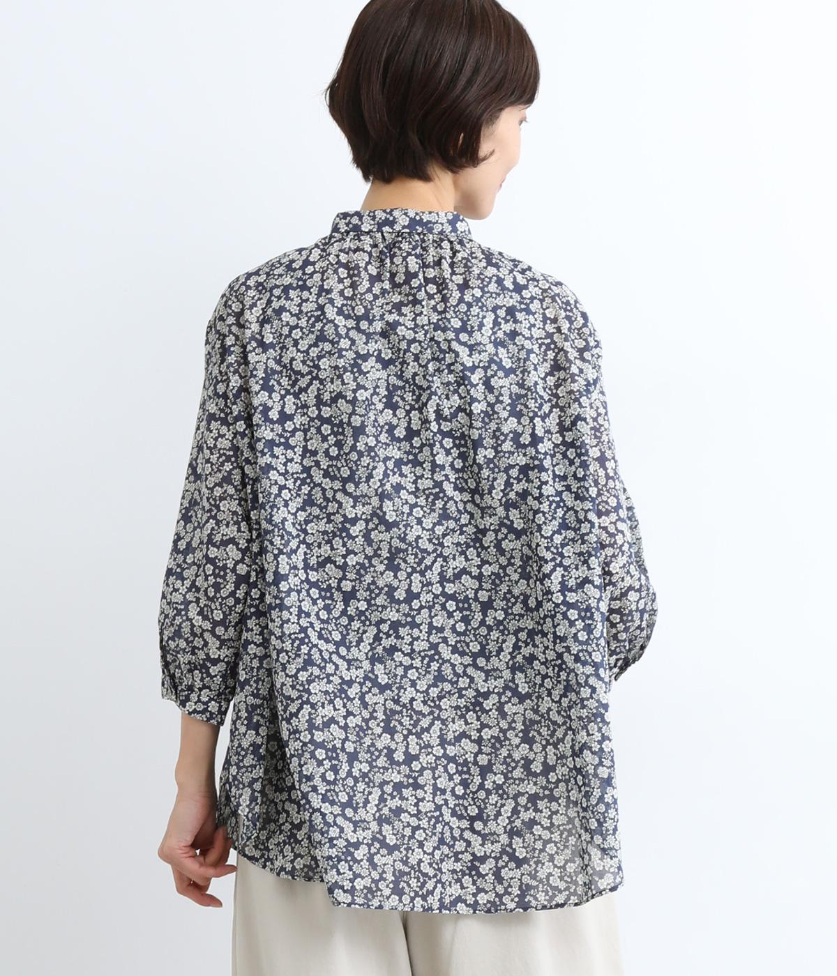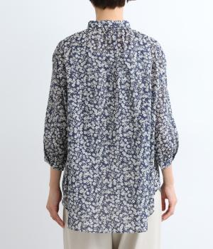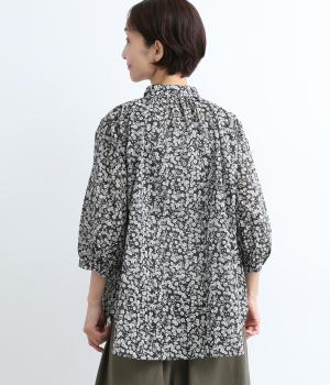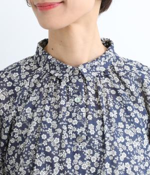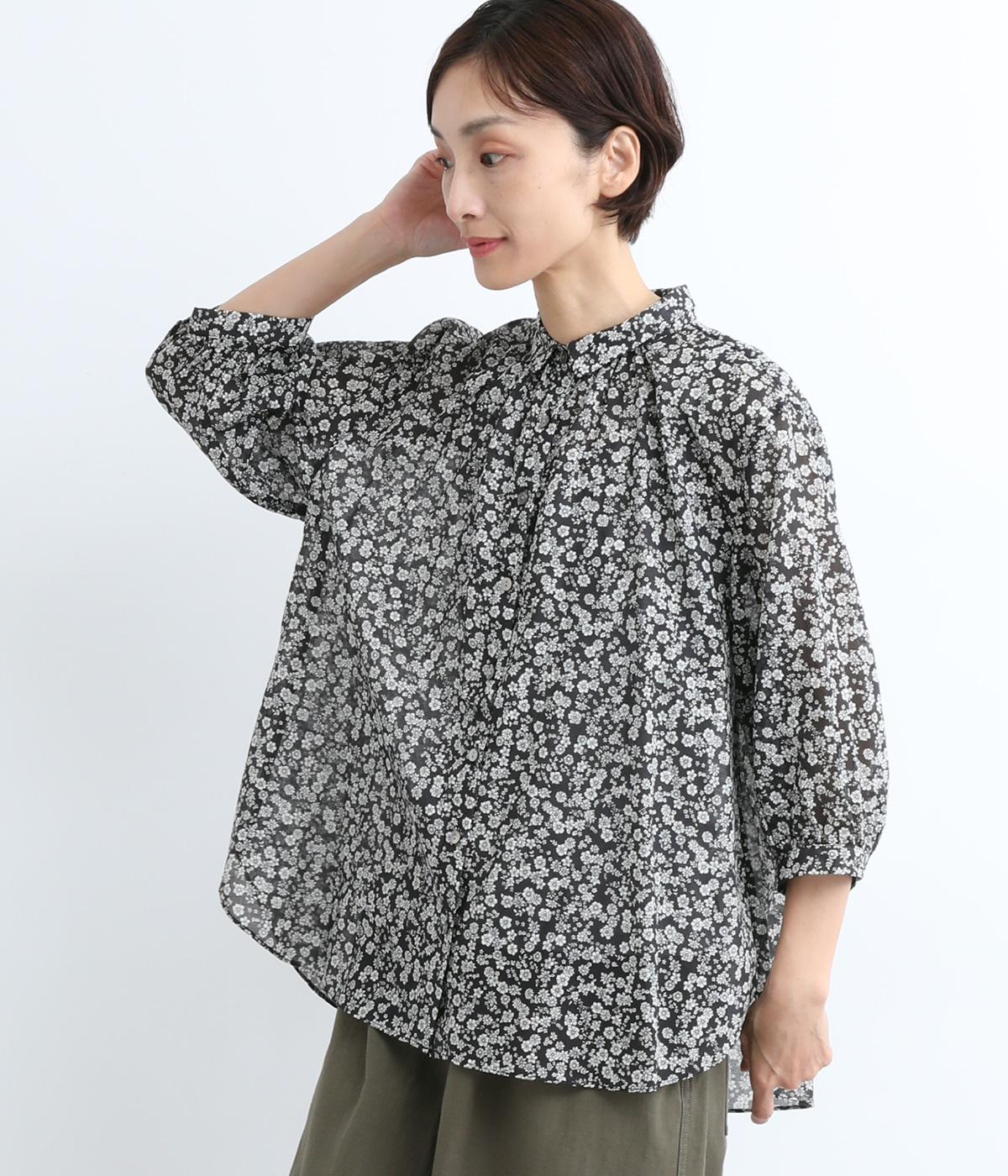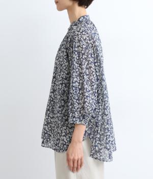 ソフトで肌あたりが良く、繊細さを感じさせる薄手のシアーコットンクロスを使用しています。総柄生地で華やかながらも、透け感のある素材で軽やかな印象に仕上がっています。