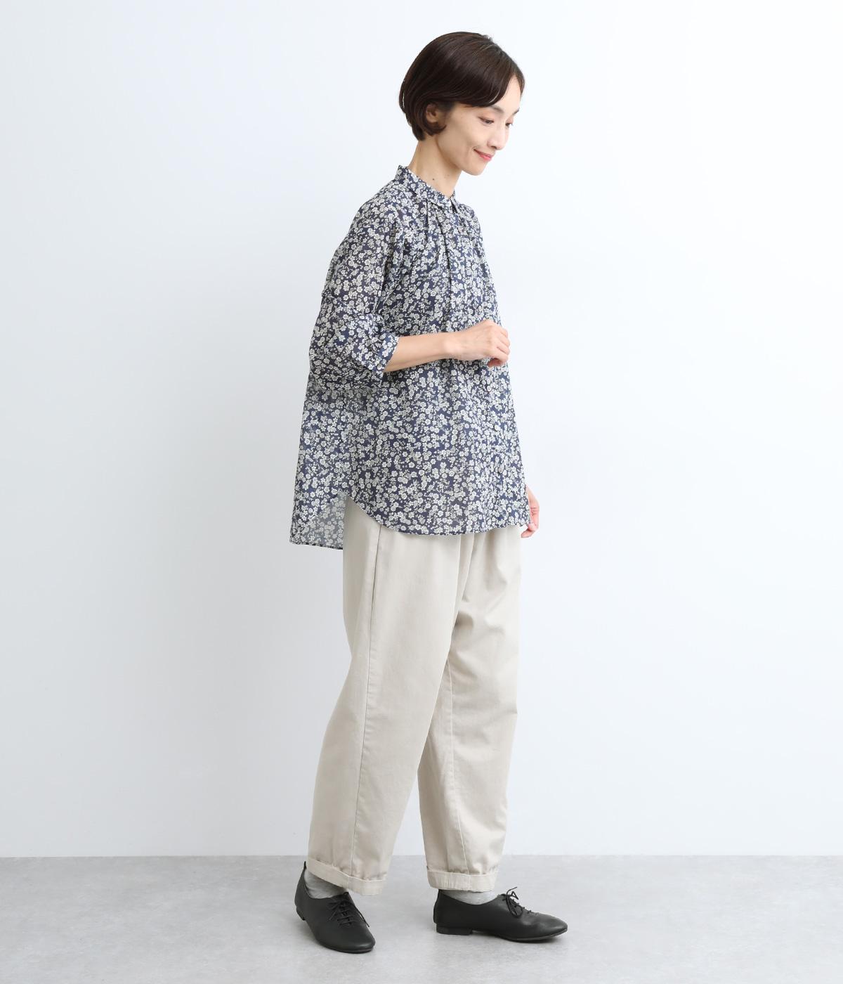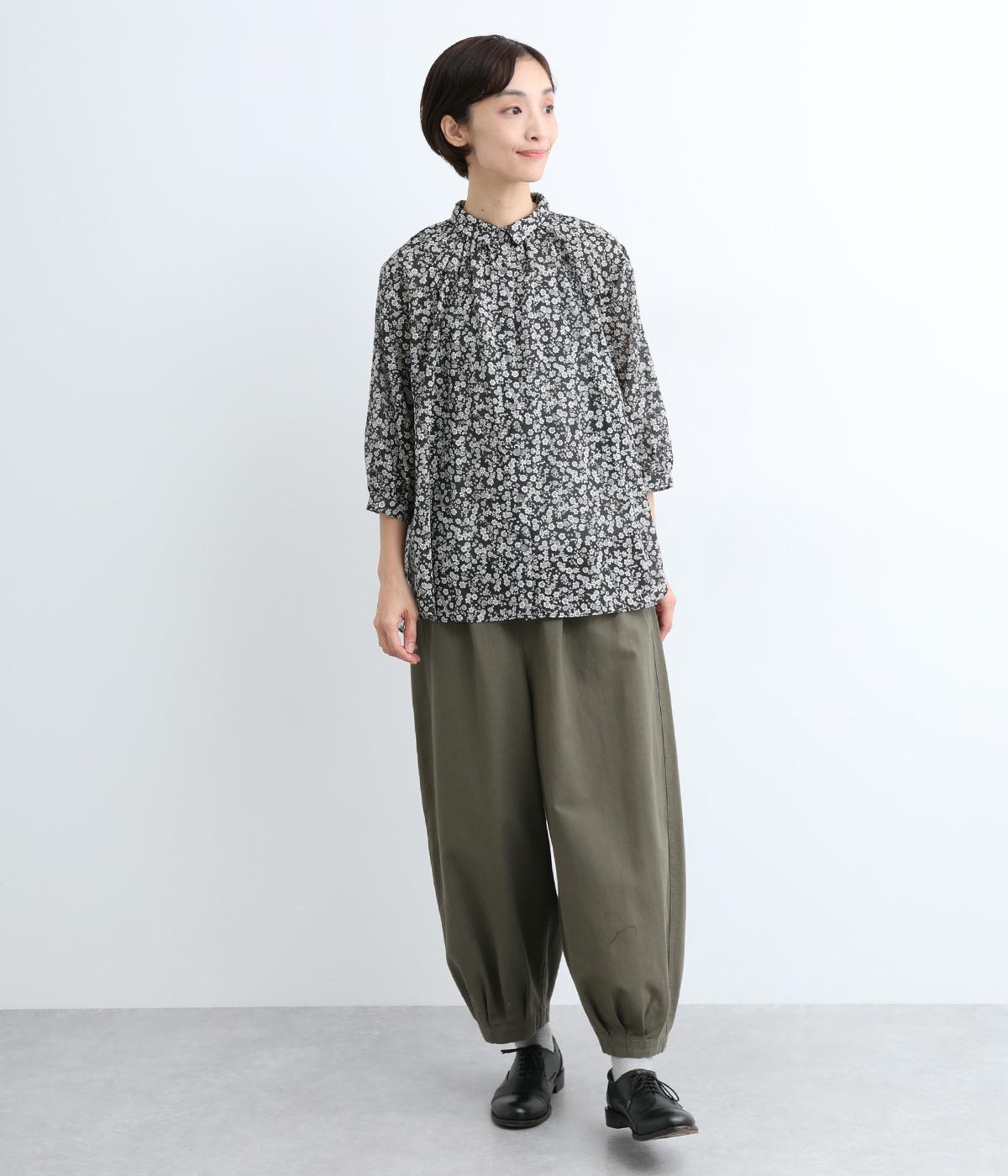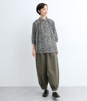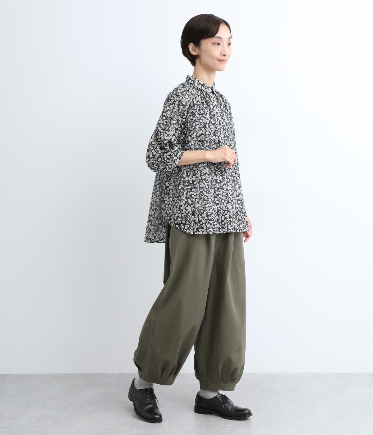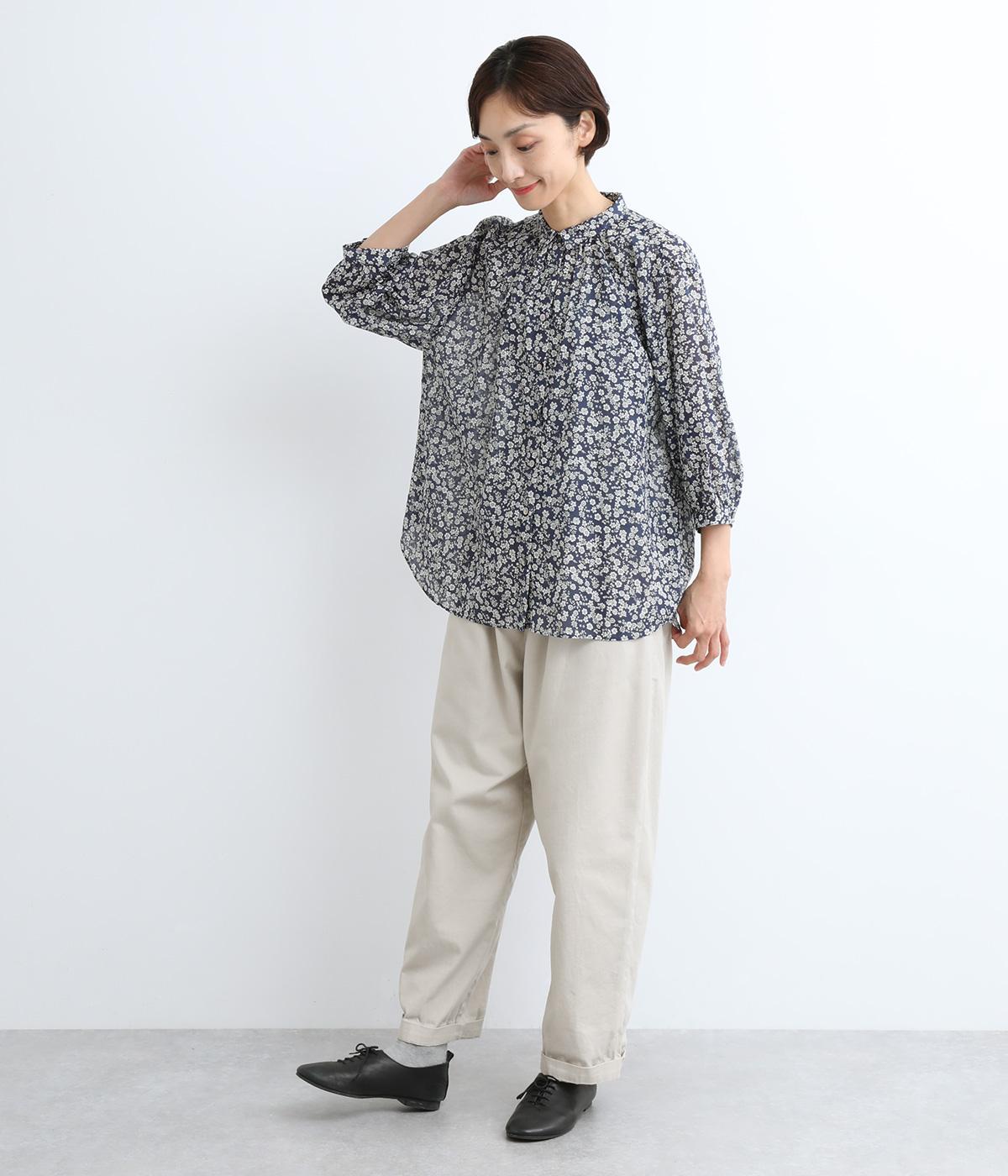 襟繰りのギャザーでシルエットにゆとりを持たせ、ギャザーでふわりとさせた袖が大人のロマンティックを表現。袖カフスや襟つきで適度にメリハリをつけて品よくまとめています。ラウンドヘムでトップスアウトやラフな羽織りスタイルもお洒落見え。