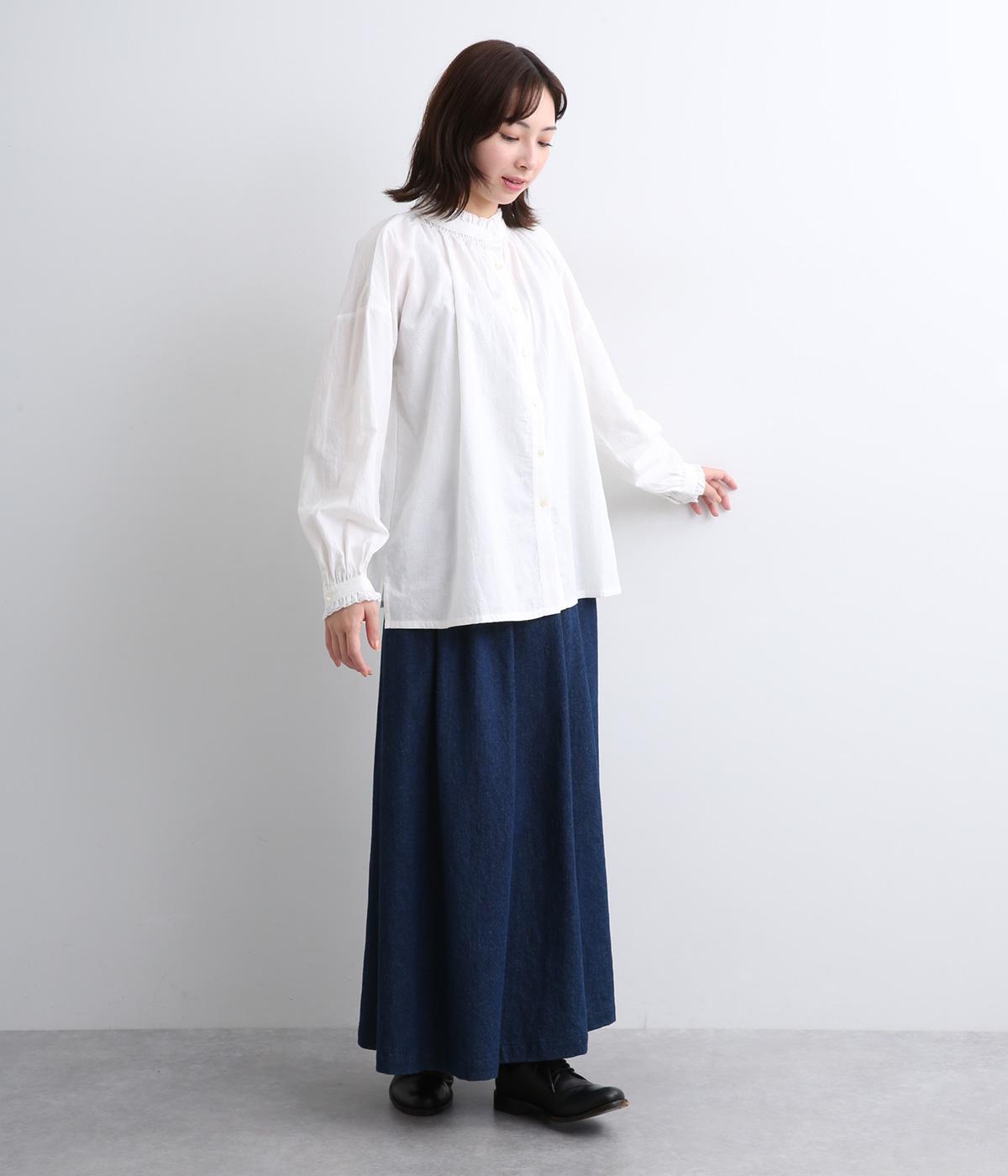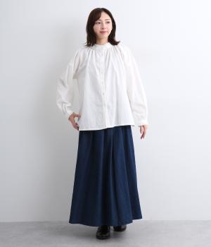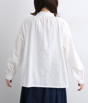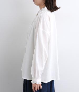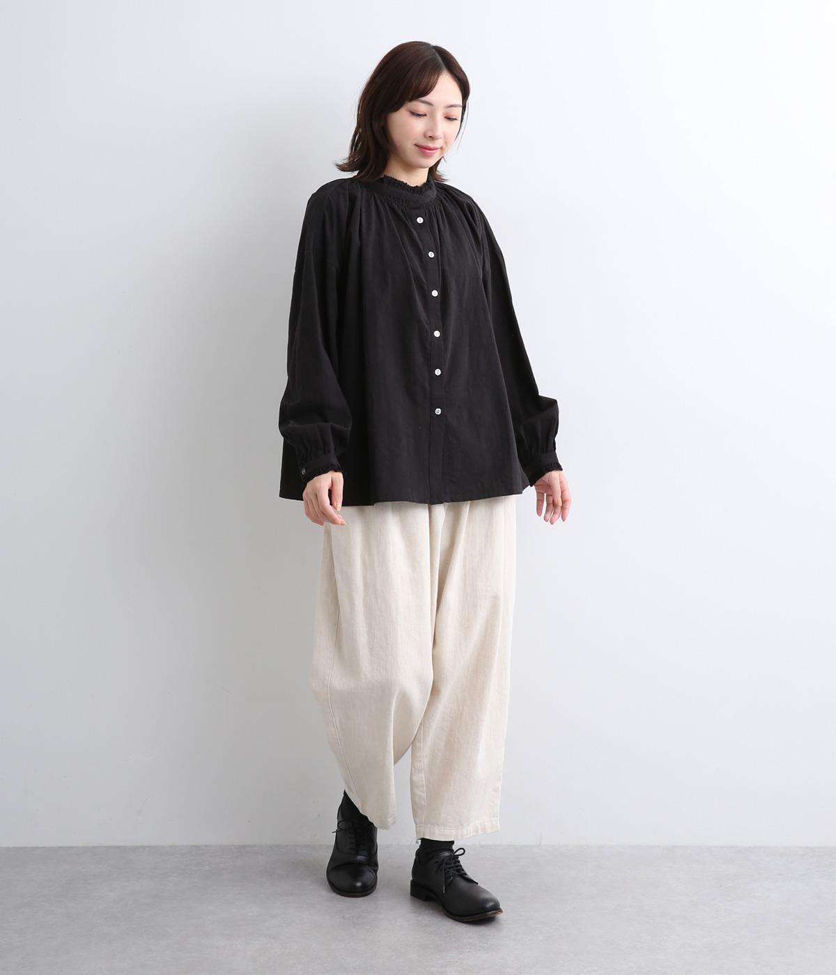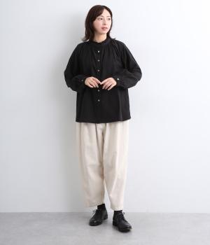 シャーリングの襟や袖がかわいらしい印象のブラウス。首元や袖口にほどこしたたっぷりのギャザーが女性らしい立体感のあるシルエットを描きます。きちんと見えしつつ、ゆったりした身幅でリラクシーな着心地を叶えます。