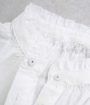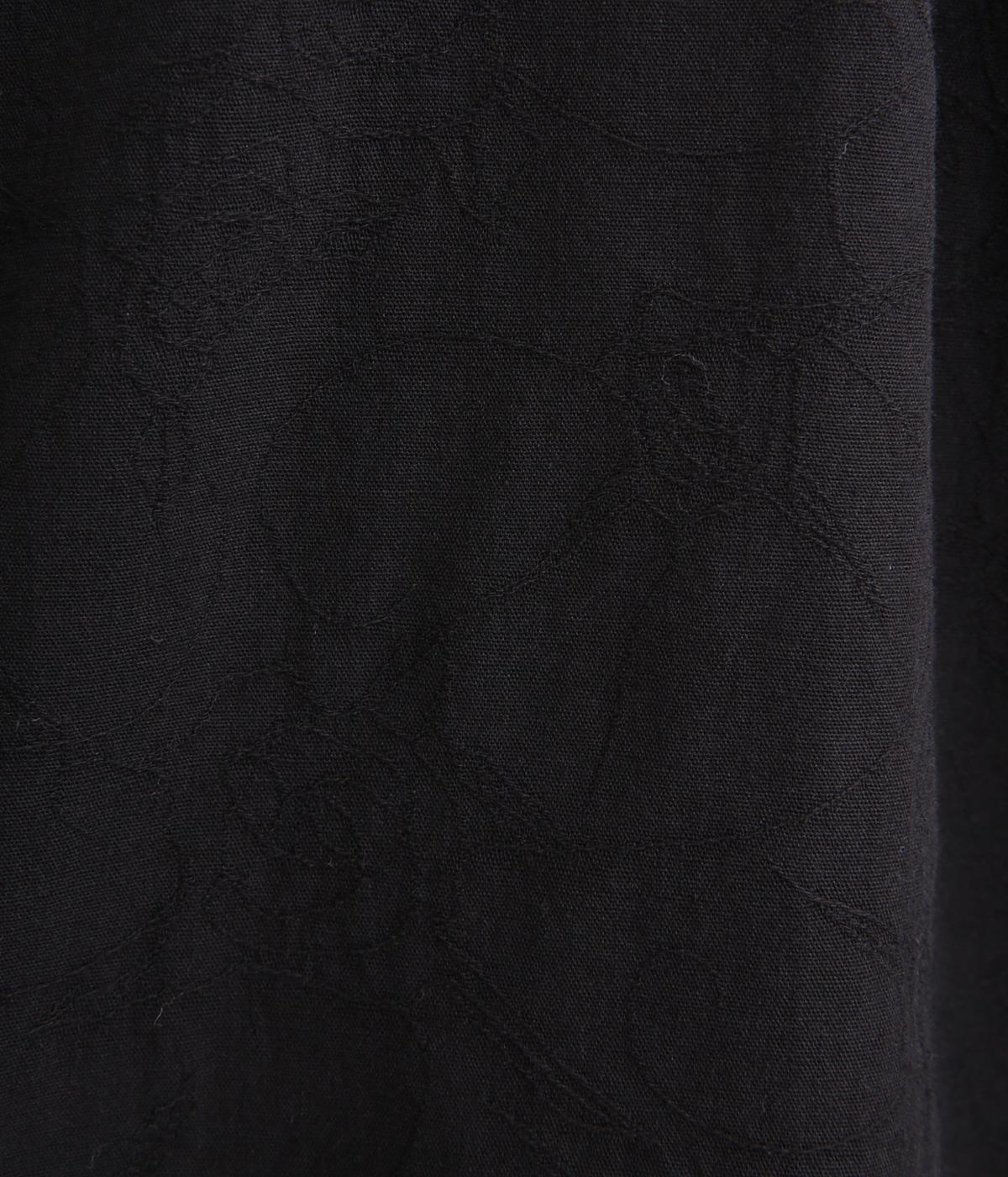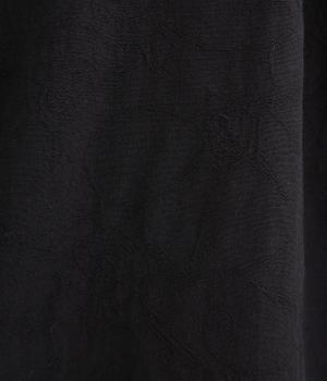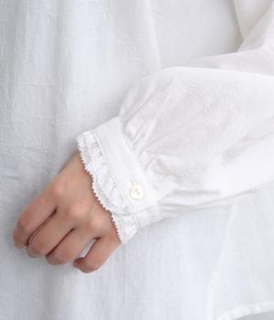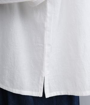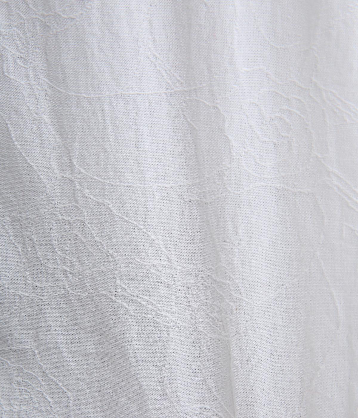 さりげない花柄を織り込んだジャカード生地です。首元のフリルもあたりがやわらかく、ドライでさらりとした着心地です。立体感のある表面がエレガントな雰囲気を演出します。