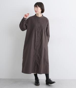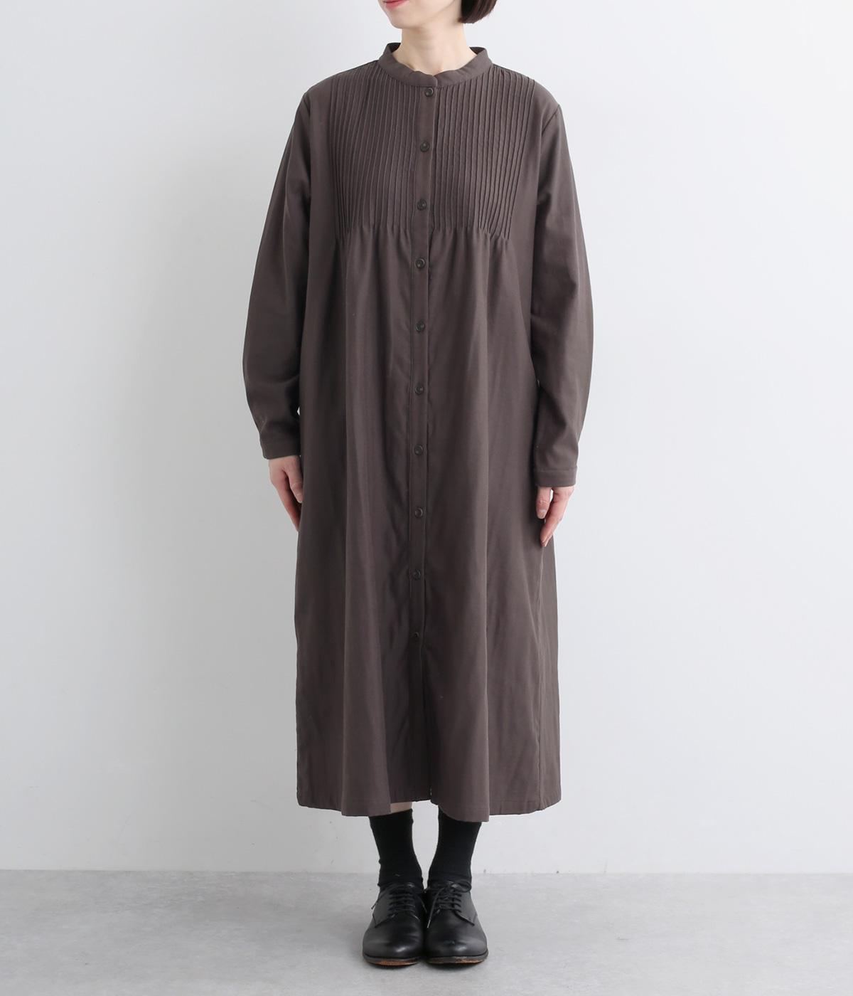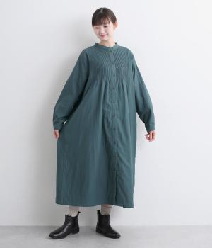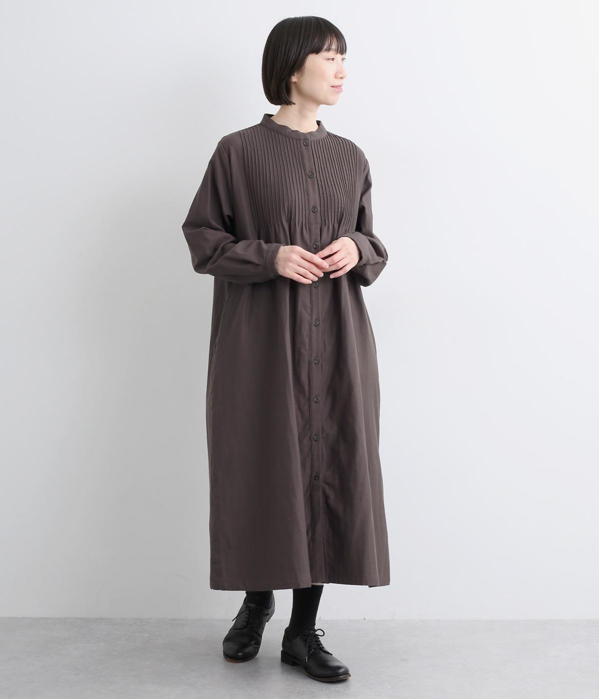 フロントにたっぷりピンタックをあしらったワンピース。前開きのふんわりしたシルエットで、ボタンをあけてコートのように羽織るのもおすすめです。バンドカラーで首元はすっきりと。タートルネックやマフラーなどとも合わせやすく仕上げました。