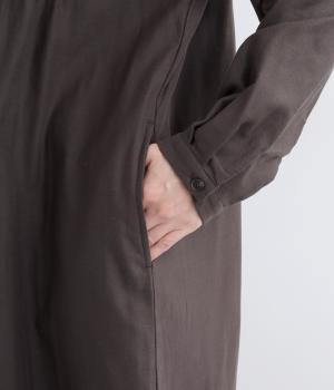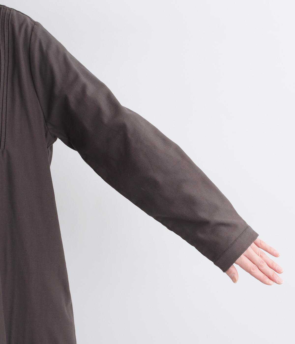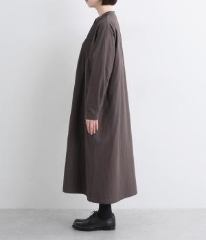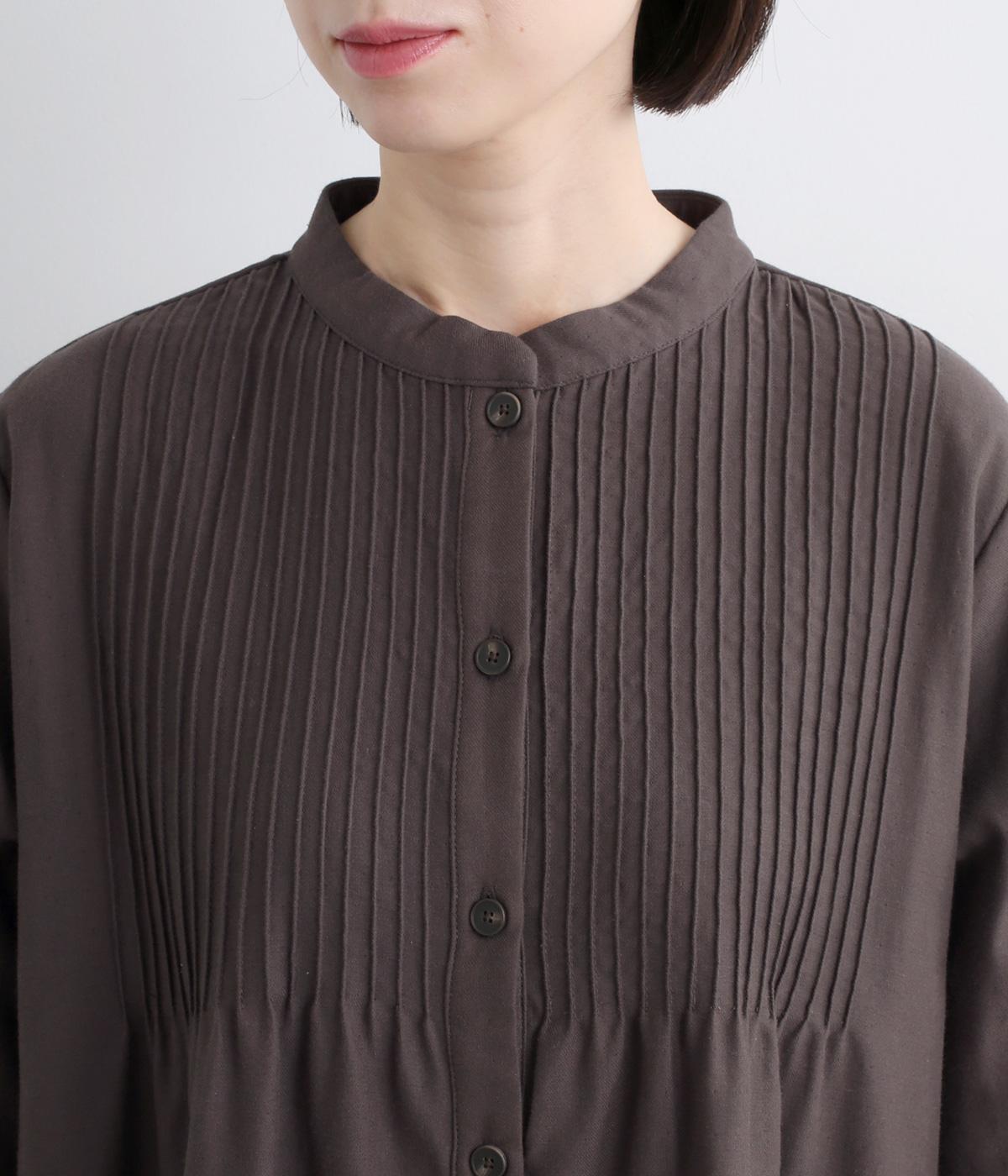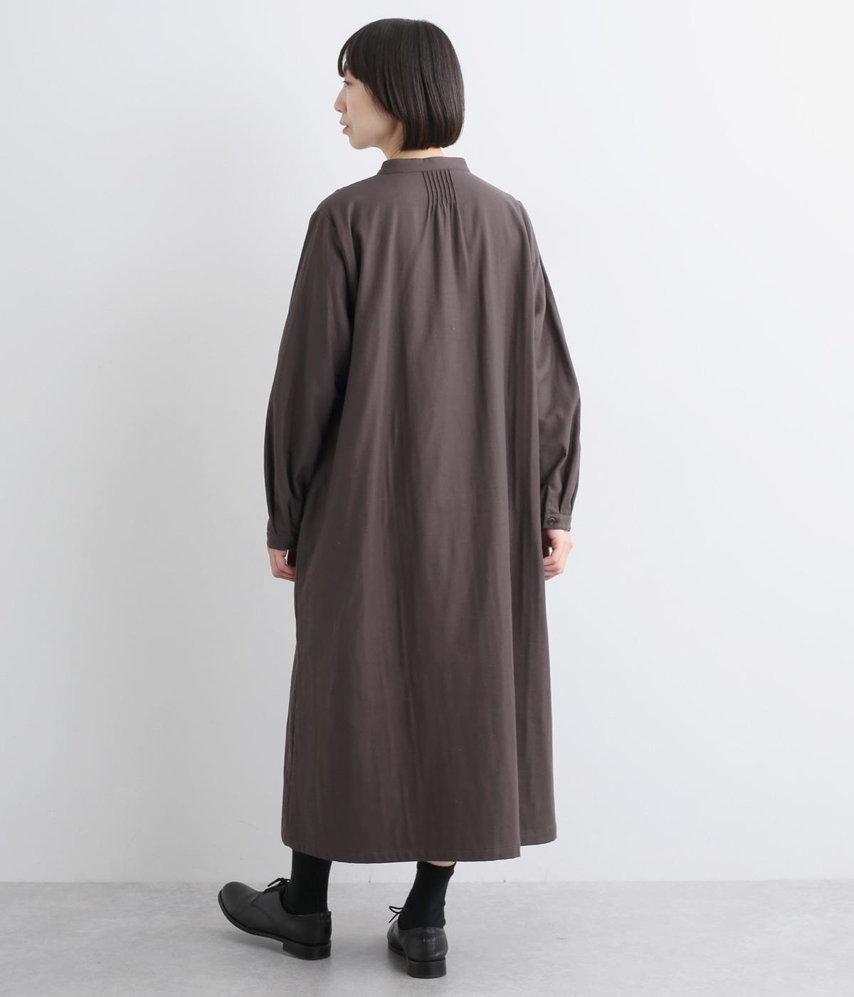 フロントにたっぷりピンタックをあしらったワンピース。前開きのふんわりしたシルエットで、ボタンをあけてコートのように羽織るのもおすすめです。バンドカラーで首元はすっきりと。タートルネックやマフラーなどとも合わせやすく仕上げました。