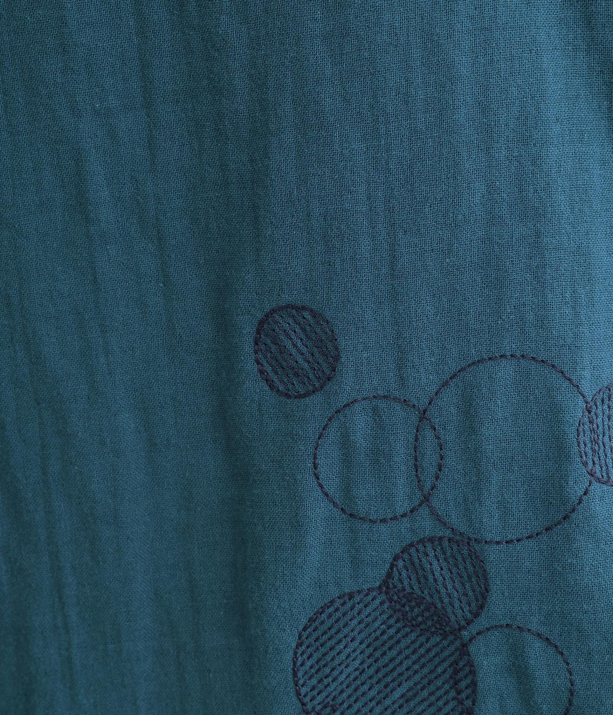 襟ぐりと背ヨーク下のギャザーが自然な落ち感を生み、きれいなシルエットをつくります。同系色でさりげなくあしらったドット刺しゅうがかわいらしいポイント。ドロップショルダーのゆったりとしたシルエットで、リラックスした着心地です。