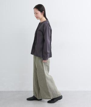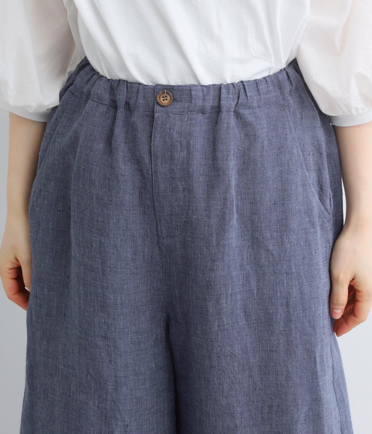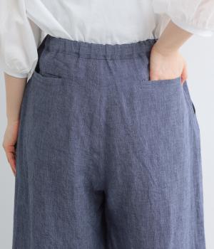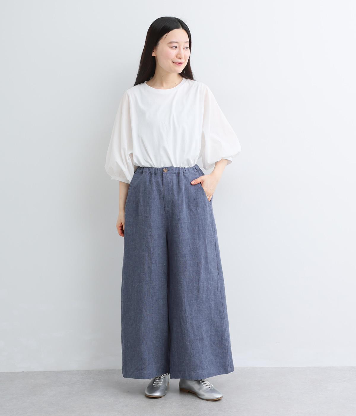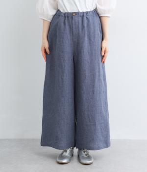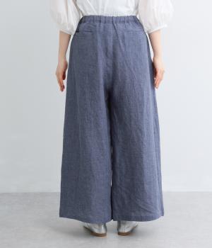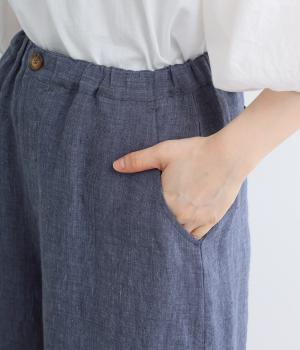ナチュラルな素材感を活かし、ゆったりワイドに仕上げました。リラックスムードが心地よく、自然な落ち感のある生地でこなれた雰囲気に。ウエストはぐるりとゴム&調整紐を入れたイージー仕様。前あきなので脱ぎはきもスムーズです。