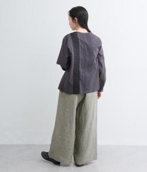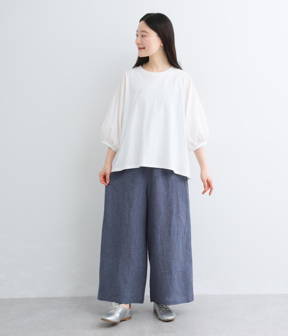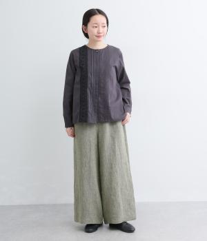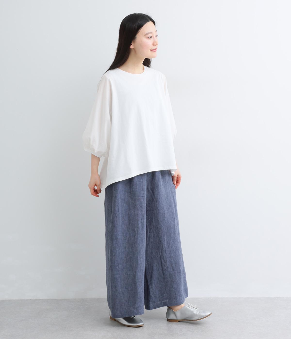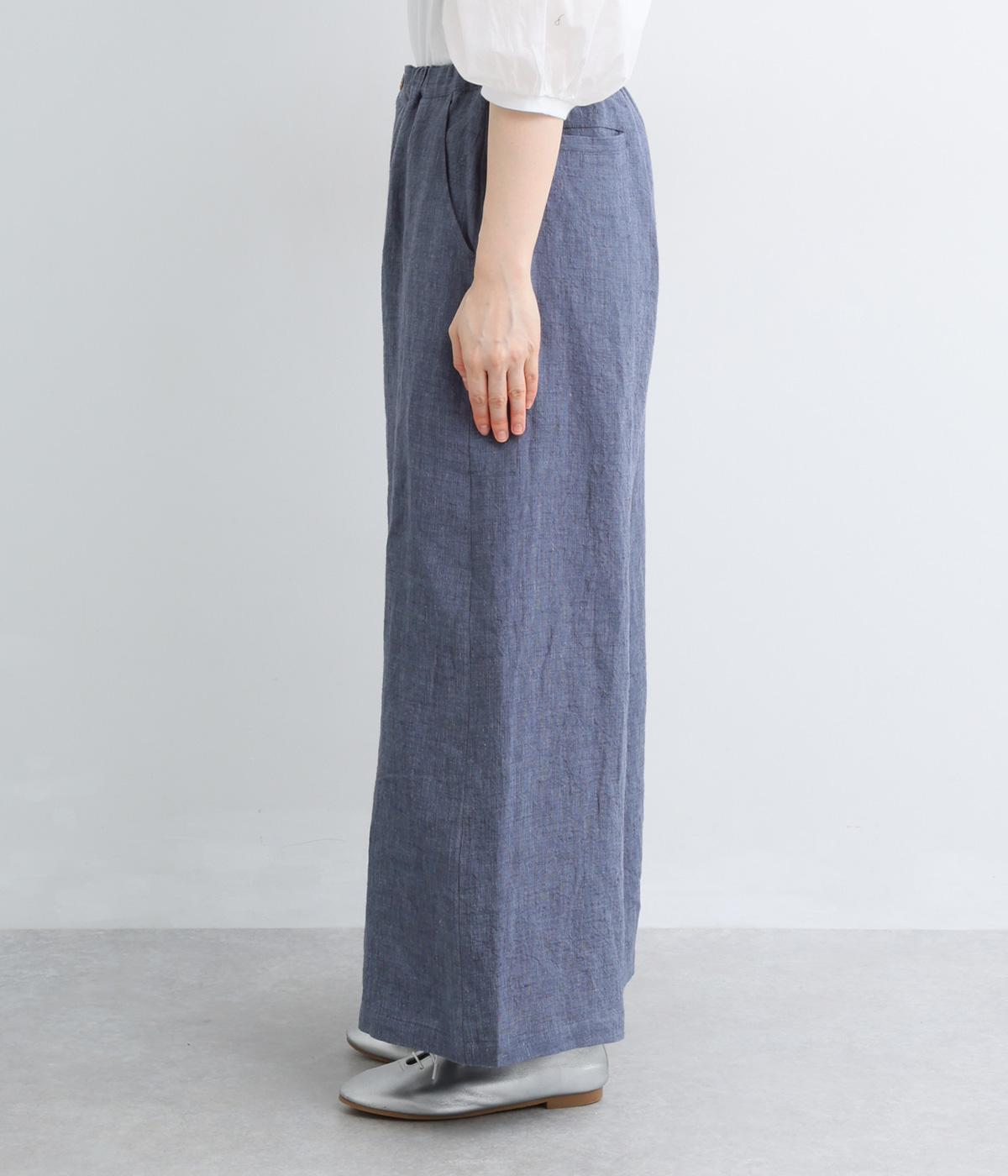 ナチュラルな素材感を活かし、ゆったりワイドに仕上げました。リラックスムードが心地よく、自然な落ち感のある生地でこなれた雰囲気に。ウエストはぐるりとゴム&調整紐を入れたイージー仕様。前あきなので脱ぎはきもスムーズです。