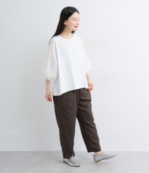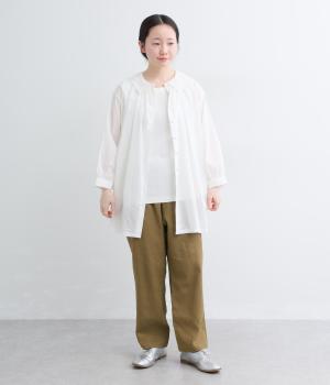 さらりとした涼し気な肌触りに凹凸のある表面感が特徴のブッチャー素材で仕立てました。綿麻混でナチュラル感があり、裏地は綿を使用しているので肌あたりも◎。