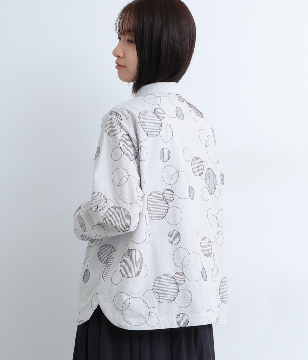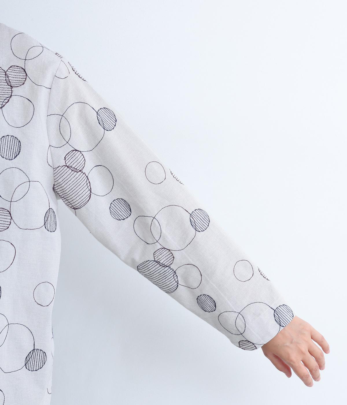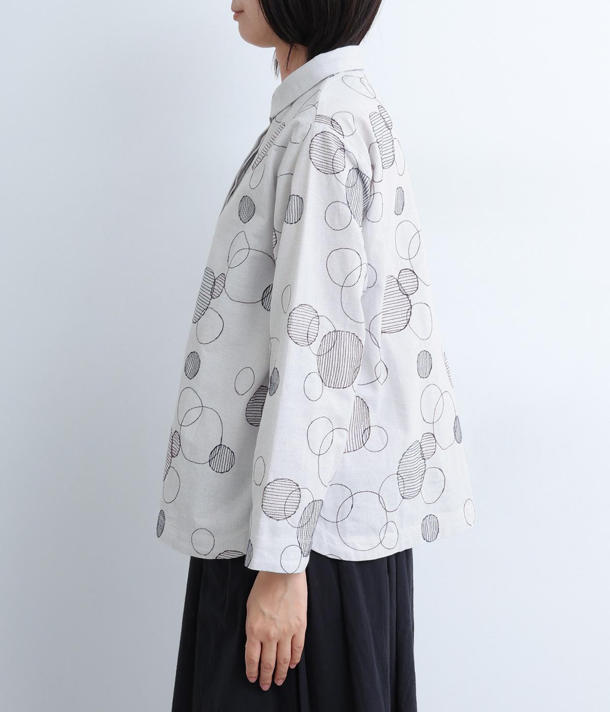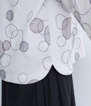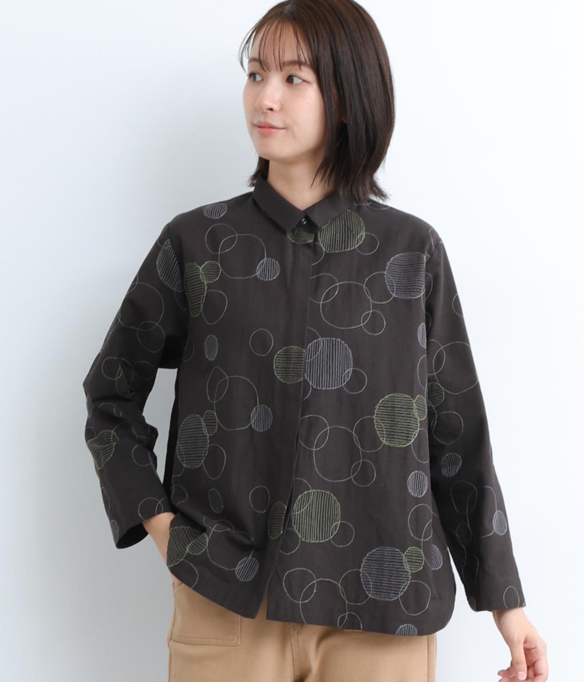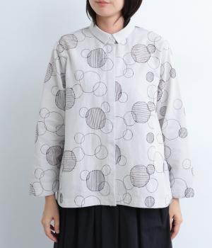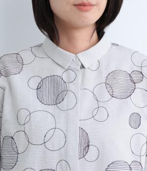 個性的なドット刺しゅうが目をひくブラウスです。きちんと感のある襟と、比翼仕立ての前立てですっきり見えます。丸みのある袖口と裾がかわいらしさを演出します。ディテールにもこだわりの詰まった一枚です。