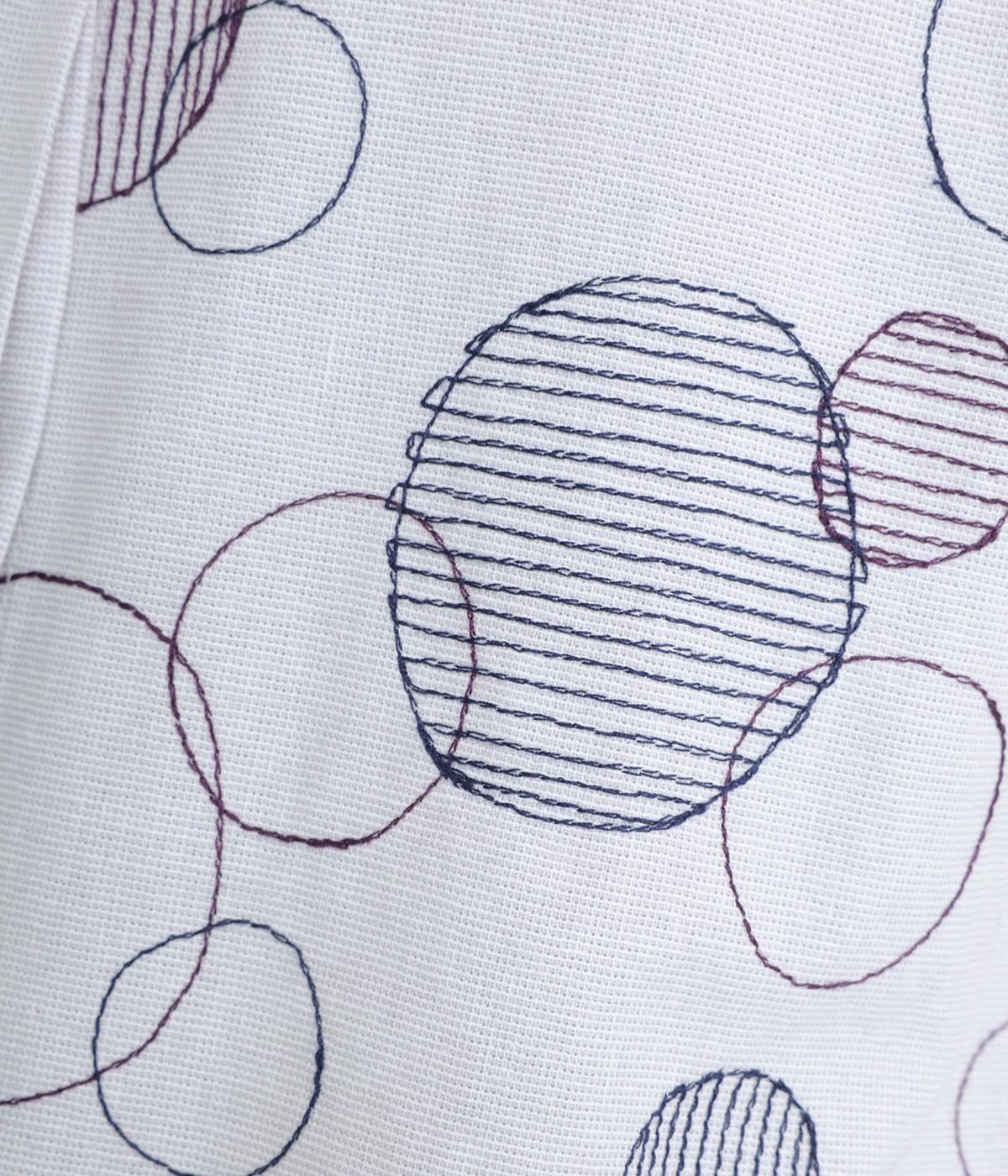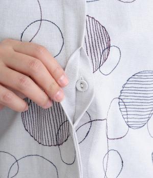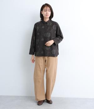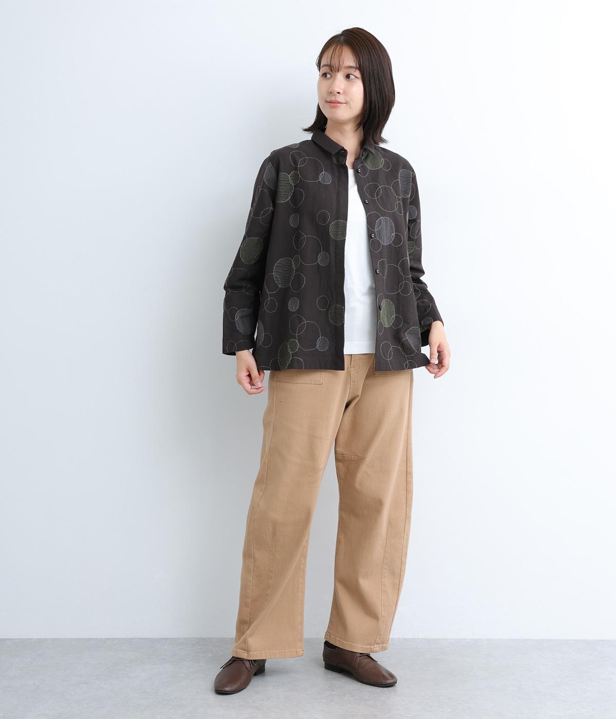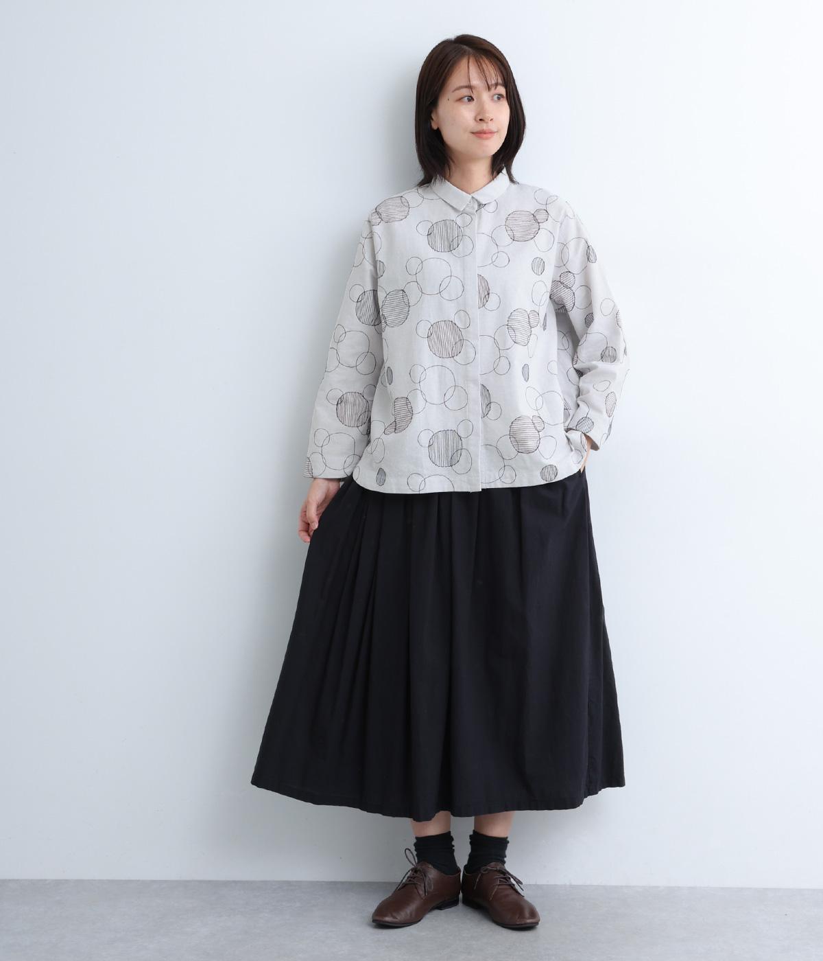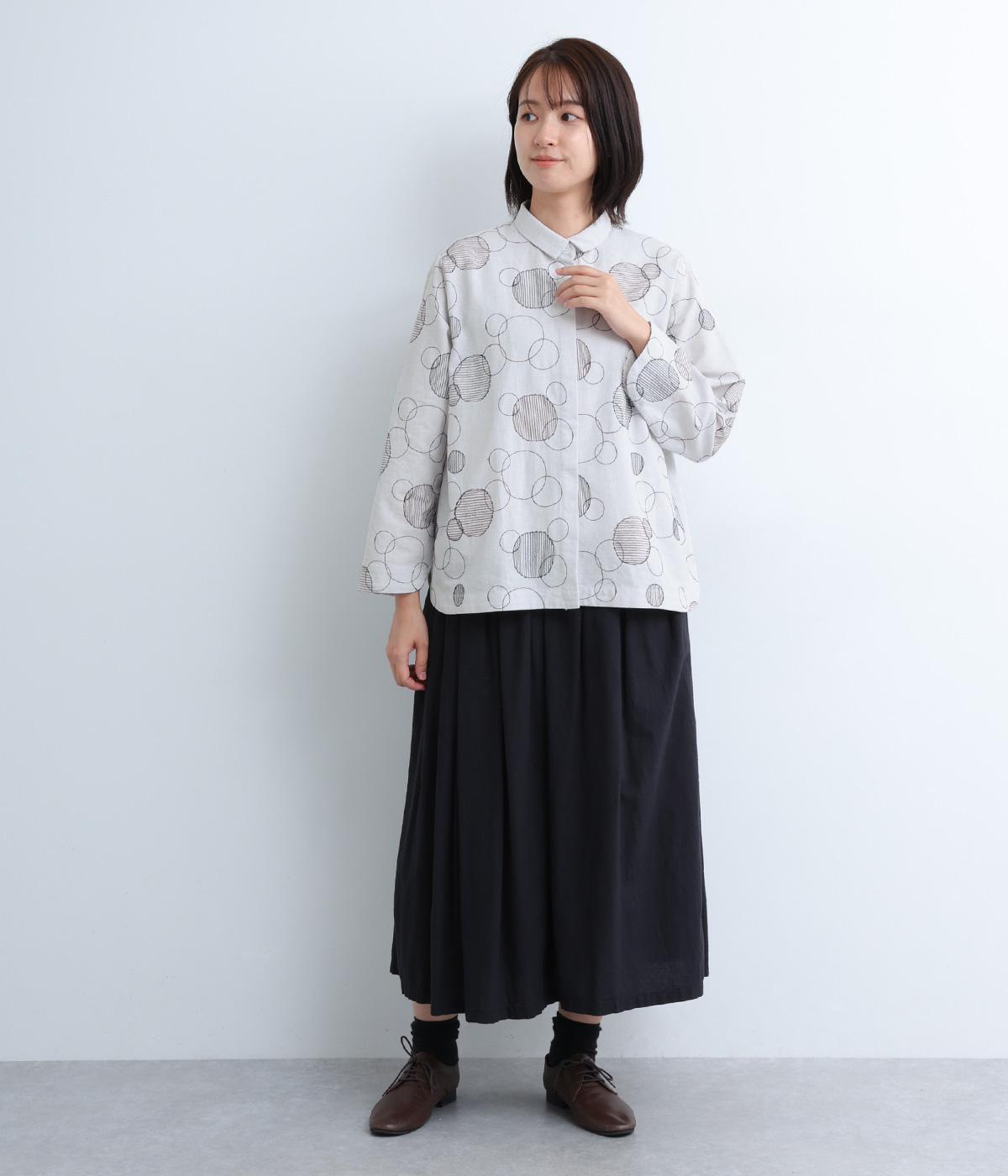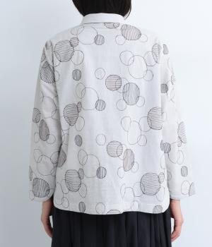 個性的なドット刺しゅうが目をひくブラウスです。きちんと感のある襟と、比翼仕立ての前立てですっきり見えます。丸みのある袖口と裾がかわいらしさを演出します。ディテールにもこだわりの詰まった一枚です。