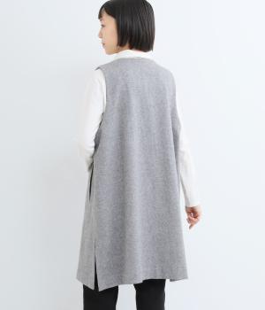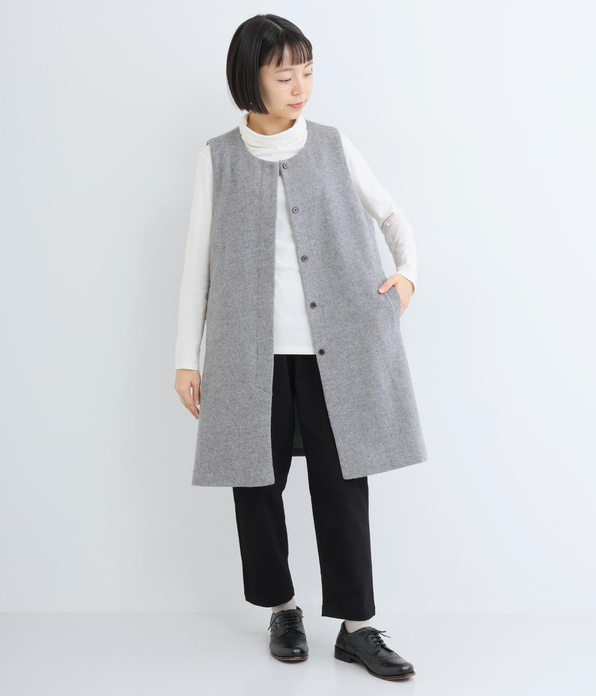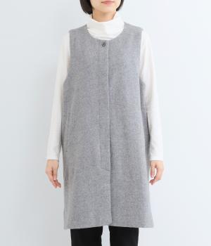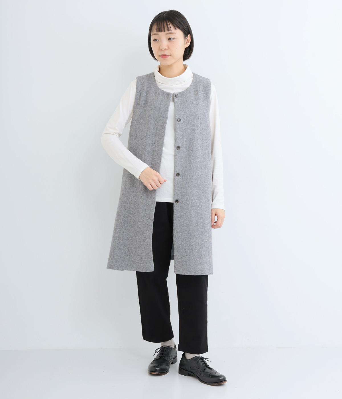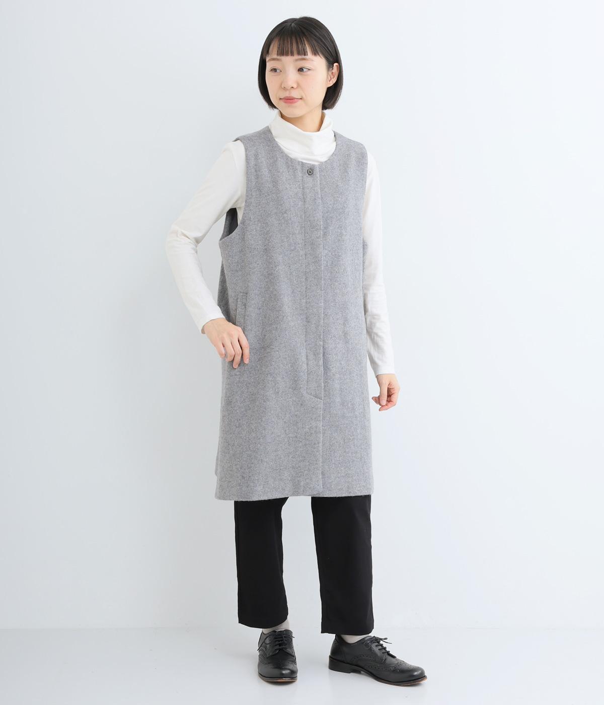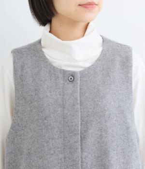 品のある起毛生地が季節感を感じさせてくれるロングベスト。サイドスリットや比翼仕立てなど、さりげないこだわりのデザインがこなれた印象を与えてくれます。フロントのボタンはいちばん上だけとめると、さらにセンスよく着こなせます。