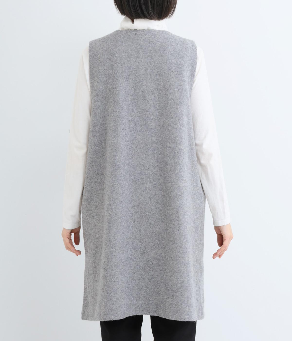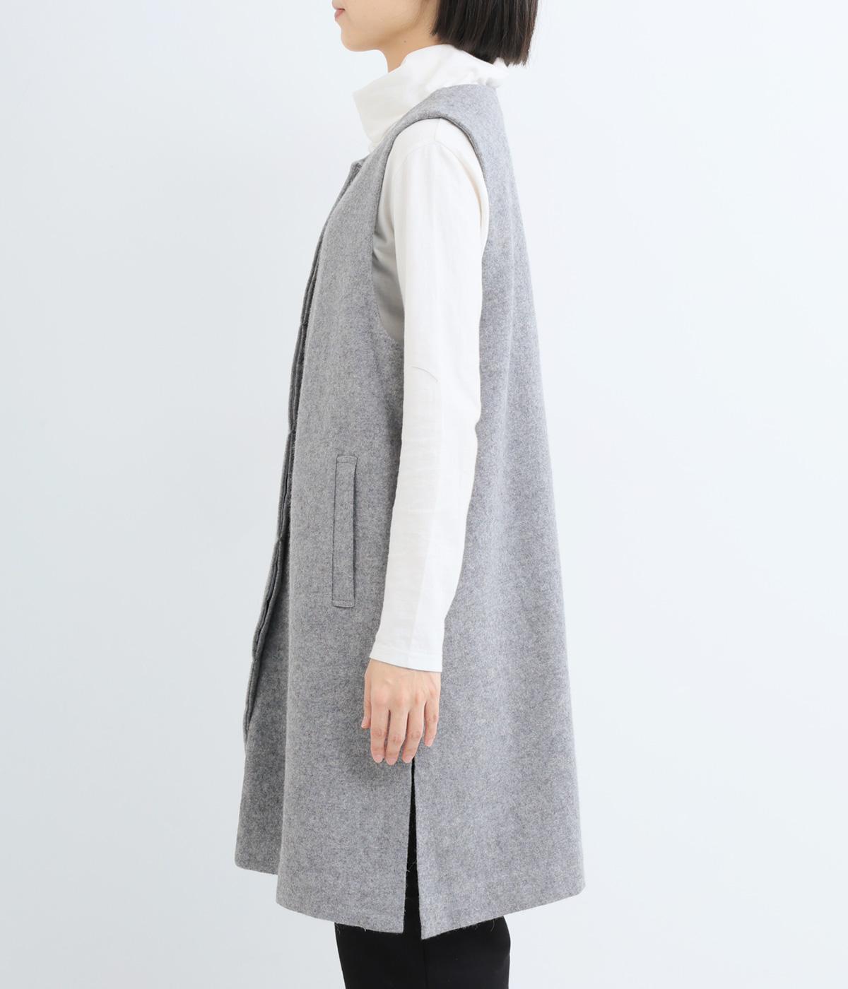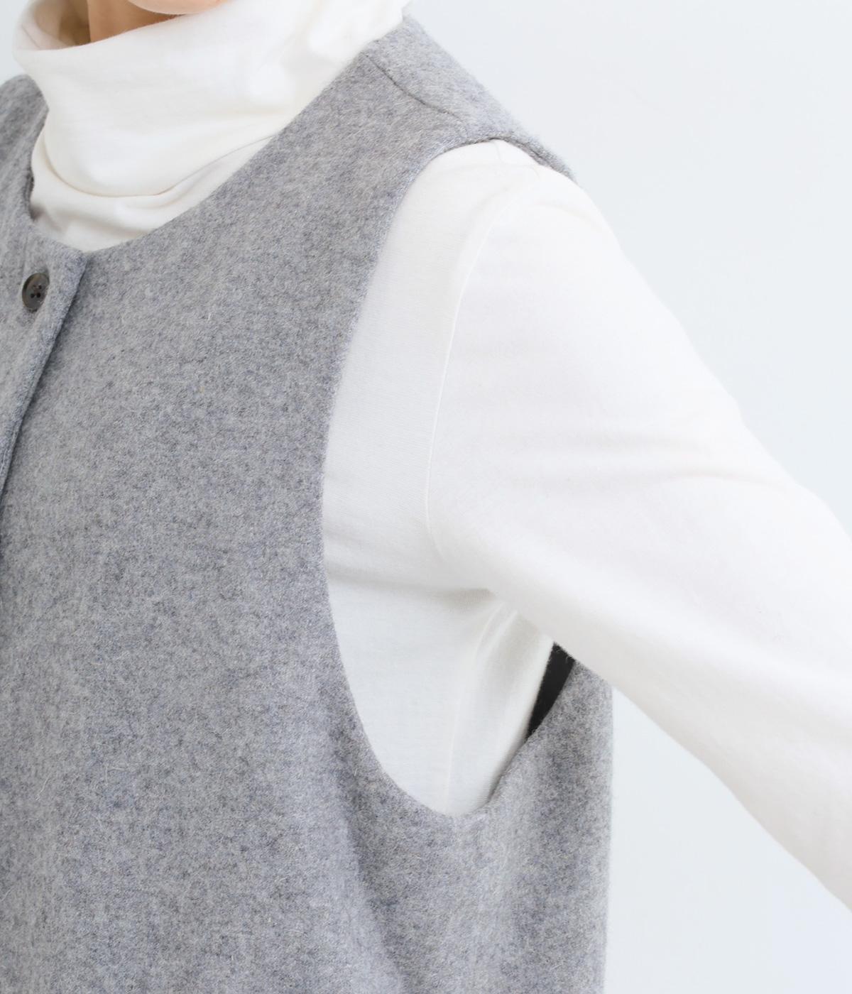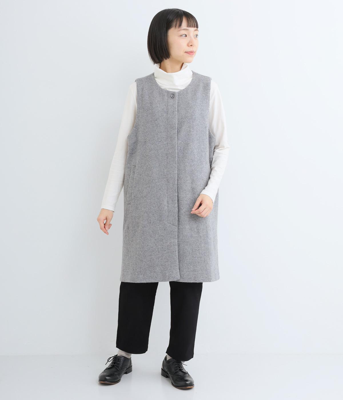 品のある起毛生地が季節感を感じさせてくれるロングベスト。サイドスリットや比翼仕立てなど、さりげないこだわりのデザインがこなれた印象を与えてくれます。フロントのボタンはいちばん上だけとめると、さらにセンスよく着こなせます。