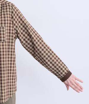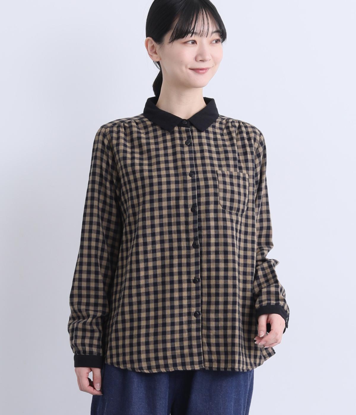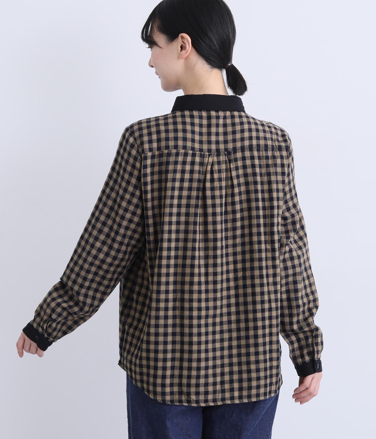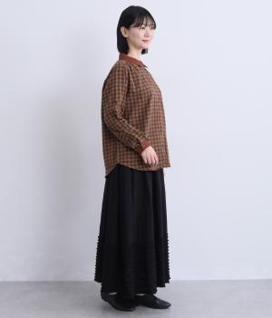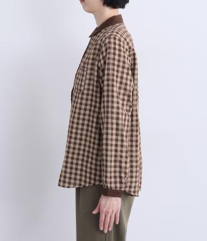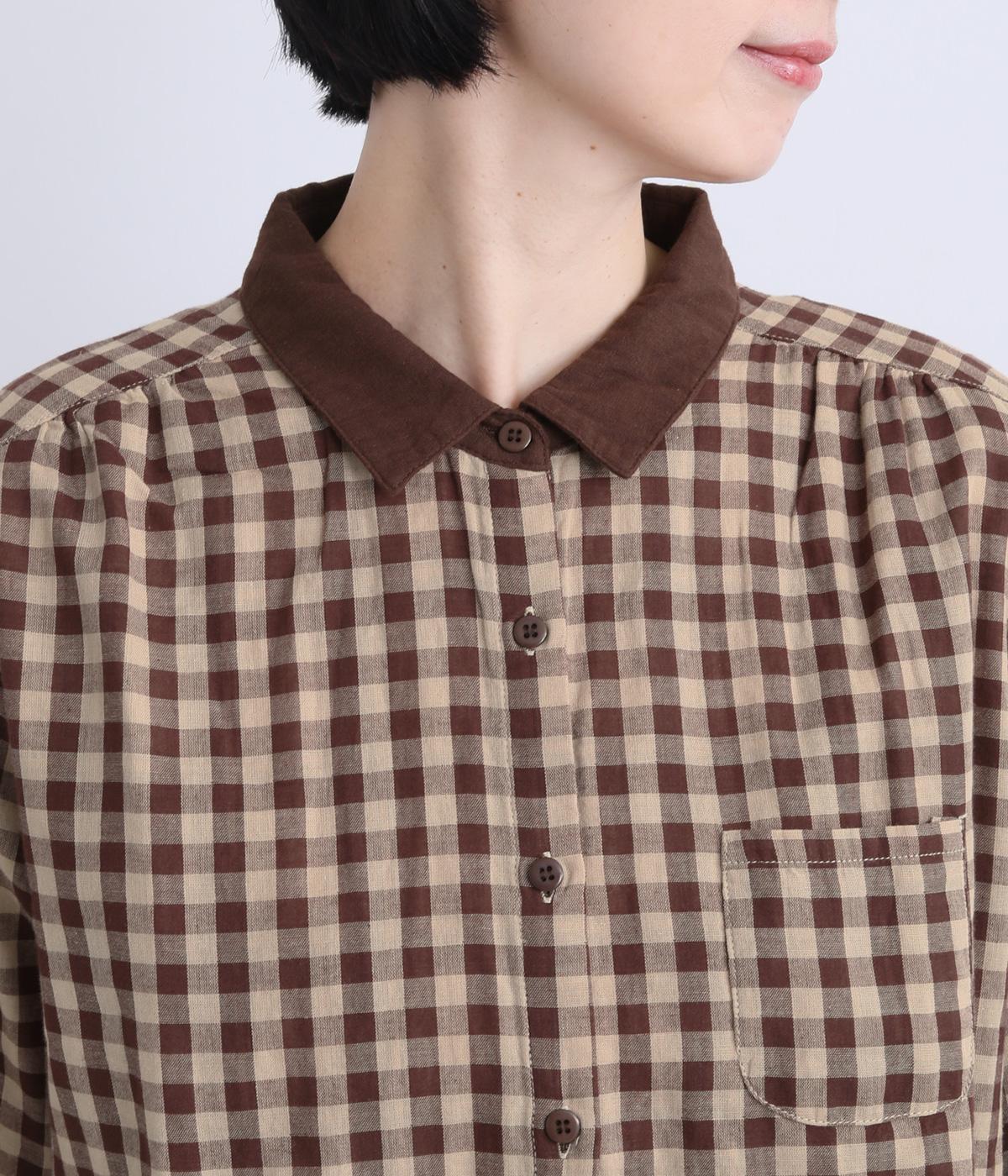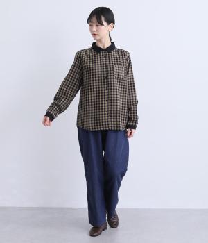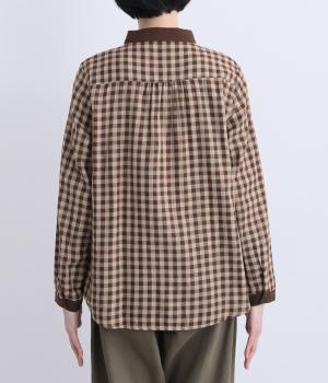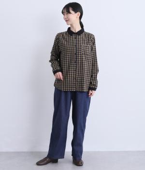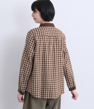 クレリック風に無地と組み合わせてメリハリよく仕上げたチェック柄シャツ。後ろヨークギャザーでフレアに仕上げ、きちんと感を残しつつも着心地のよい一枚に。ナチュラルスタイルに取り入れやすく、軽い羽織りとしても◎。