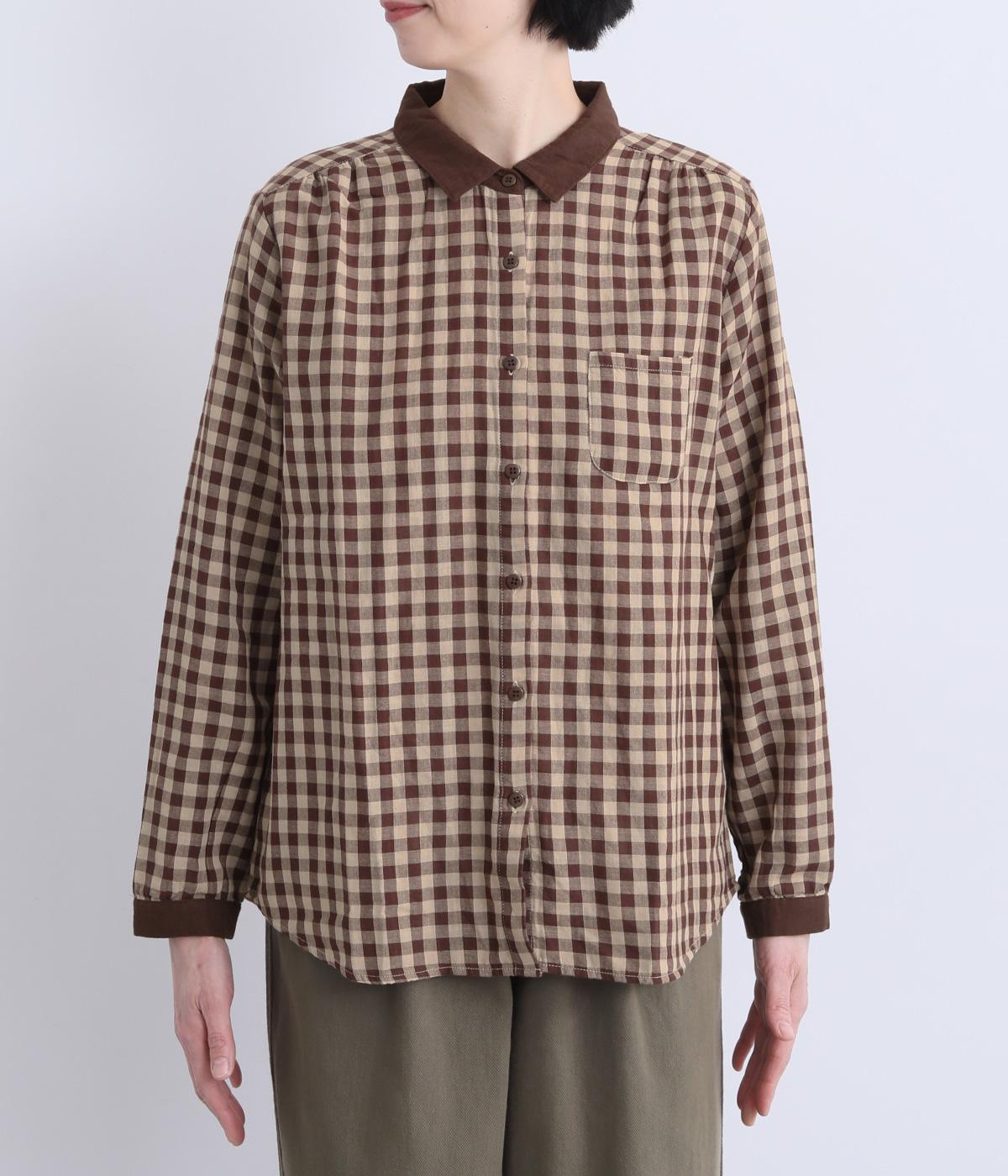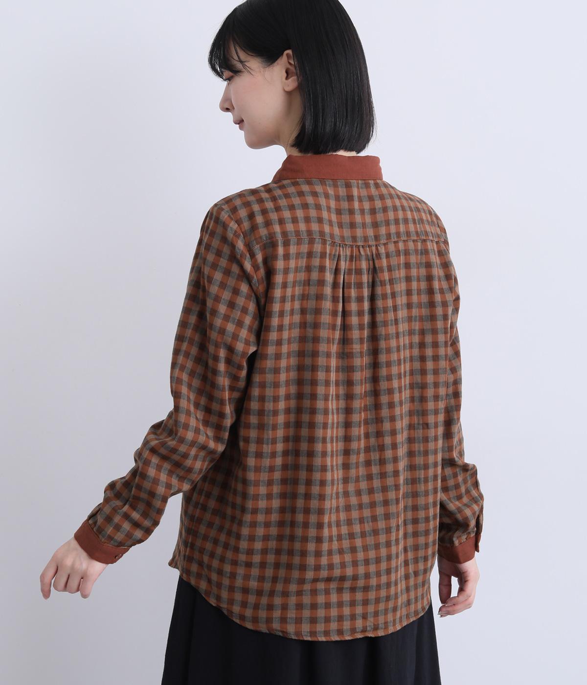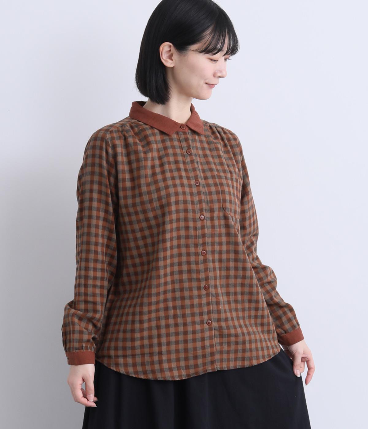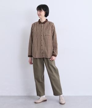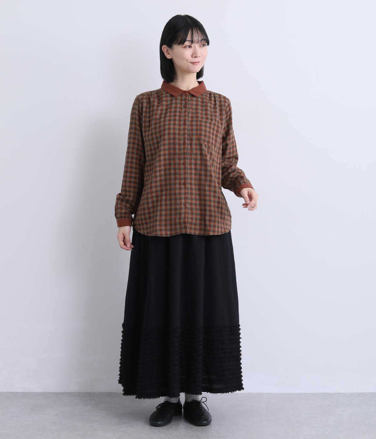 クレリック風に無地と組み合わせてメリハリよく仕上げたチェック柄シャツ。後ろヨークギャザーでフレアに仕上げ、きちんと感を残しつつも着心地のよい一枚に。ナチュラルスタイルに取り入れやすく、軽い羽織りとしても◎。