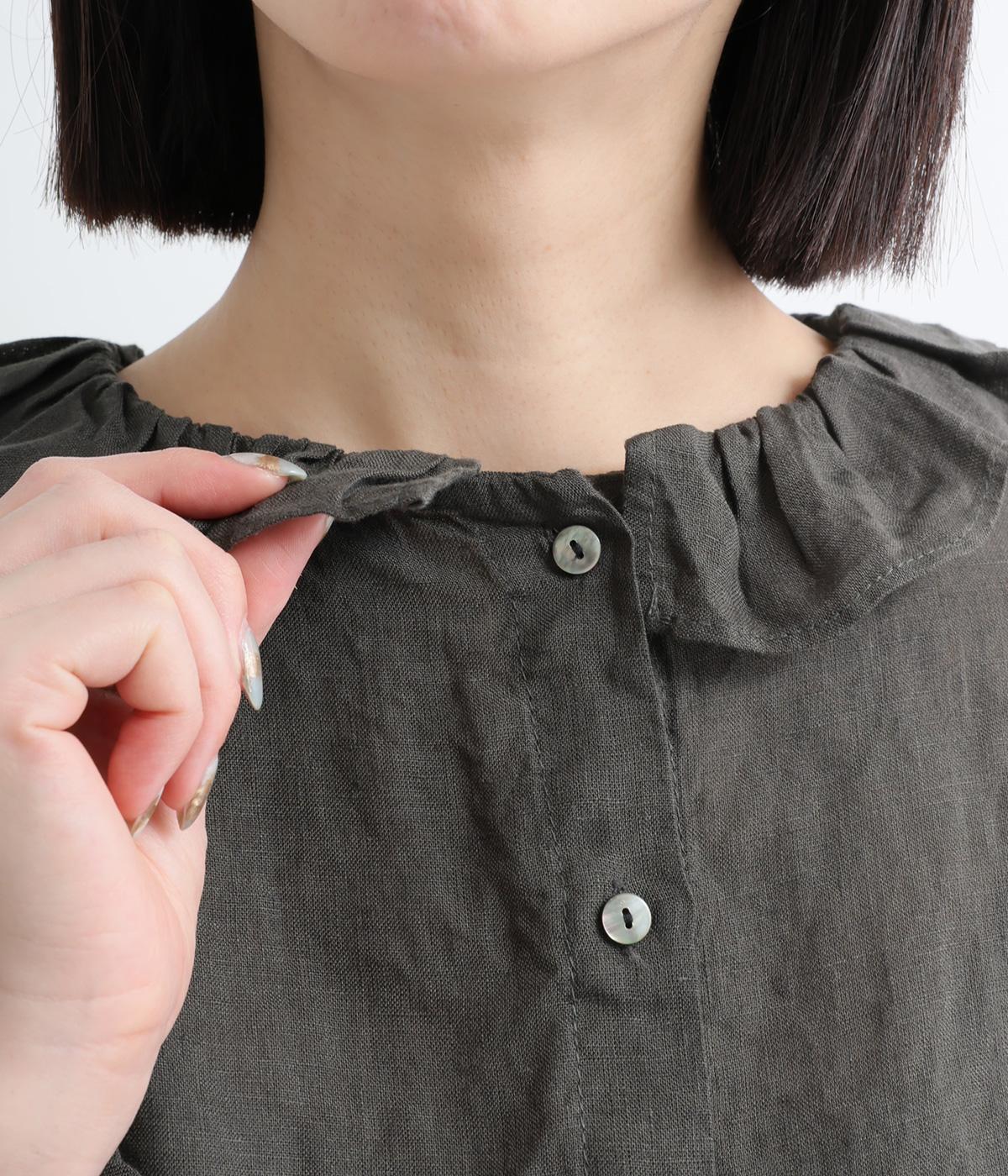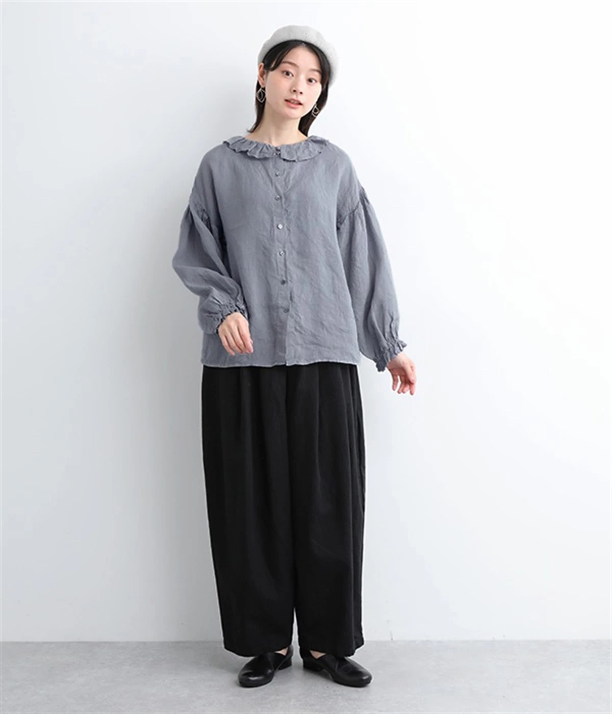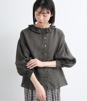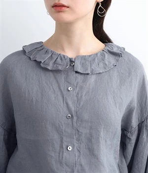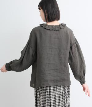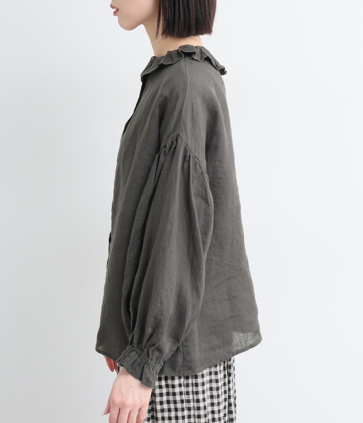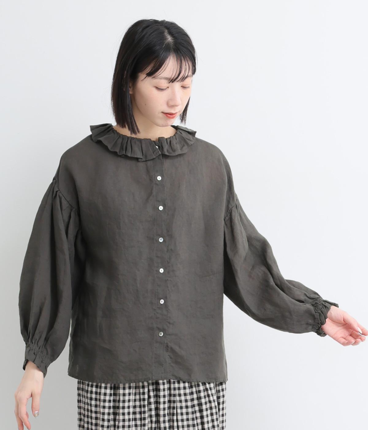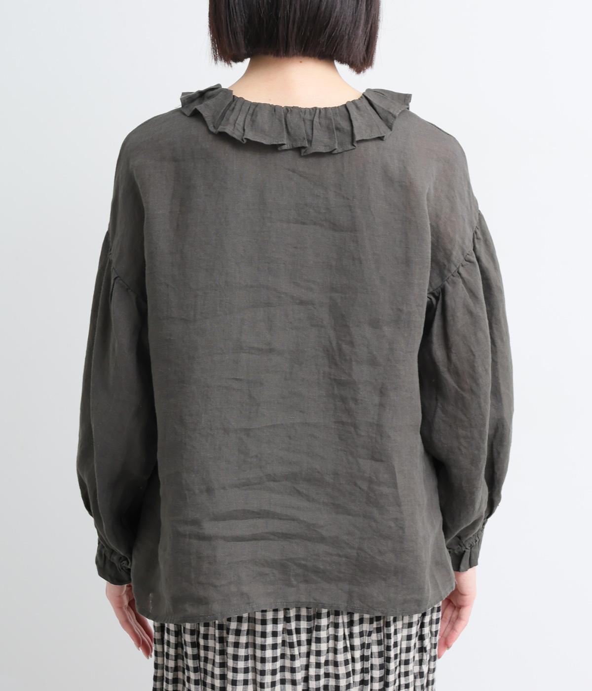 フリルの首元がエレガントな印象をもたらすブラウス。袖のギャザーがやわらかな膨らみと陰影を描き、さりげない華やかさを添えます。ナチュラルなリネンの風合いで、甘さを抑えた落ち着いた佇まいに仕上げました。
