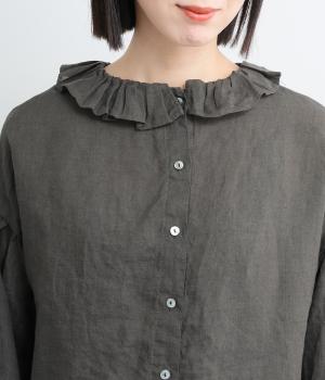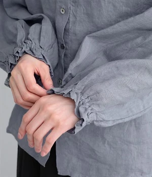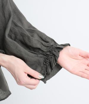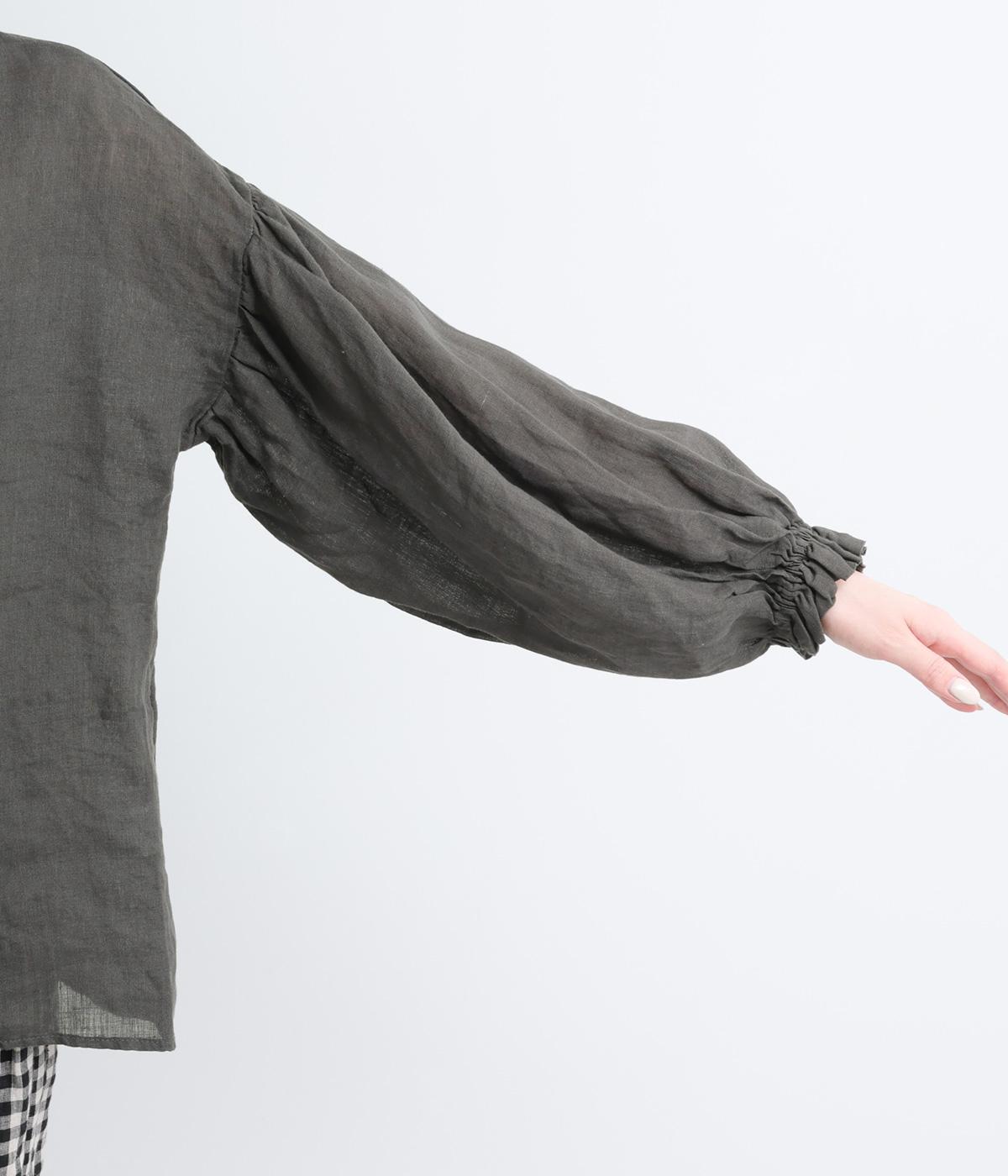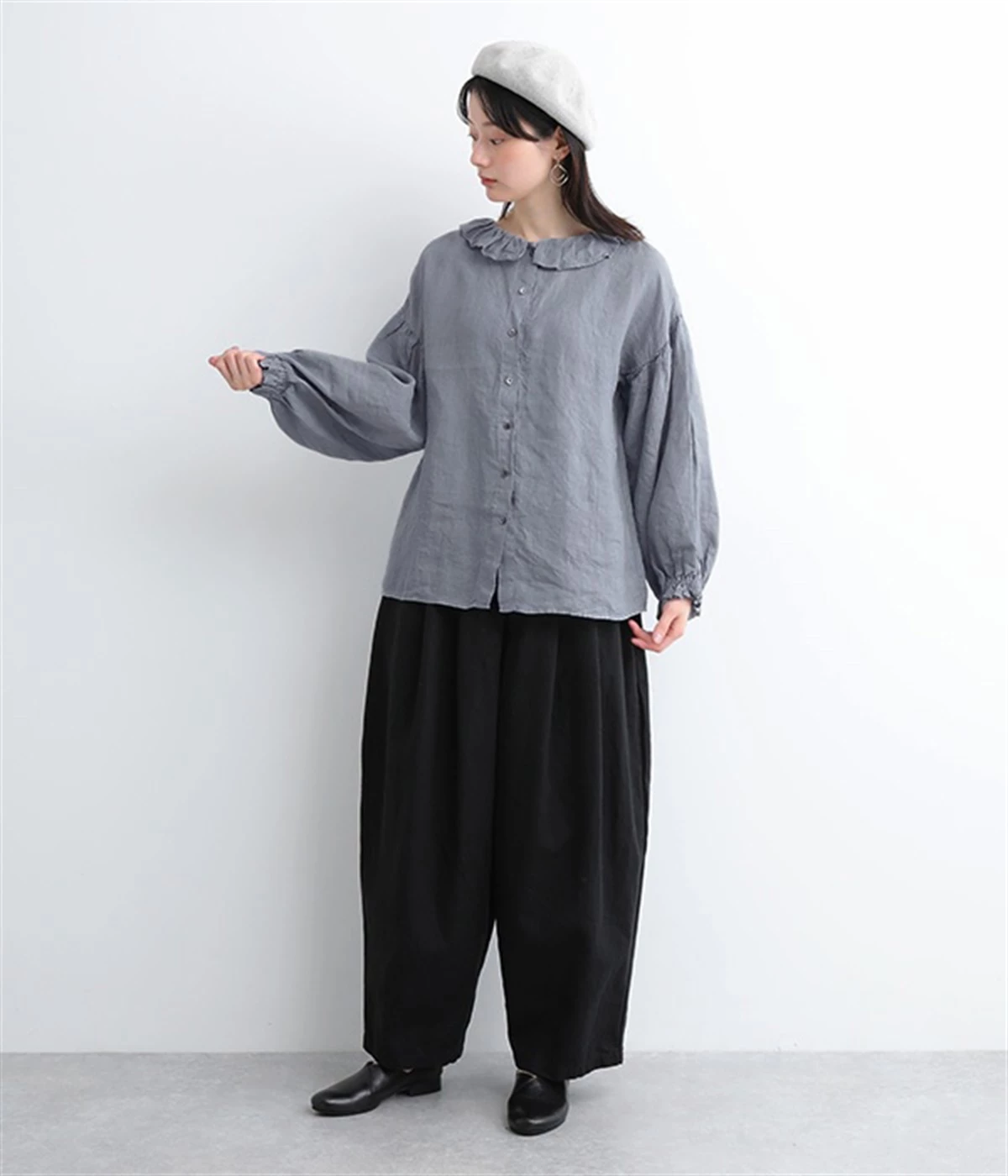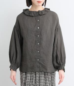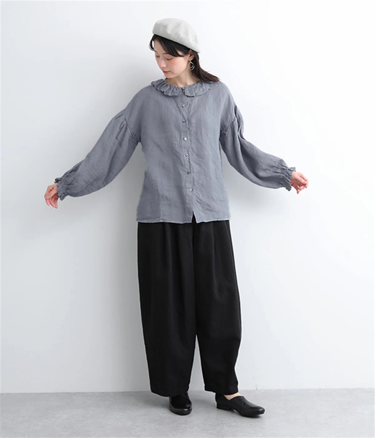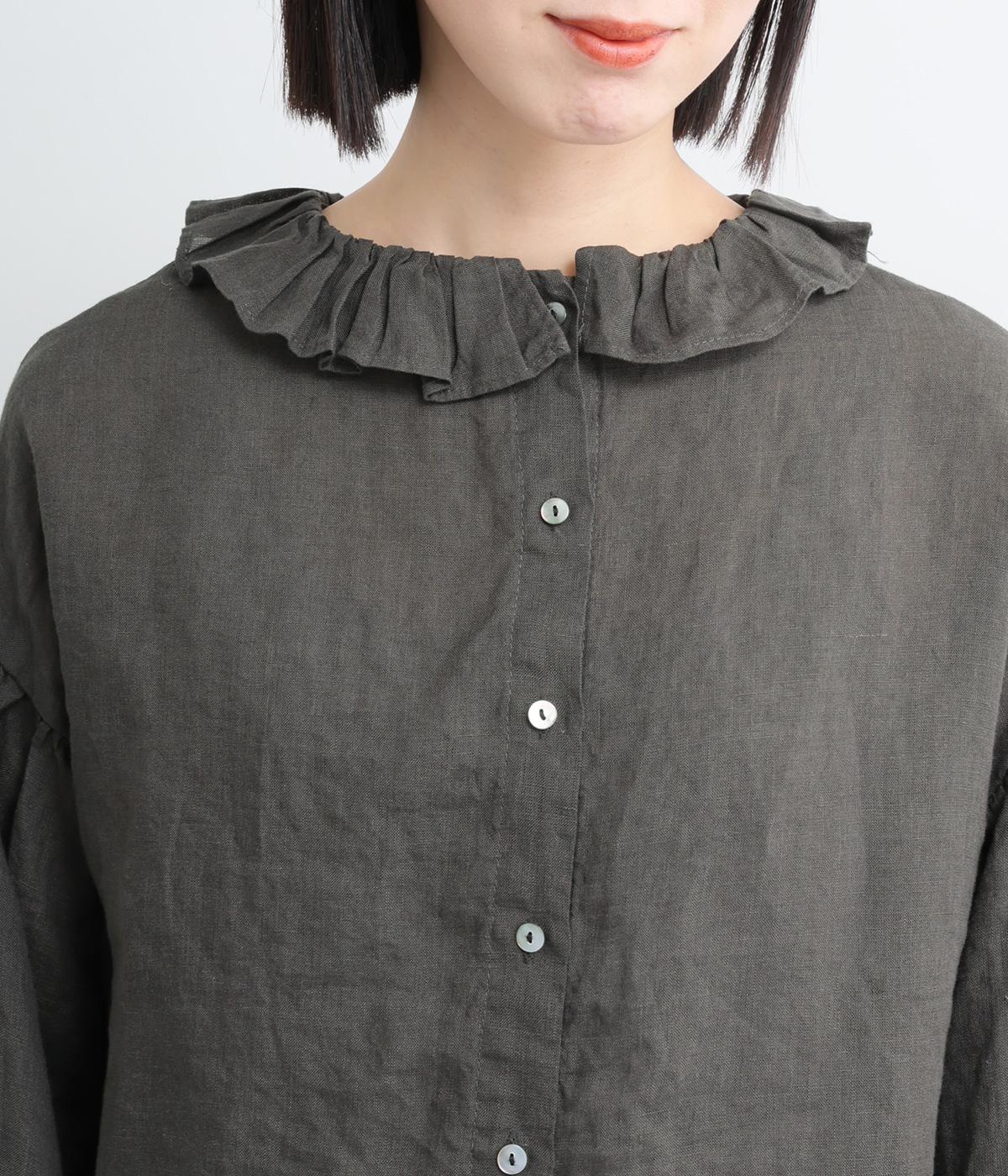 フリルの首元がエレガントな印象をもたらすブラウス。袖のギャザーがやわらかな膨らみと陰影を描き、さりげない華やかさを添えます。ナチュラルなリネンの風合いで、甘さを抑えた落ち着いた佇まいに仕上げました。