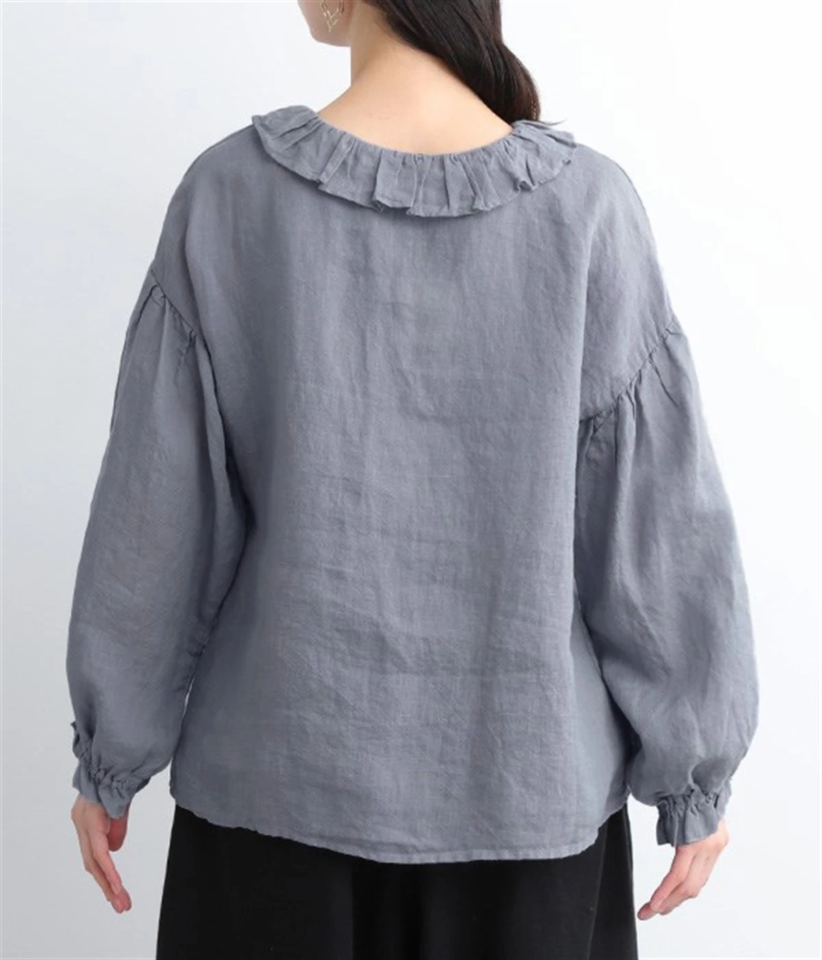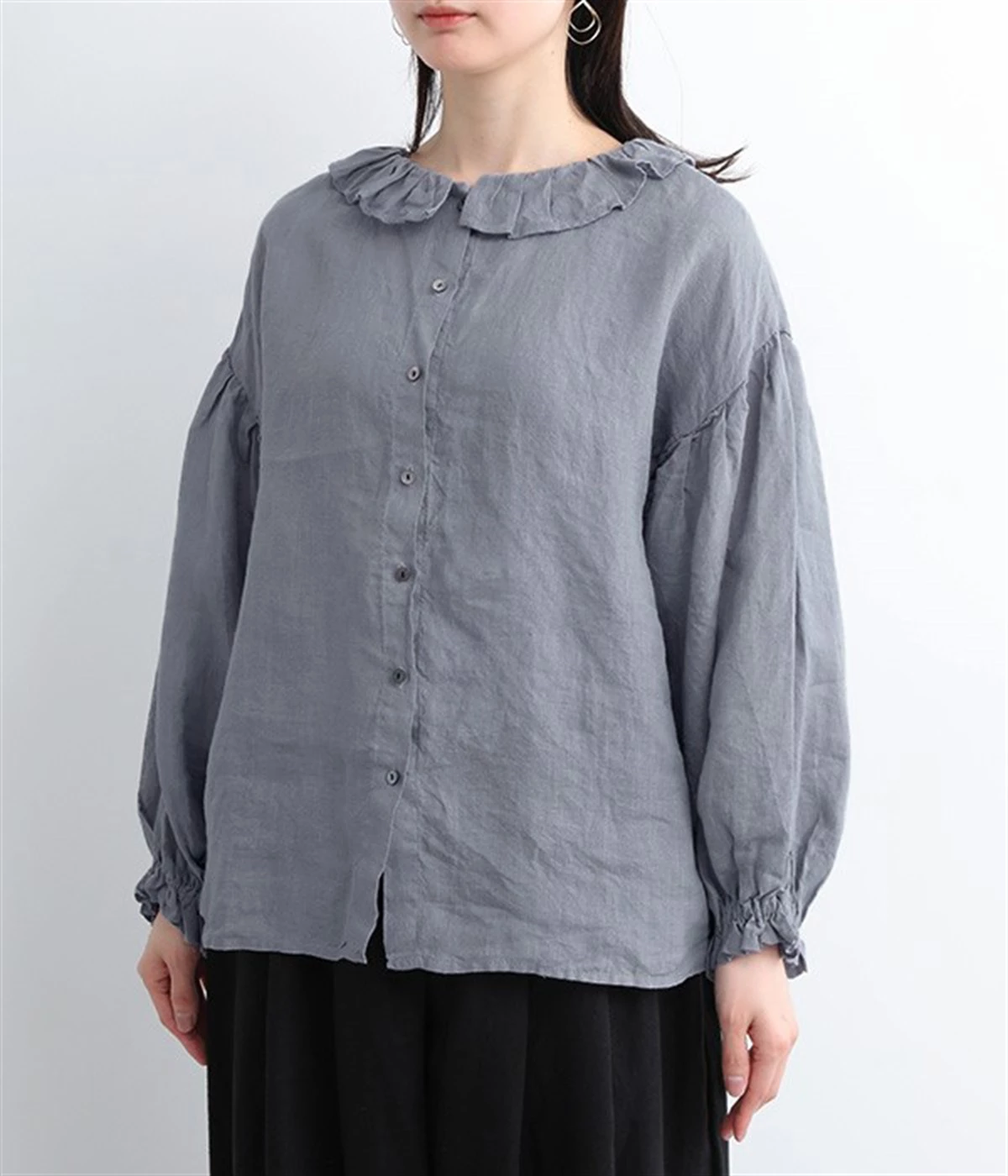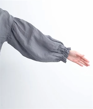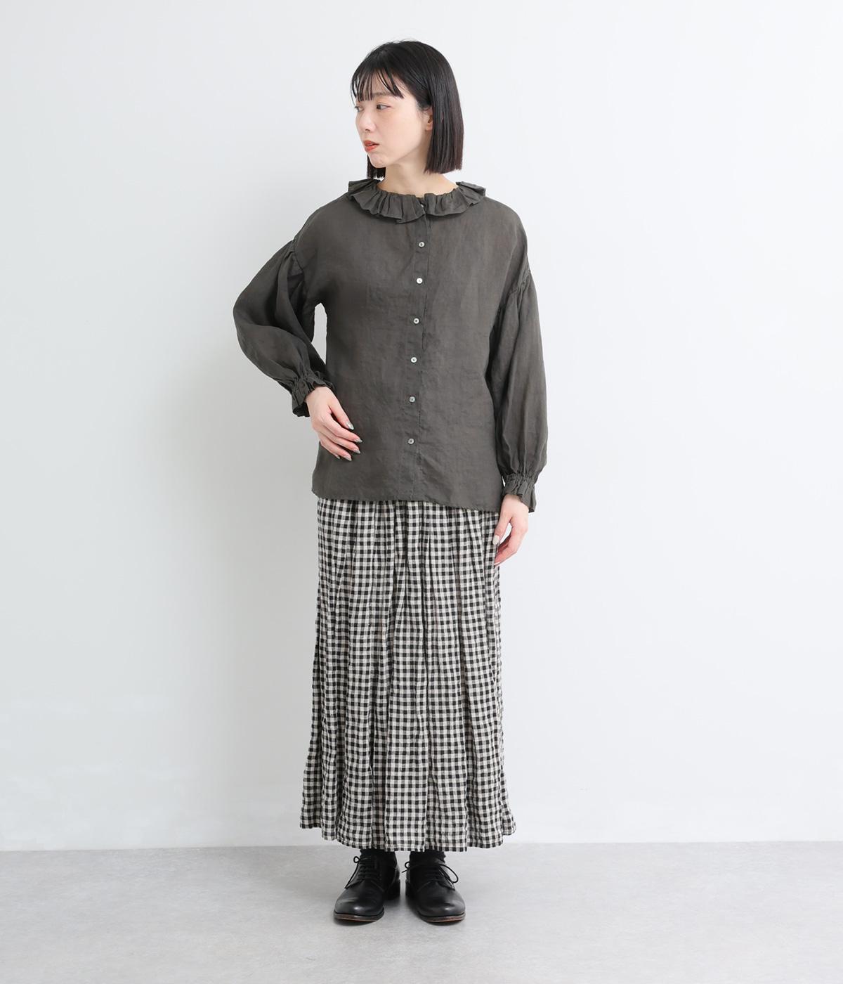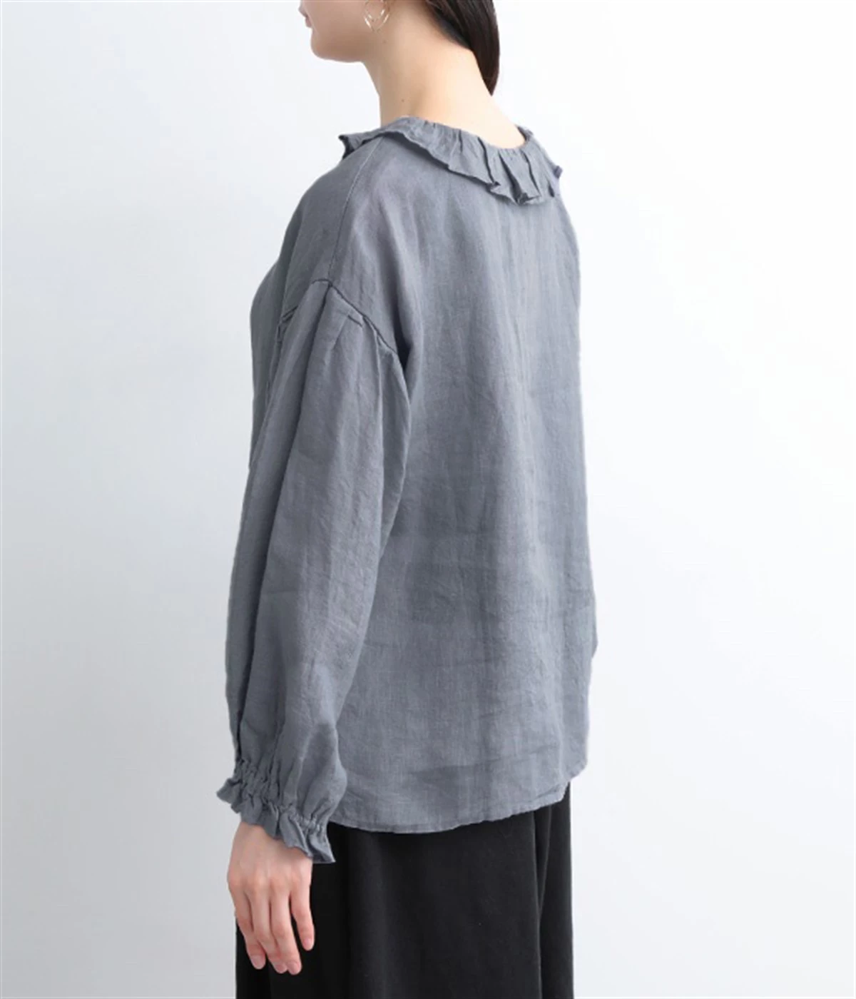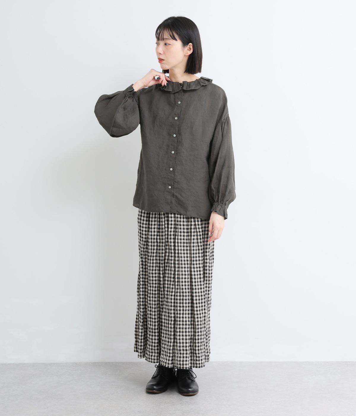 フリルの首元がエレガントな印象をもたらすブラウス。袖のギャザーがやわらかな膨らみと陰影を描き、さりげない華やかさを添えます。ナチュラルなリネンの風合いで、甘さを抑えた落ち着いた佇まいに仕上げました。