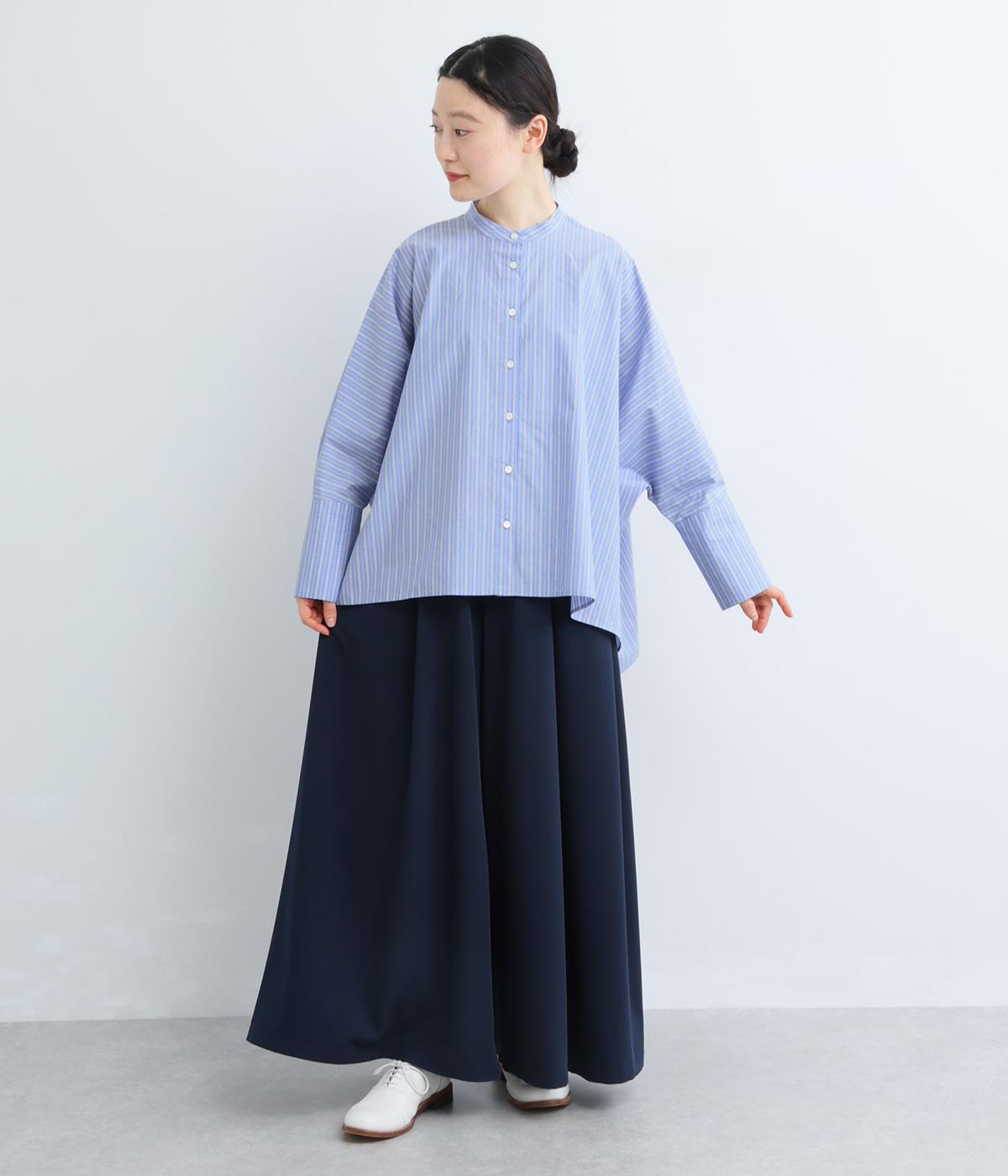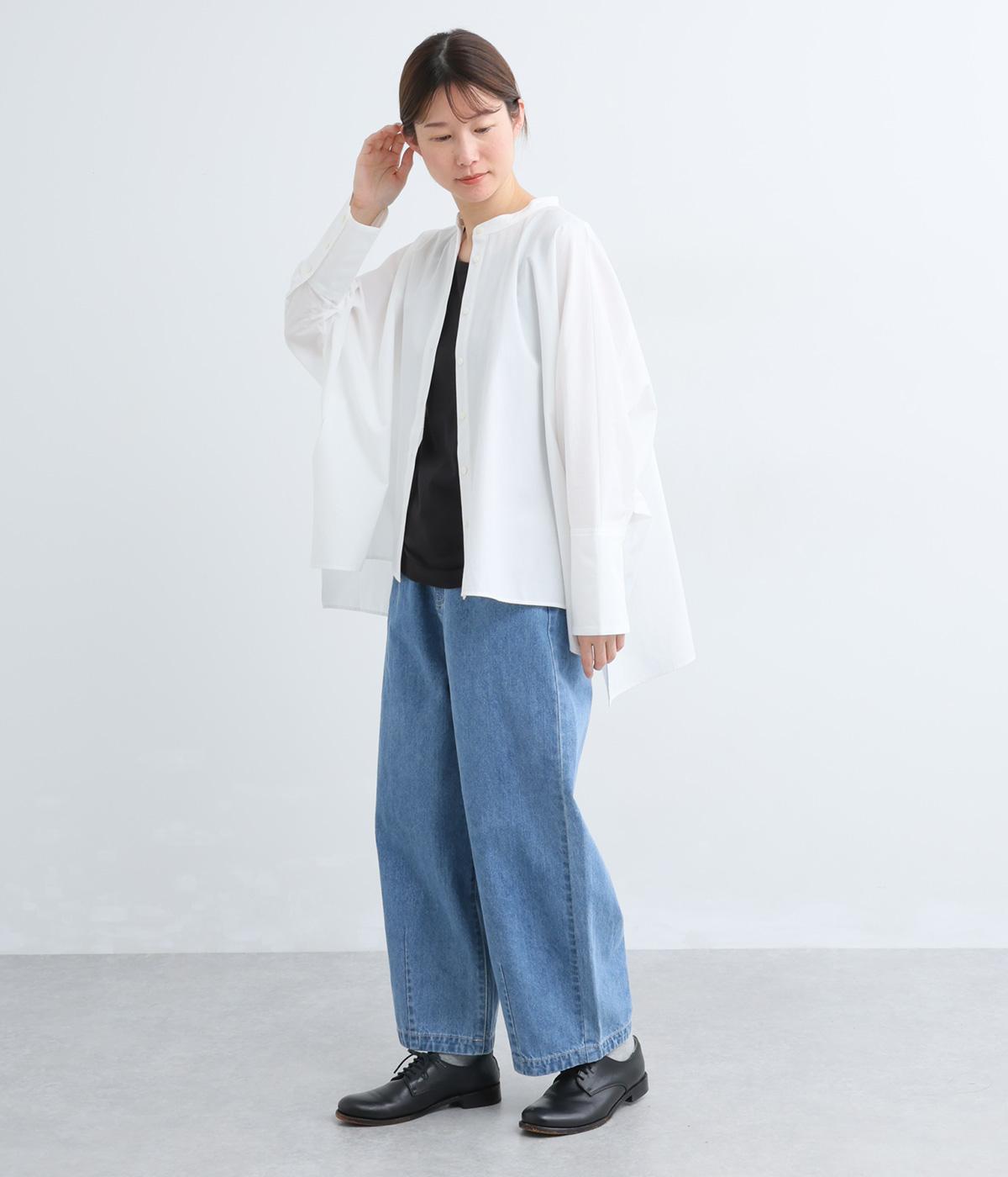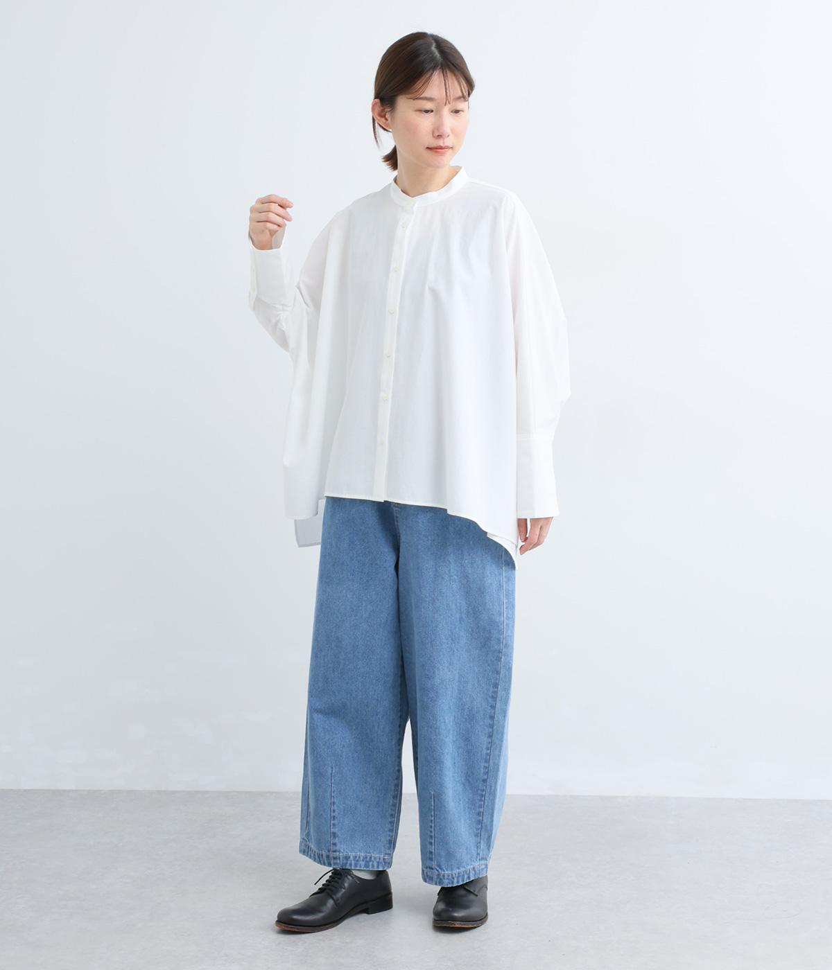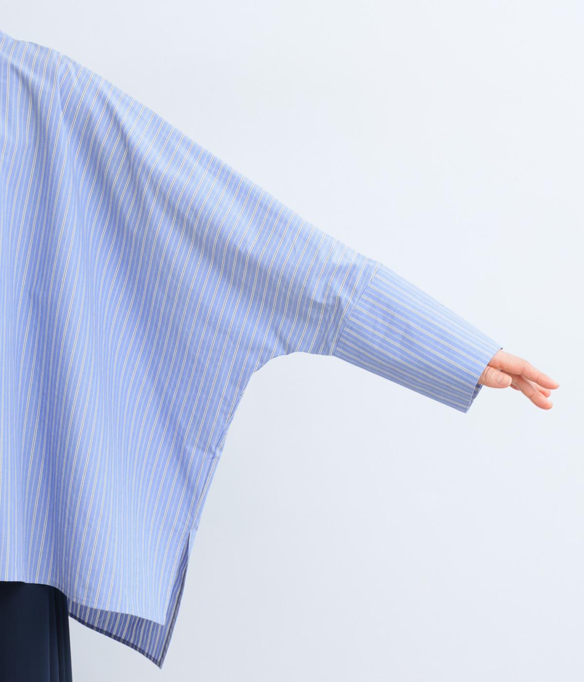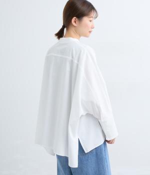 たっぷりの生地が優雅なドレープを描く、ドルマンシルエットのシャツです。長めのカフスがニュアンスを添え、首元はバンドカラーですっきりと仕立てました。サッと着るだけで着映えする主役トップスです。