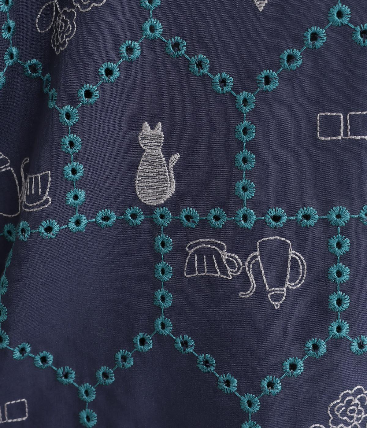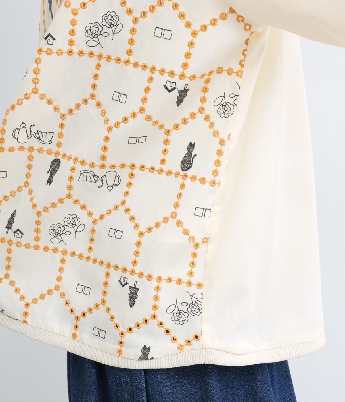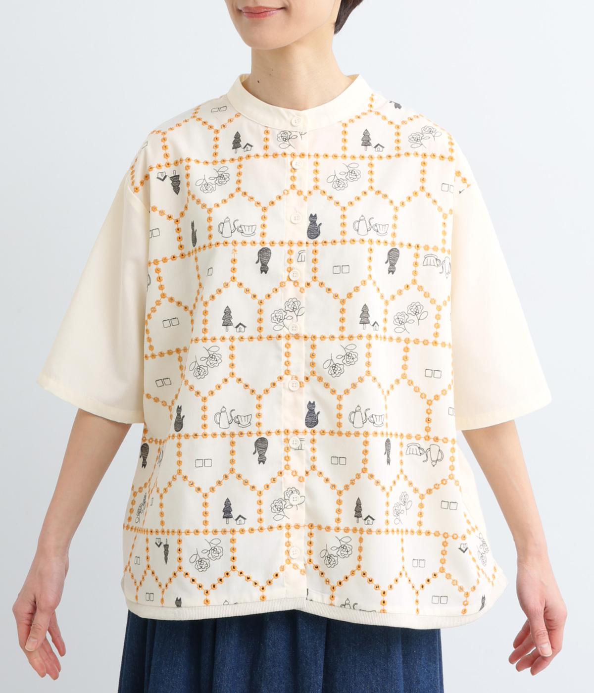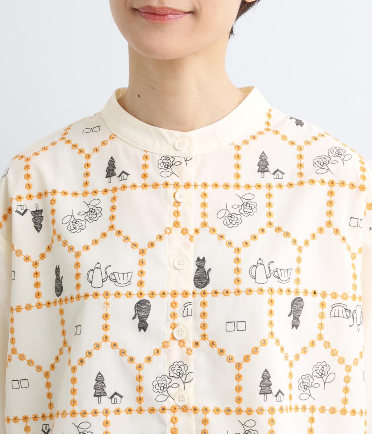 おうちの中をのぞいているような、ほっこりとした気分になる刺しゅう柄シャツ。無地と切り替えているのでうるさくならず、部分的に透かし刺しゅうを取り入れているので適度な抜け感があり、バランスのいい仕上がりです。