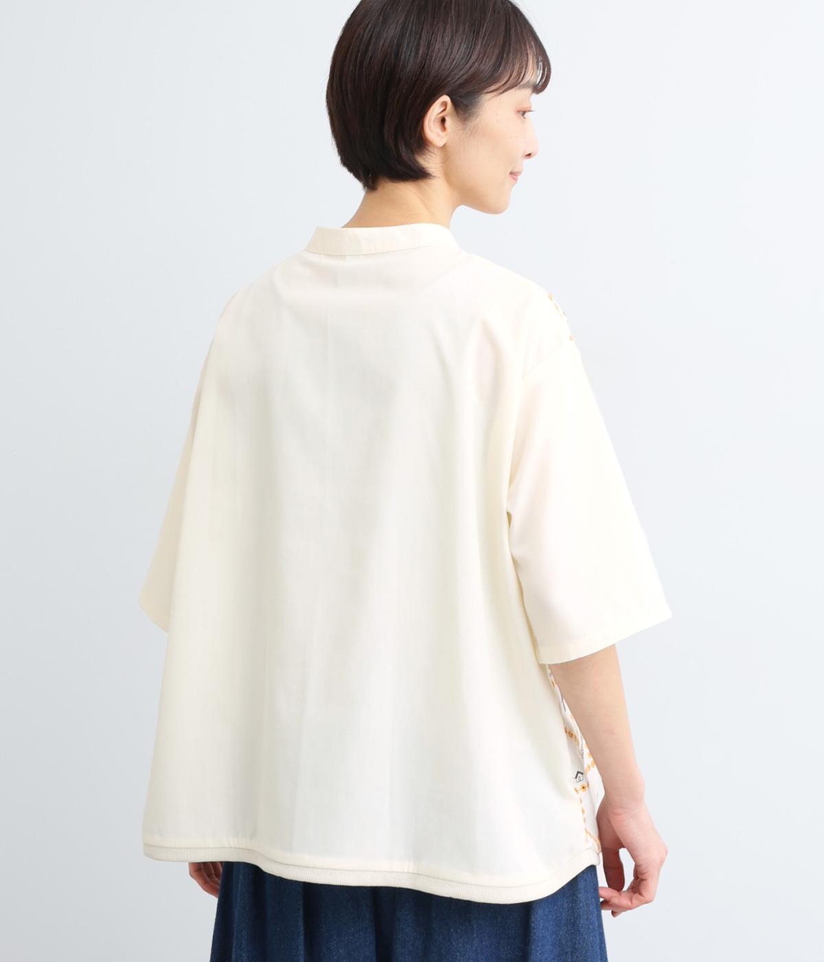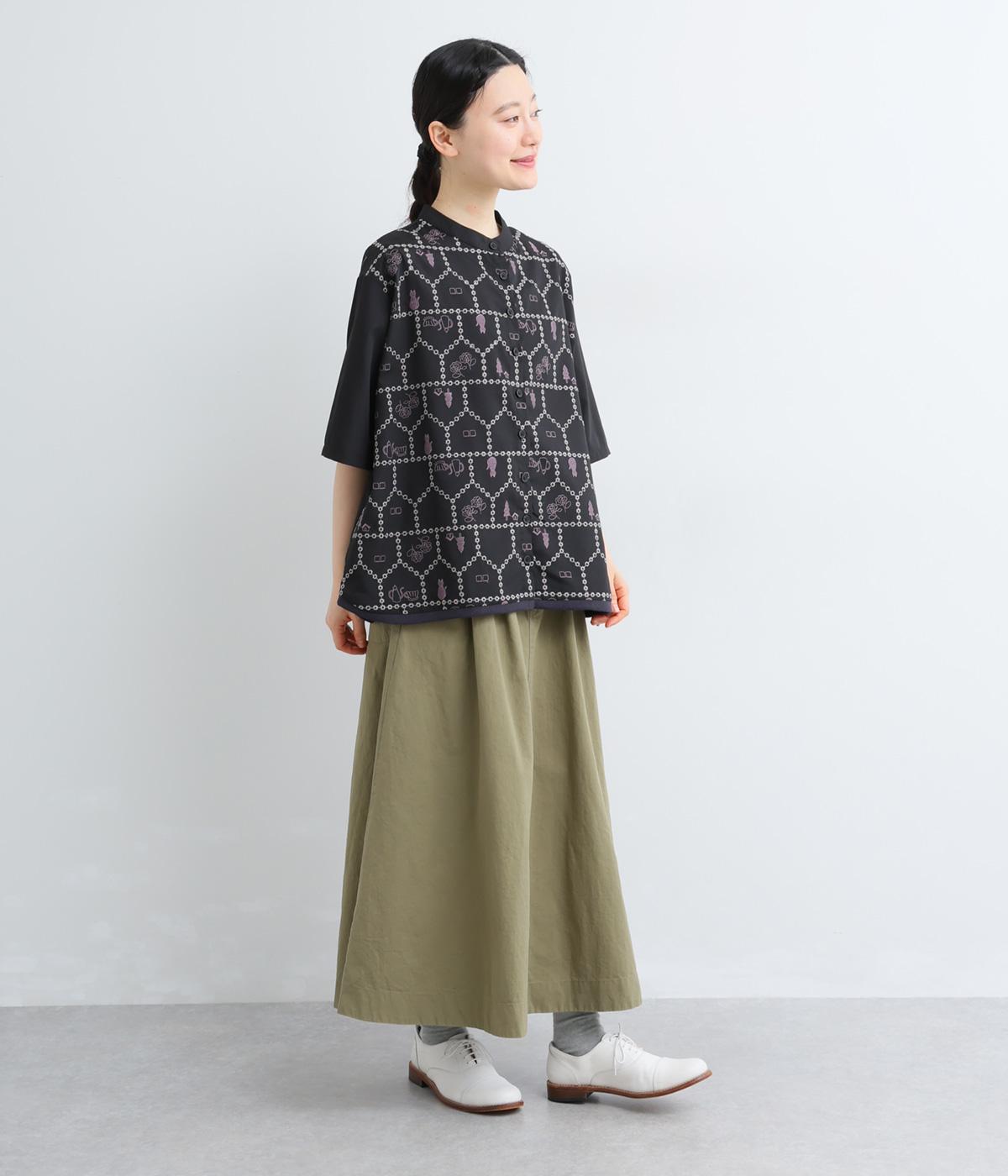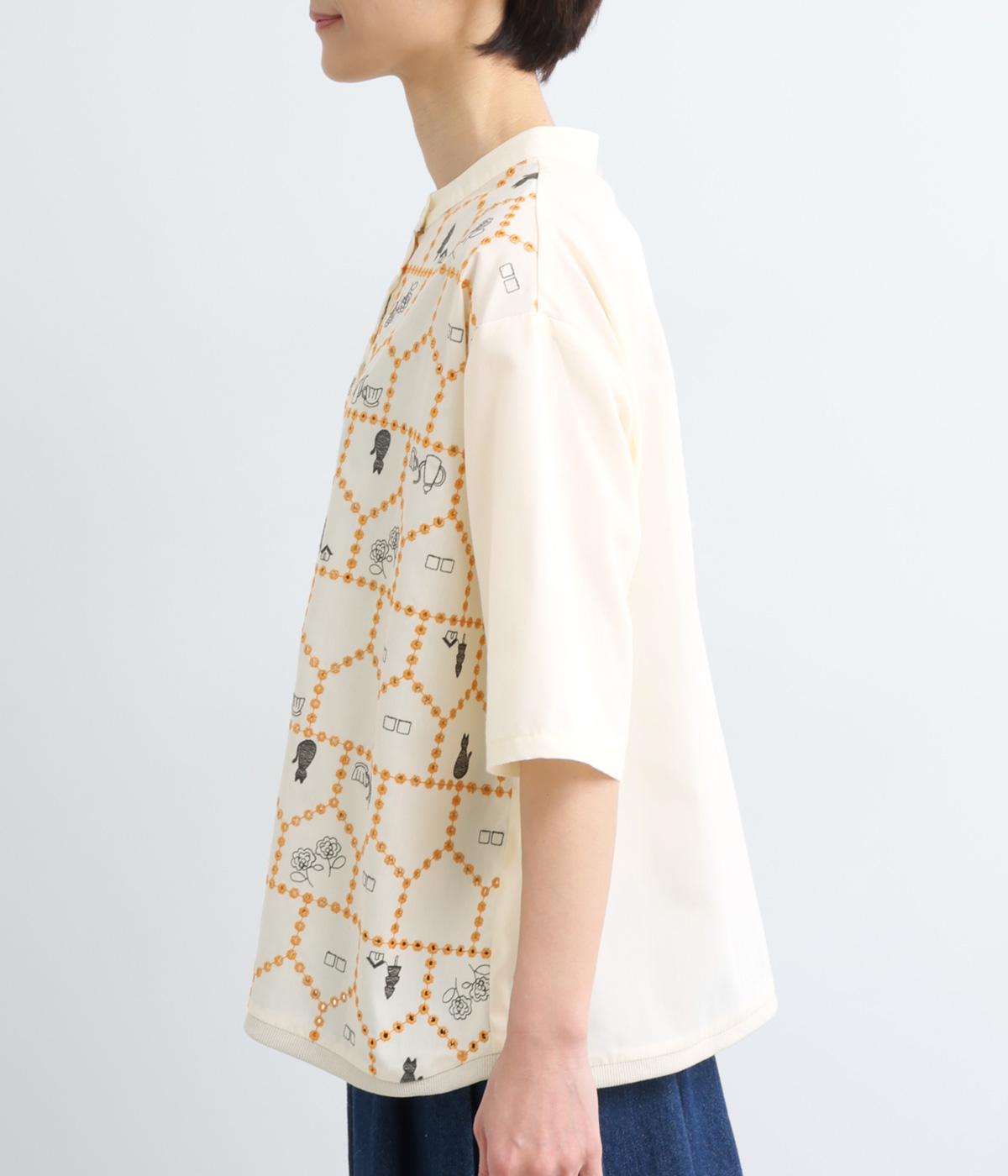 おうちの中をのぞいているような、ほっこりとした気分になる刺しゅう柄シャツ。無地と切り替えているのでうるさくならず、部分的に透かし刺しゅうを取り入れているので適度な抜け感があり、バランスのいい仕上がりです。