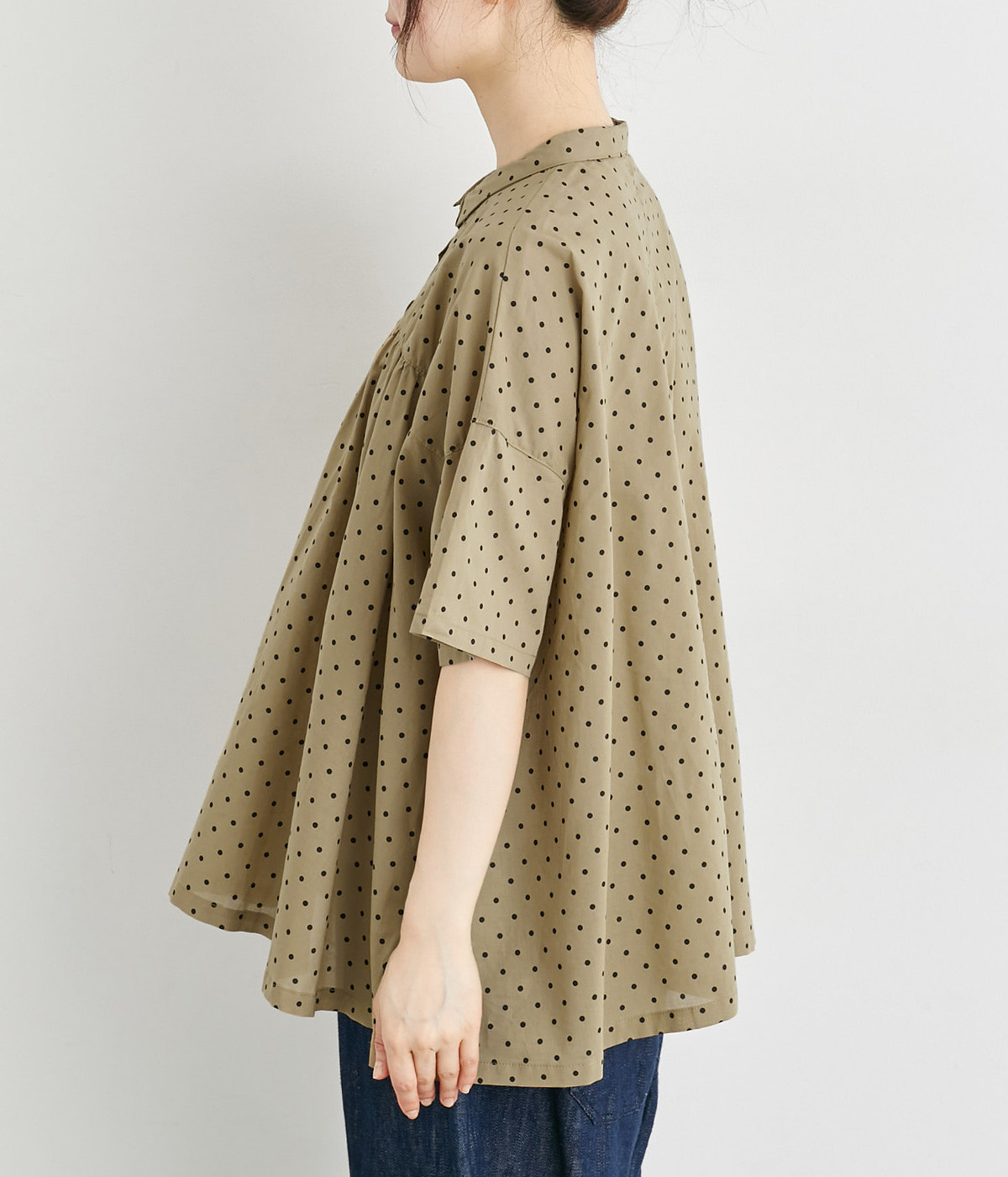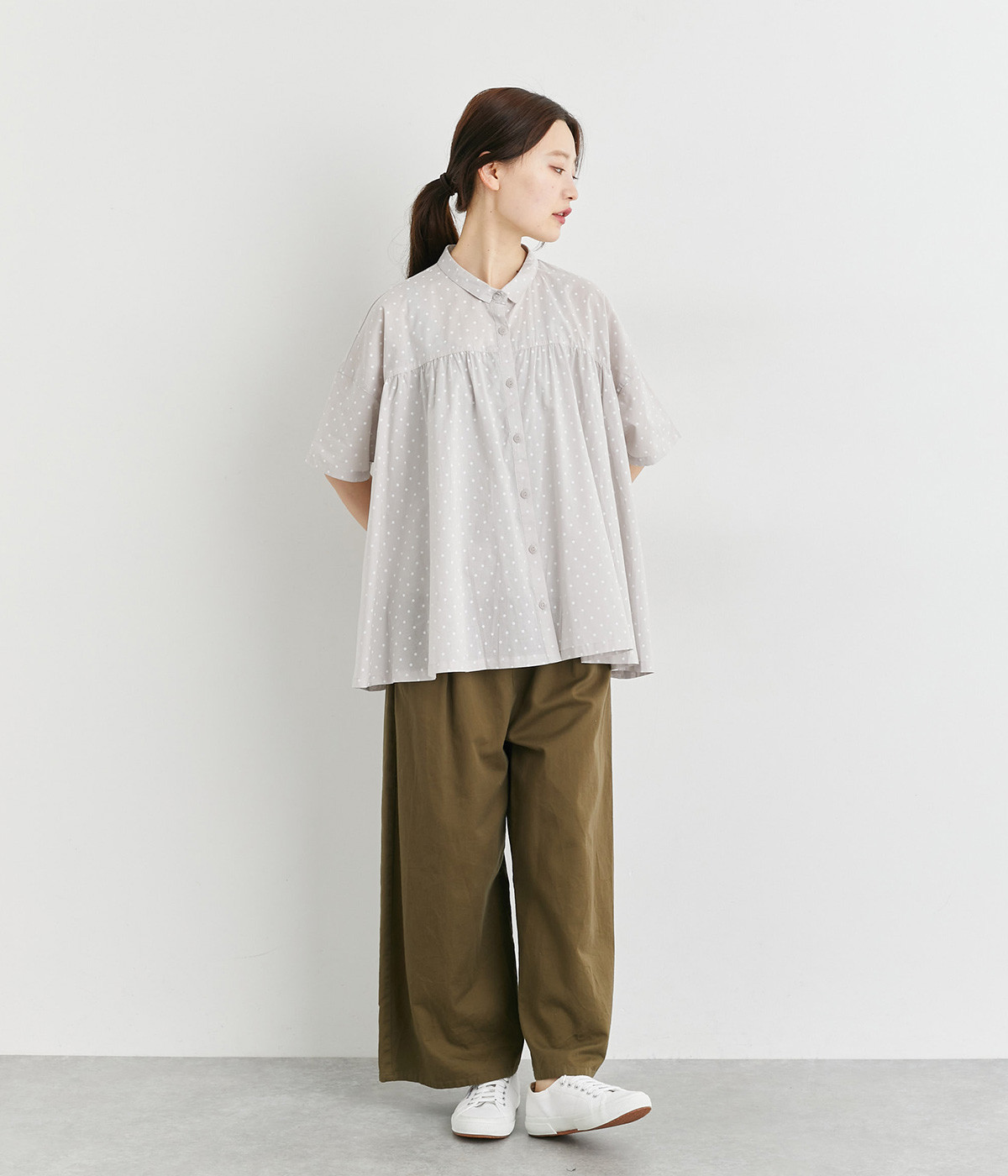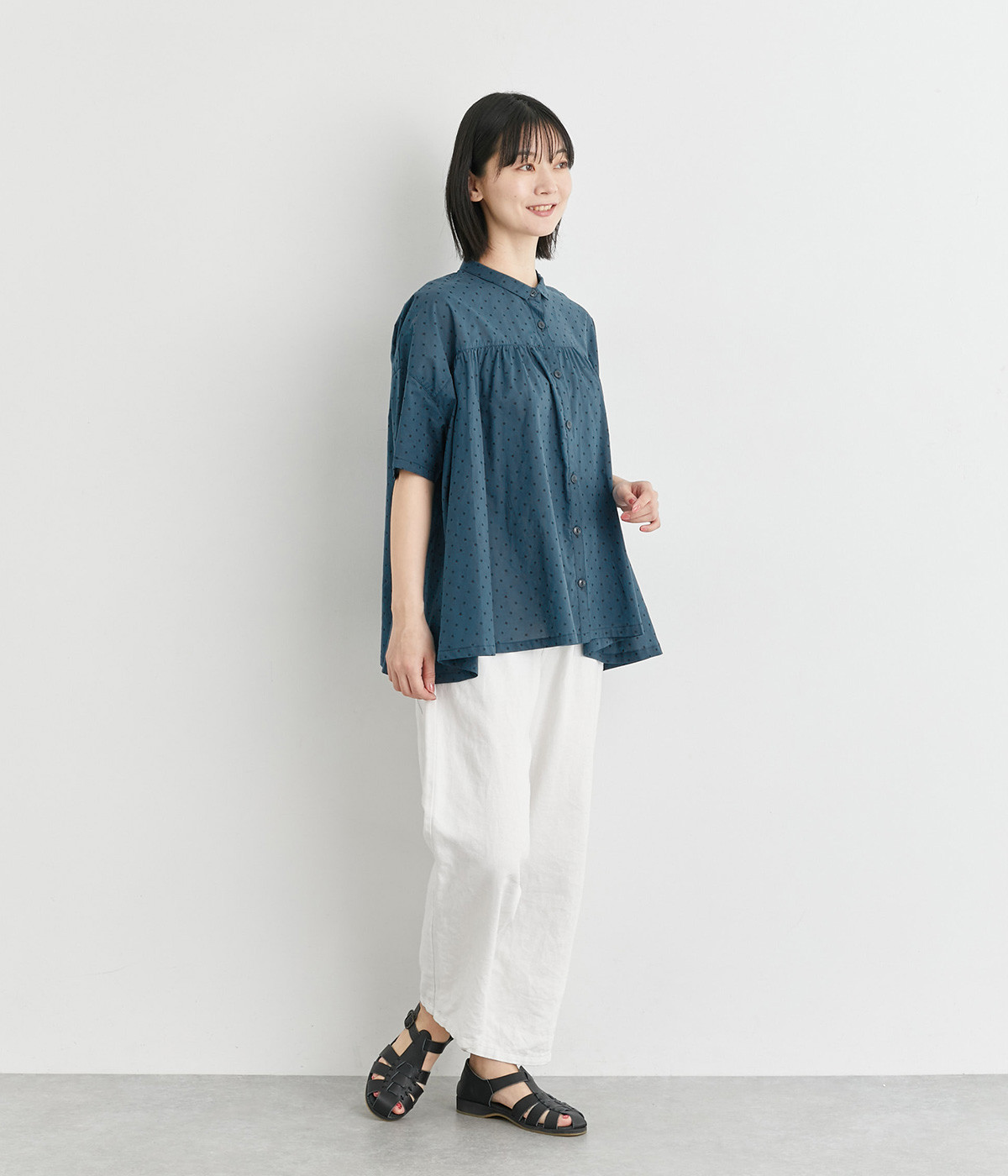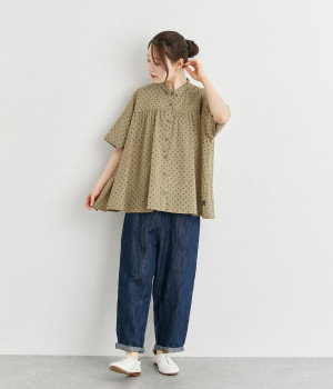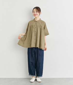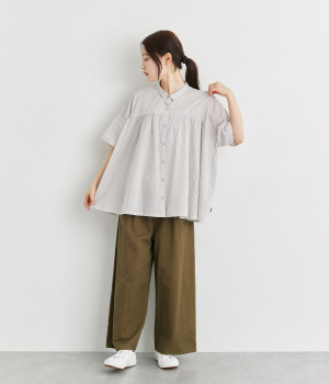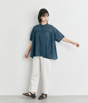 ワイドシルエットで落ち感がありながらも、たっぷりと入れたギャザーがふんわりとしたシルエットを描きます。主張しすぎない小さめの襟がガーリー要素をプラス。汗ばむ季節の羽織りとしても活躍してくれる一枚です。