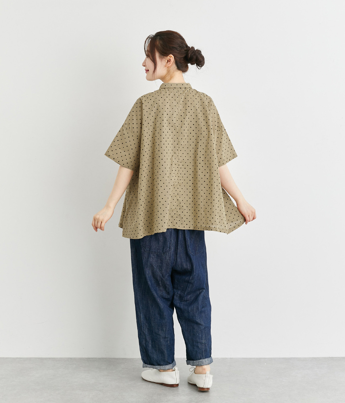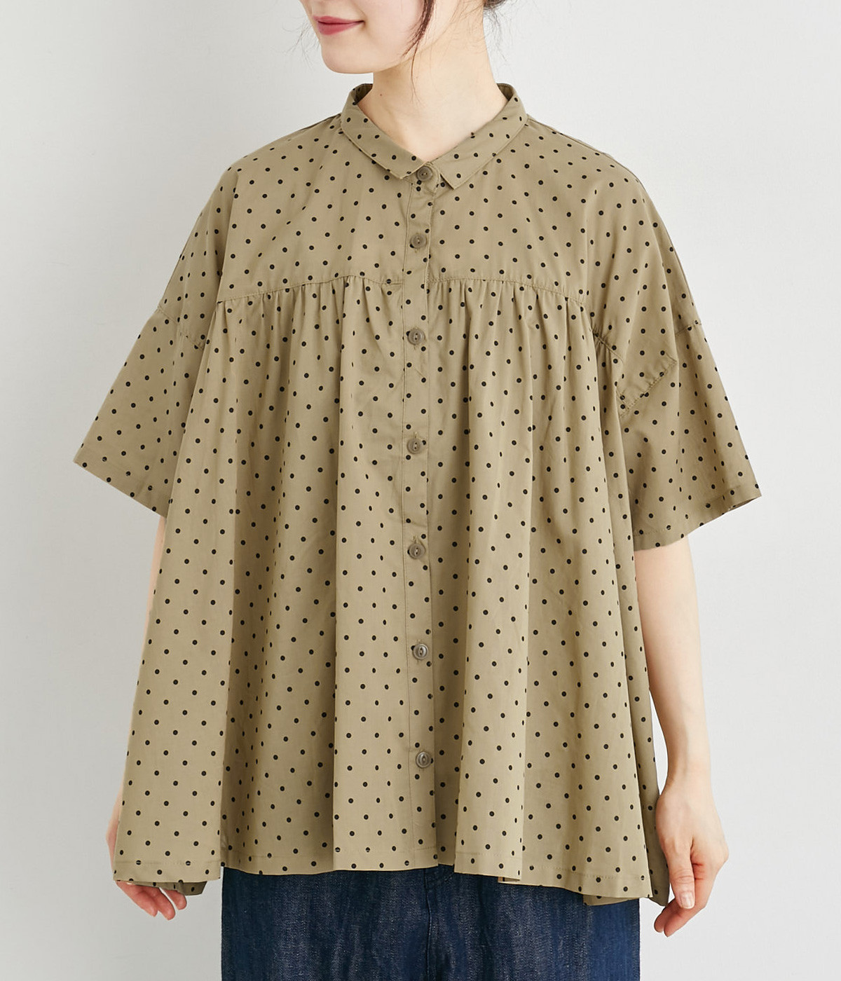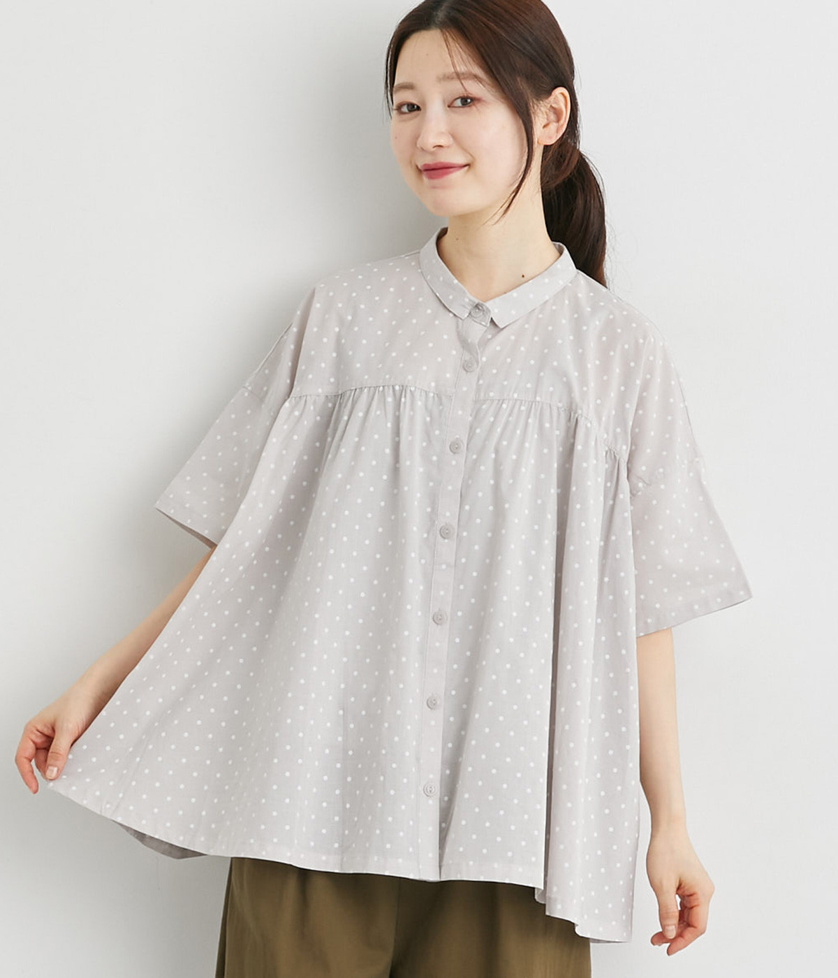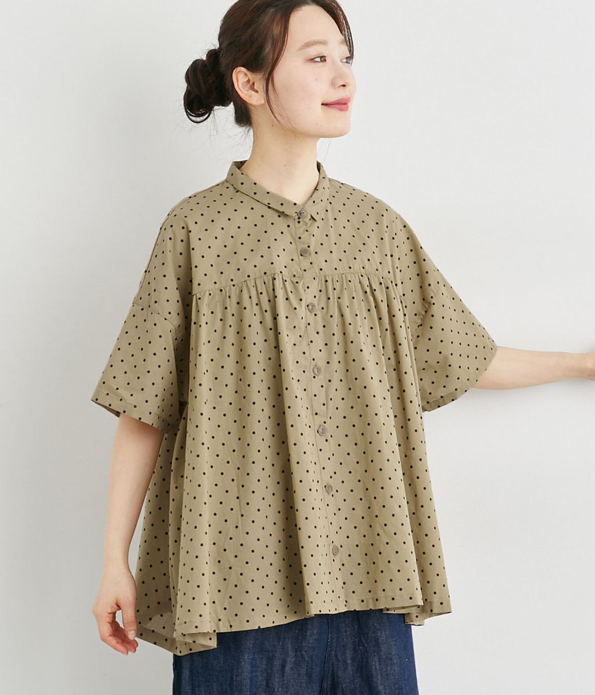 ワイドシルエットで落ち感がありながらも、たっぷりと入れたギャザーがふんわりとしたシルエットを描きます。主張しすぎない小さめの襟がガーリー要素をプラス。汗ばむ季節の羽織りとしても活躍してくれる一枚です。