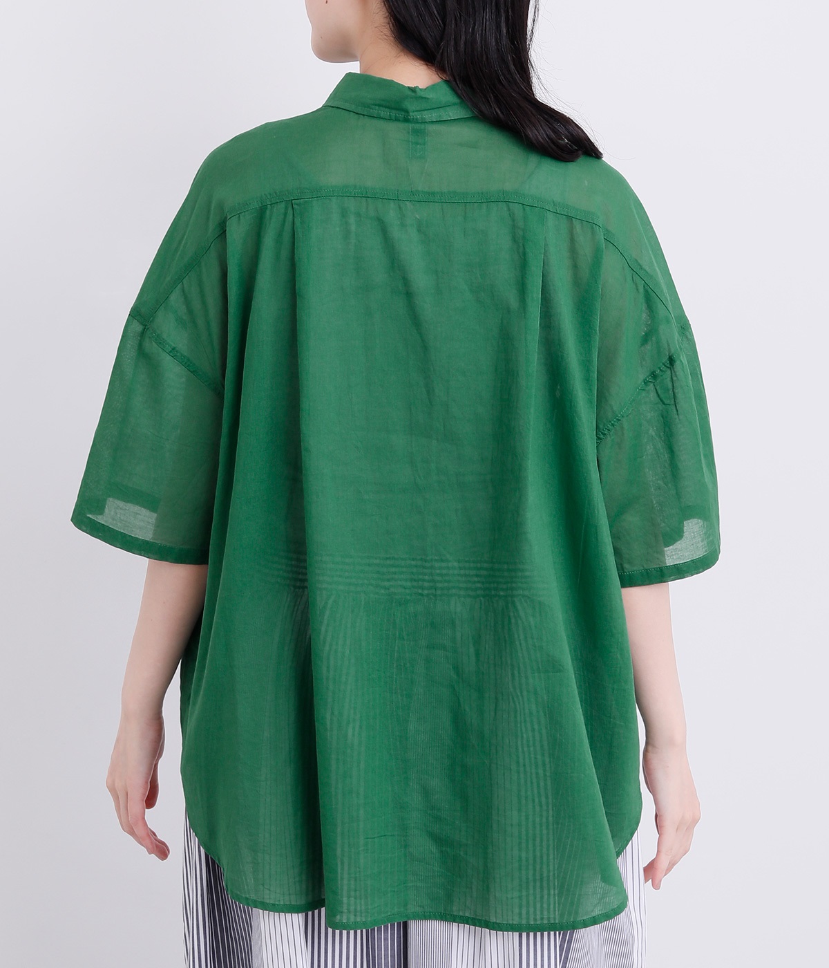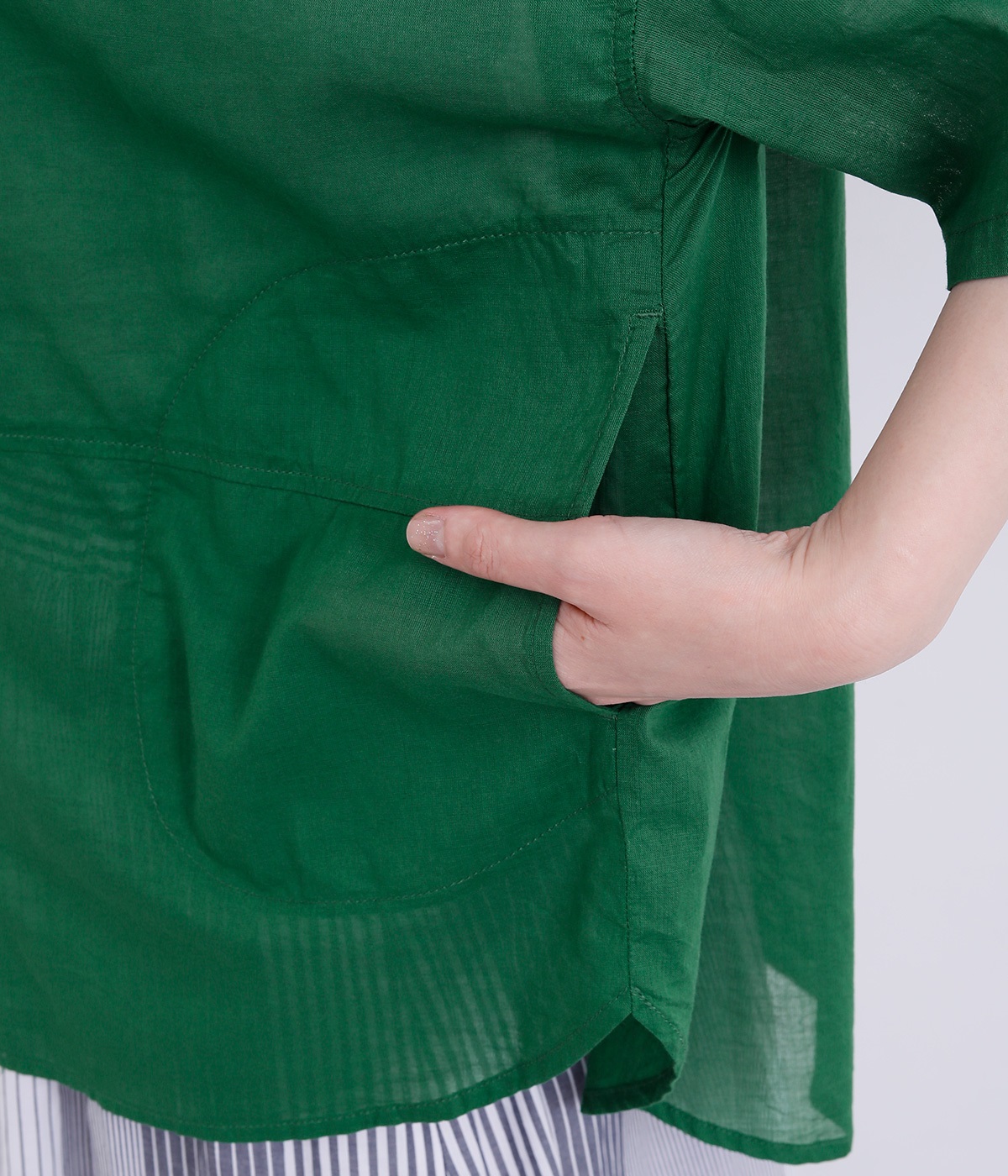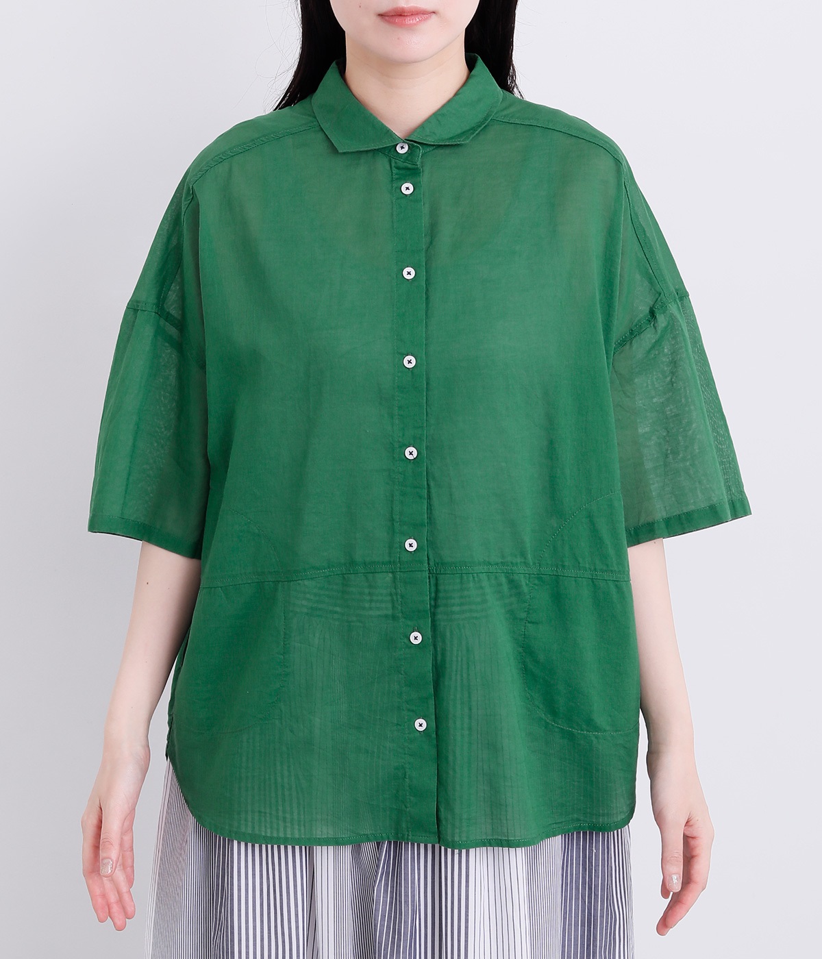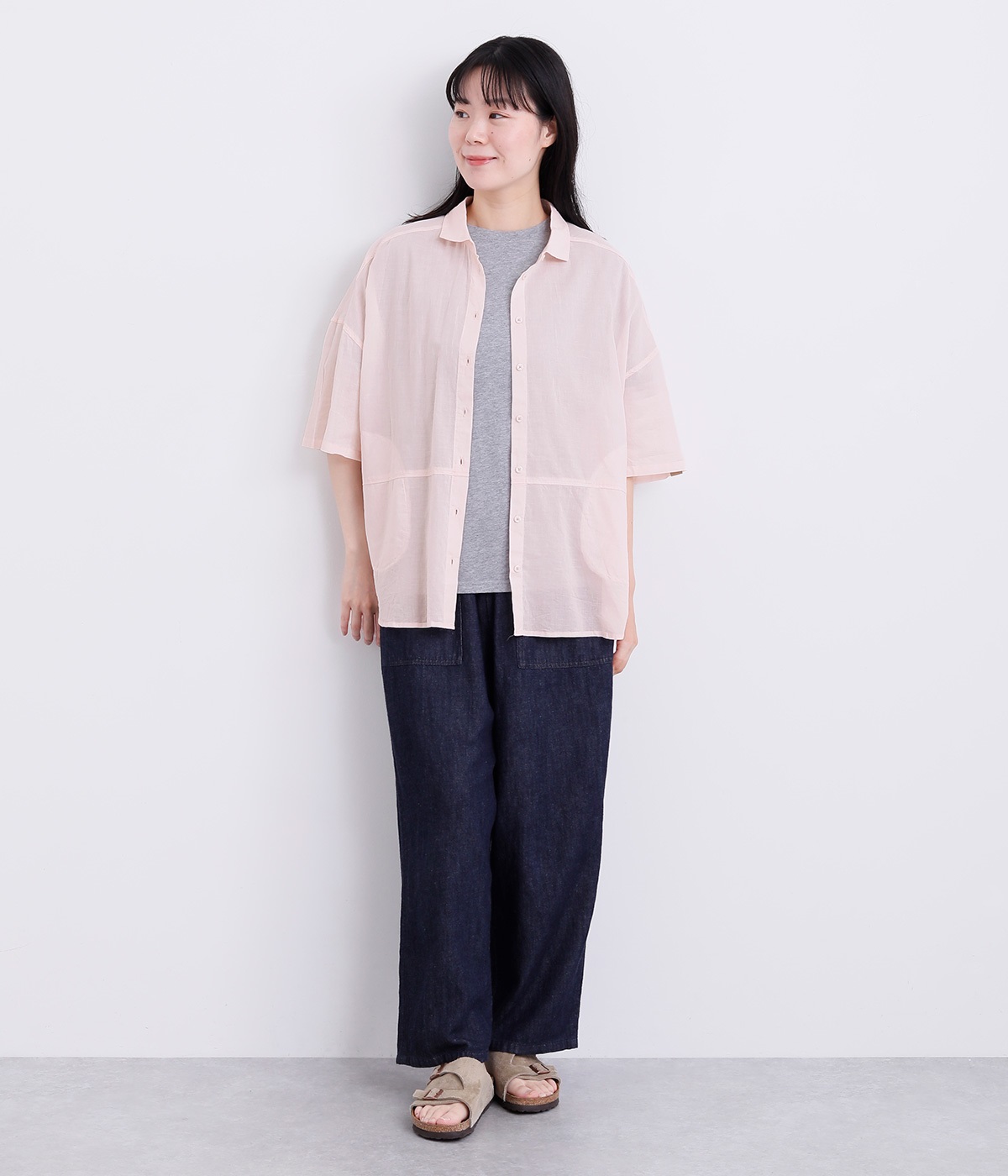 ほのかな透け感とナチュラルな風合いが特徴的なコットンローンを使用しています。薄手ながらほどよいふくらみがあり、通気性もいいので着心地も快適です。