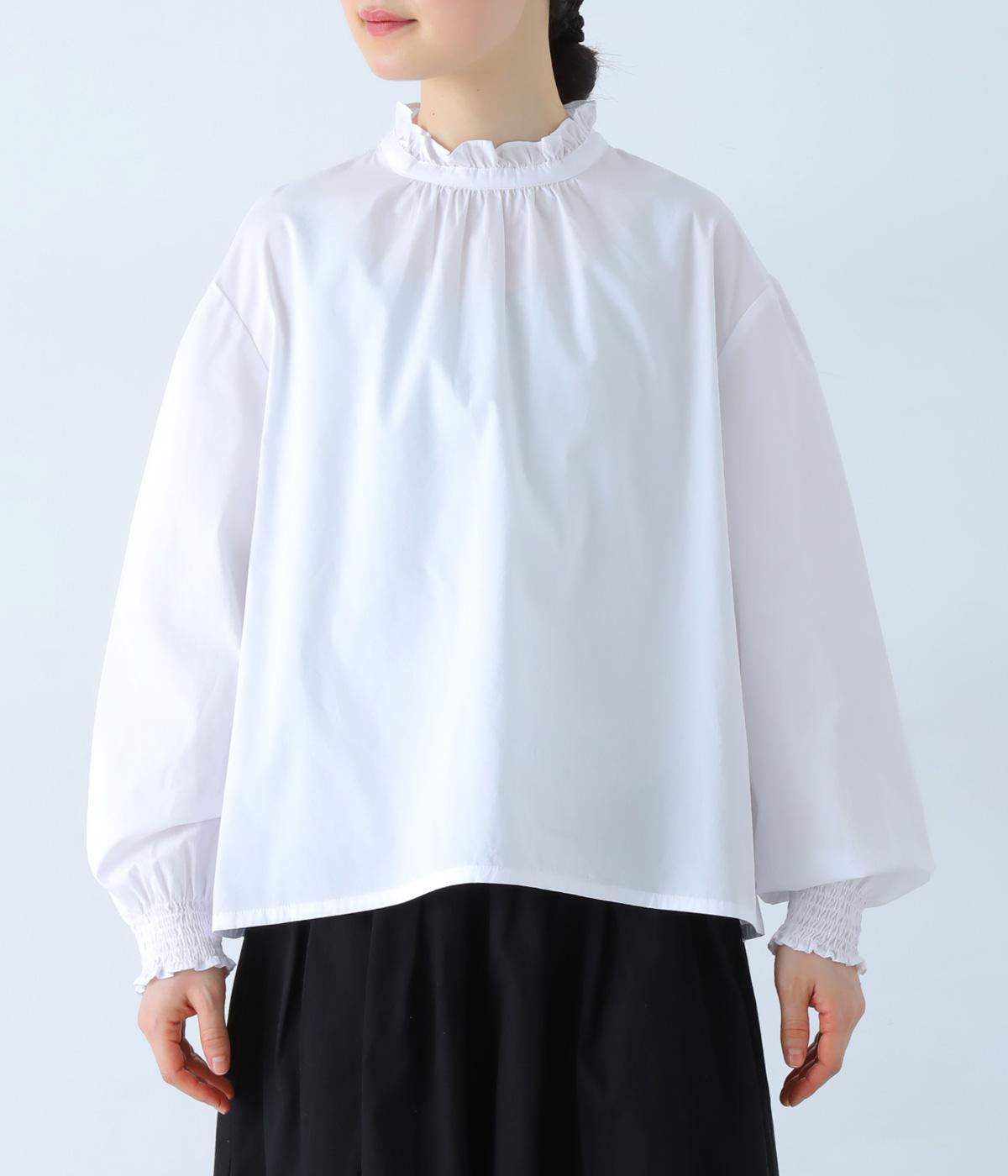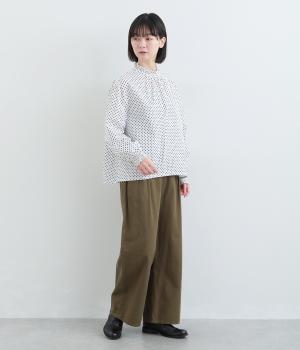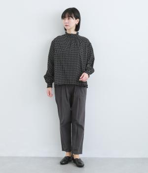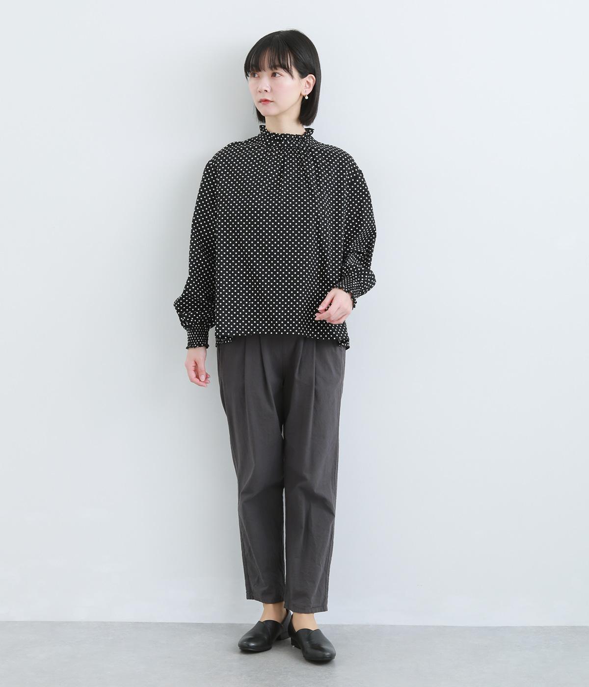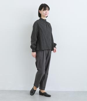 ひかえめなドットが上品な印象のブラウスです。ほのかなフリル襟やシャーリングの袖口が、大人かわいい雰囲気を後押しします。うしろボタンがデザイン性を高め、デイリーにもオケージョンにもスタイリングできる一枚です。