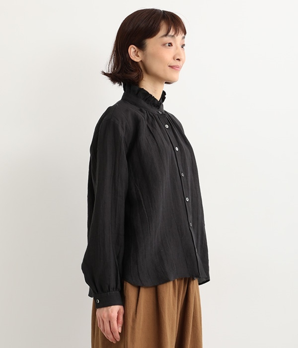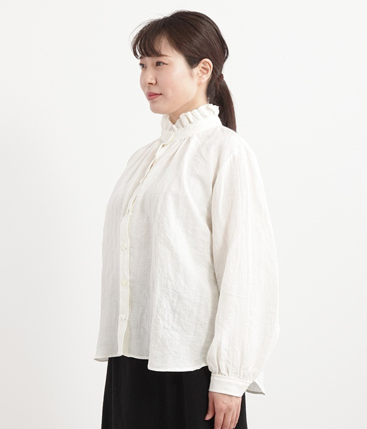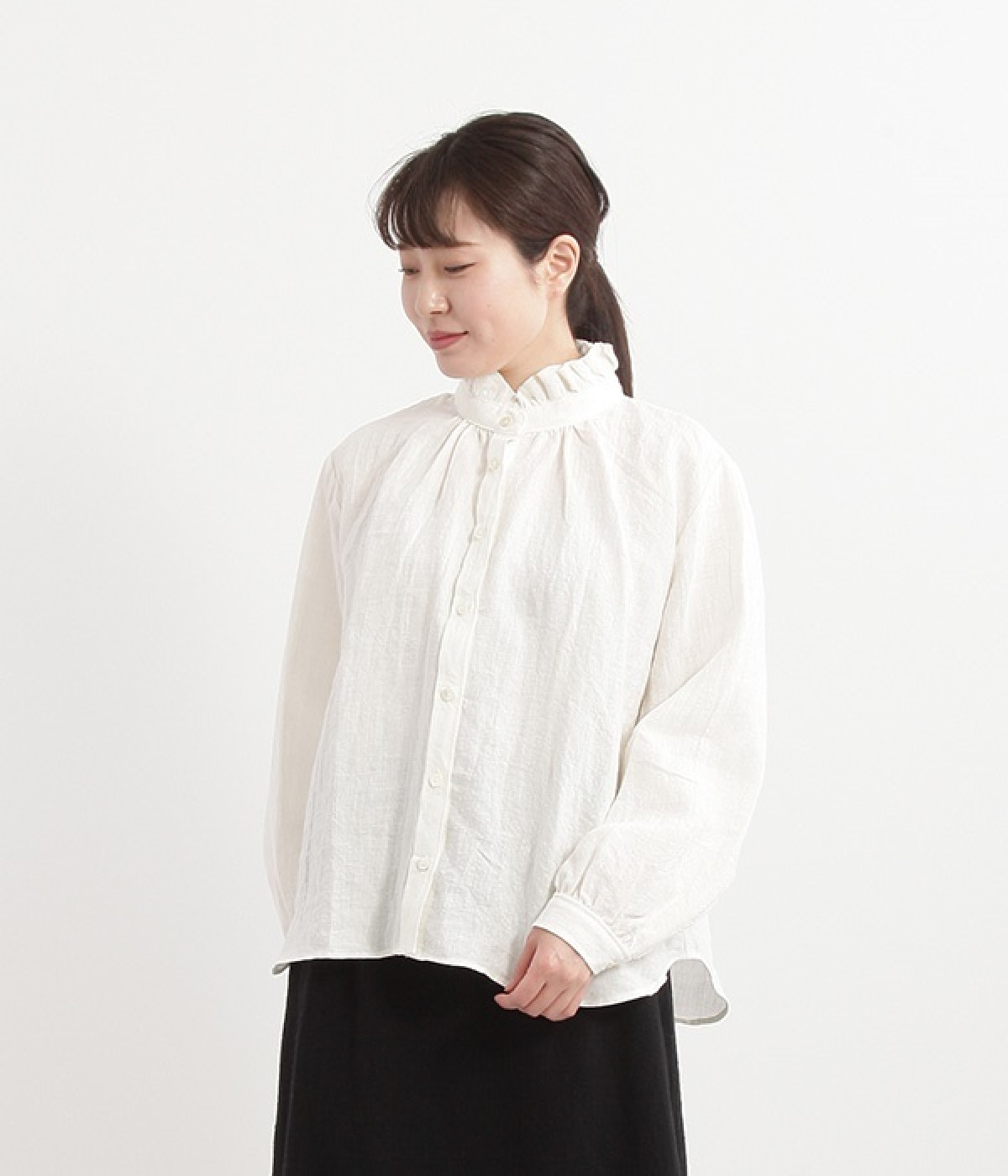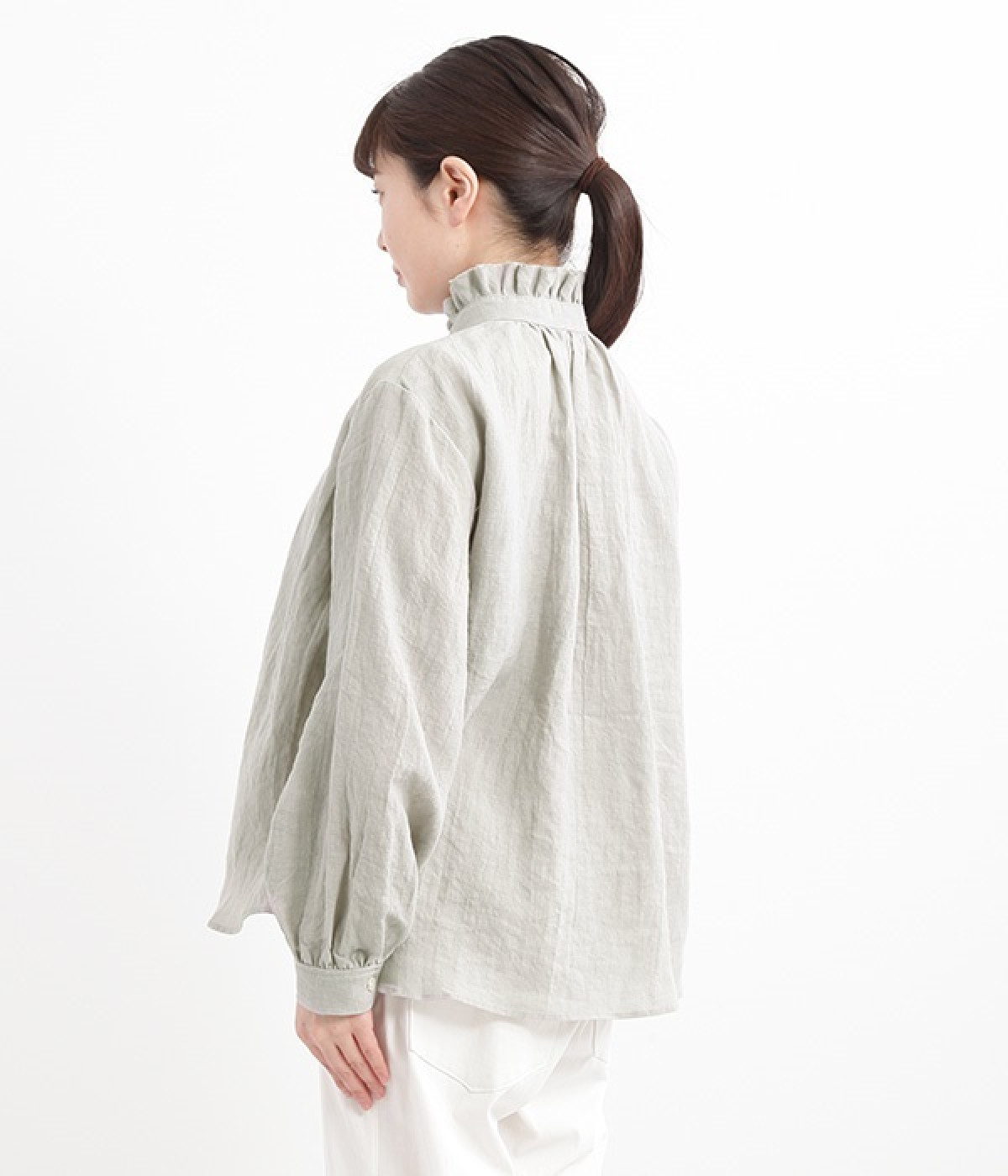 さらっとした肌触りとナチュラルなシワ感のあるフレンチリネンで仕立てたブラウスです。襟先を2重にしバイヤスカットすることで花弁のようなシルエットに仕上げました。ジャケットにインすれば襟元がアクセントになりシックに仕上がります。デニムなどのアイテムと合わせればきれいめなカジュアルダウンスタイルに変身。様々なコーディネートが楽しめるアイテムです。