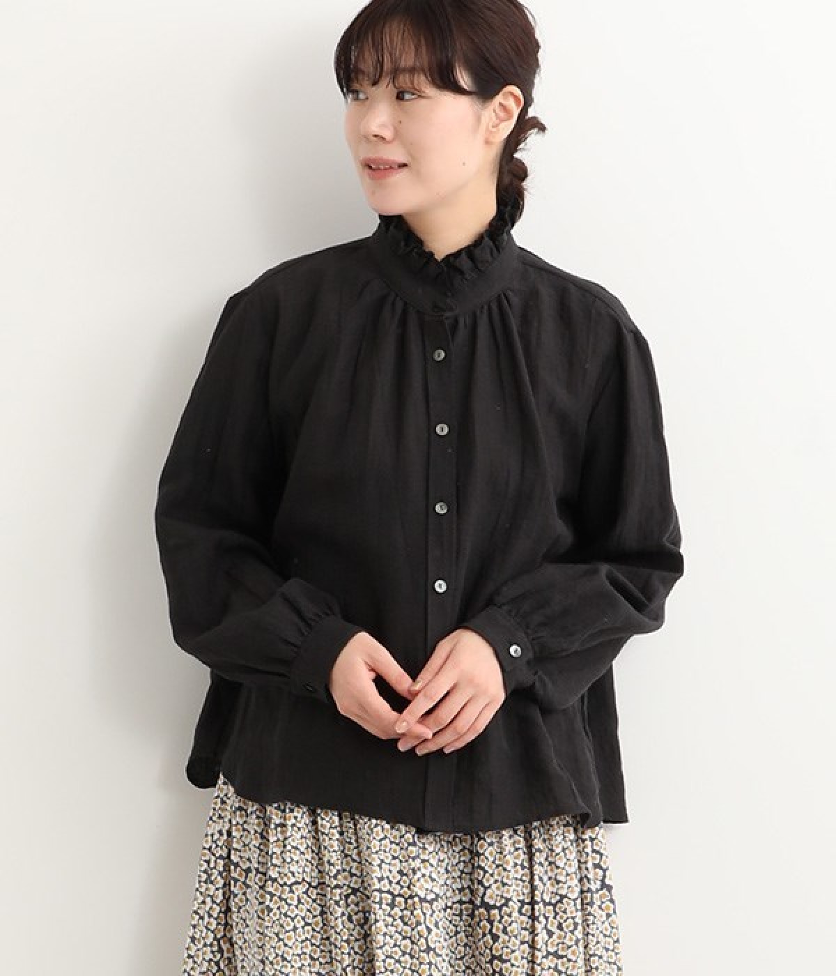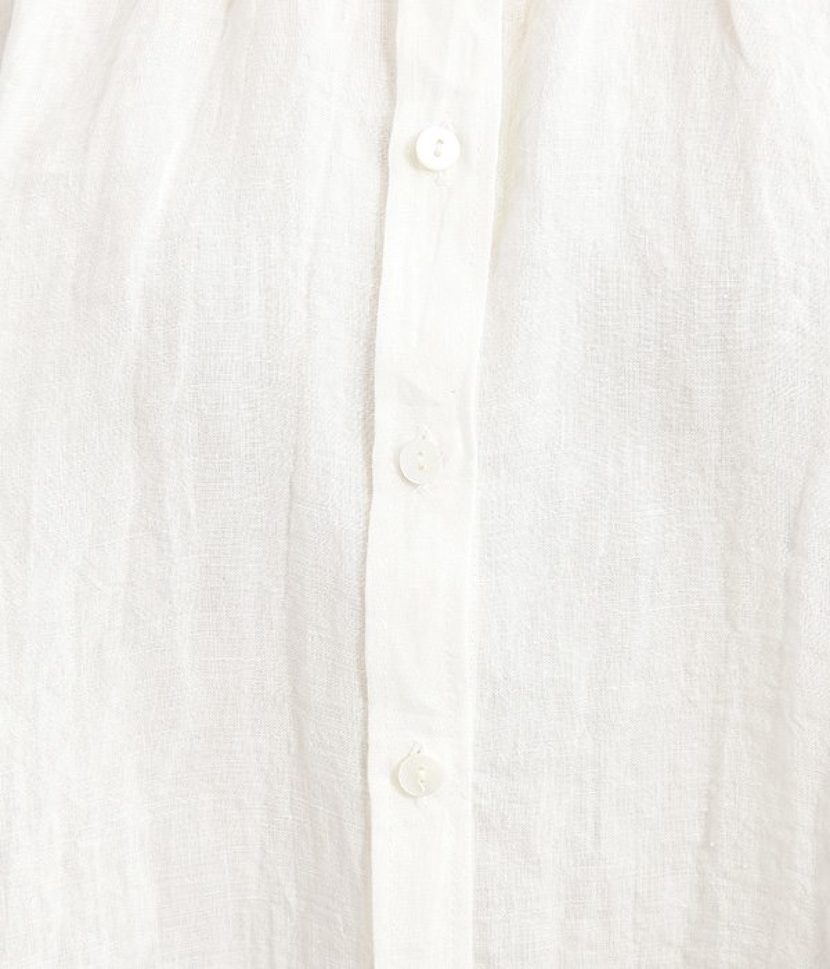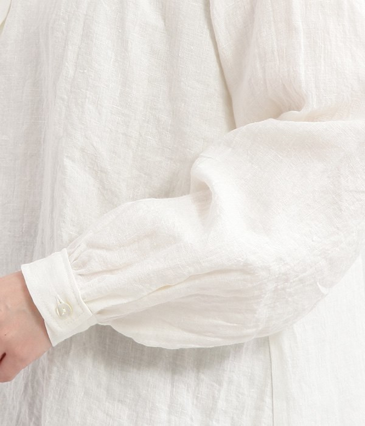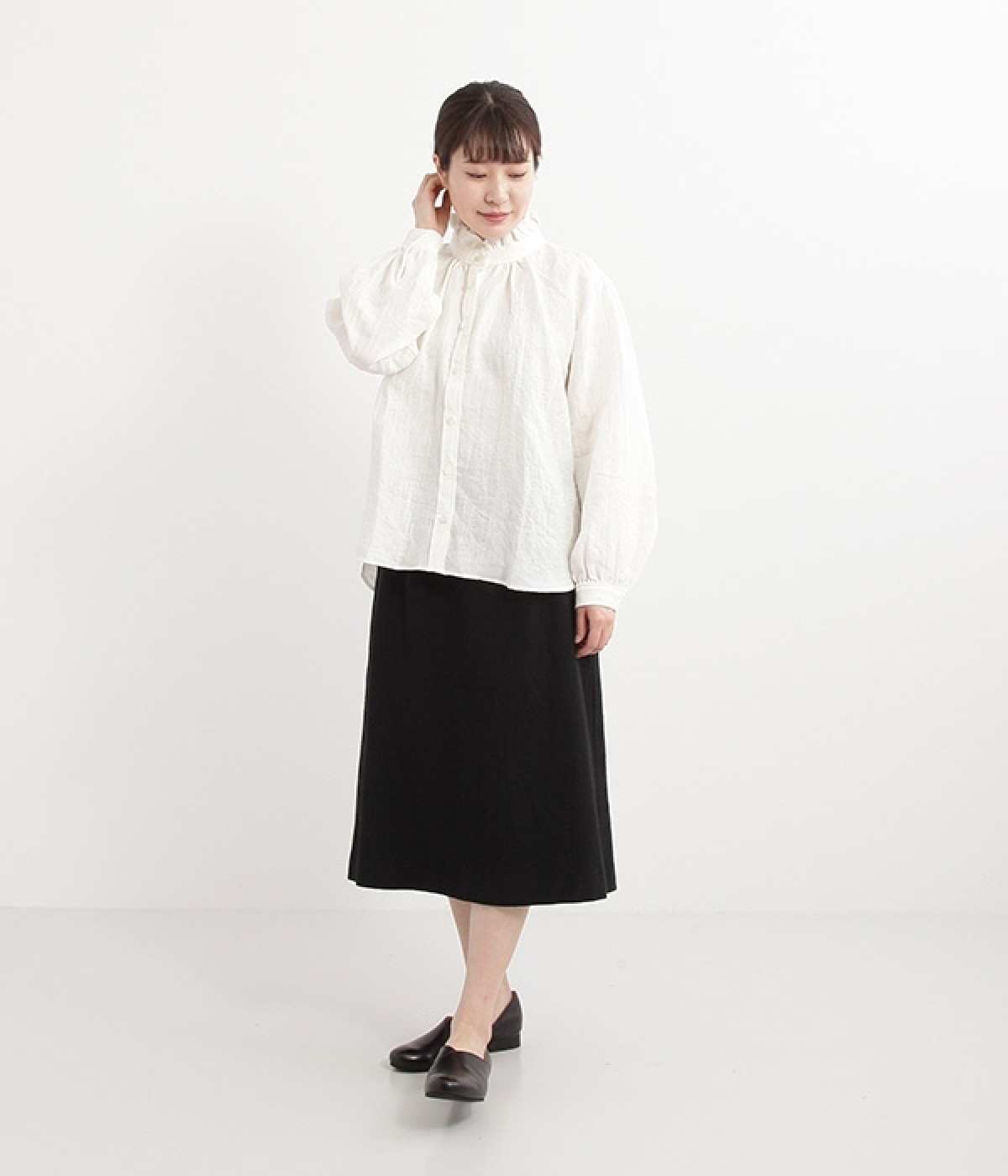 さらっとした肌触りとナチュラルなシワ感のあるフレンチリネンで仕立てたブラウスです。襟先を2重にしバイヤスカットすることで花弁のようなシルエットに仕上げました。ジャケットにインすれば襟元がアクセントになりシックに仕上がります。デニムなどのアイテムと合わせればきれいめなカジュアルダウンスタイルに変身。様々なコーディネートが楽しめるアイテムです。