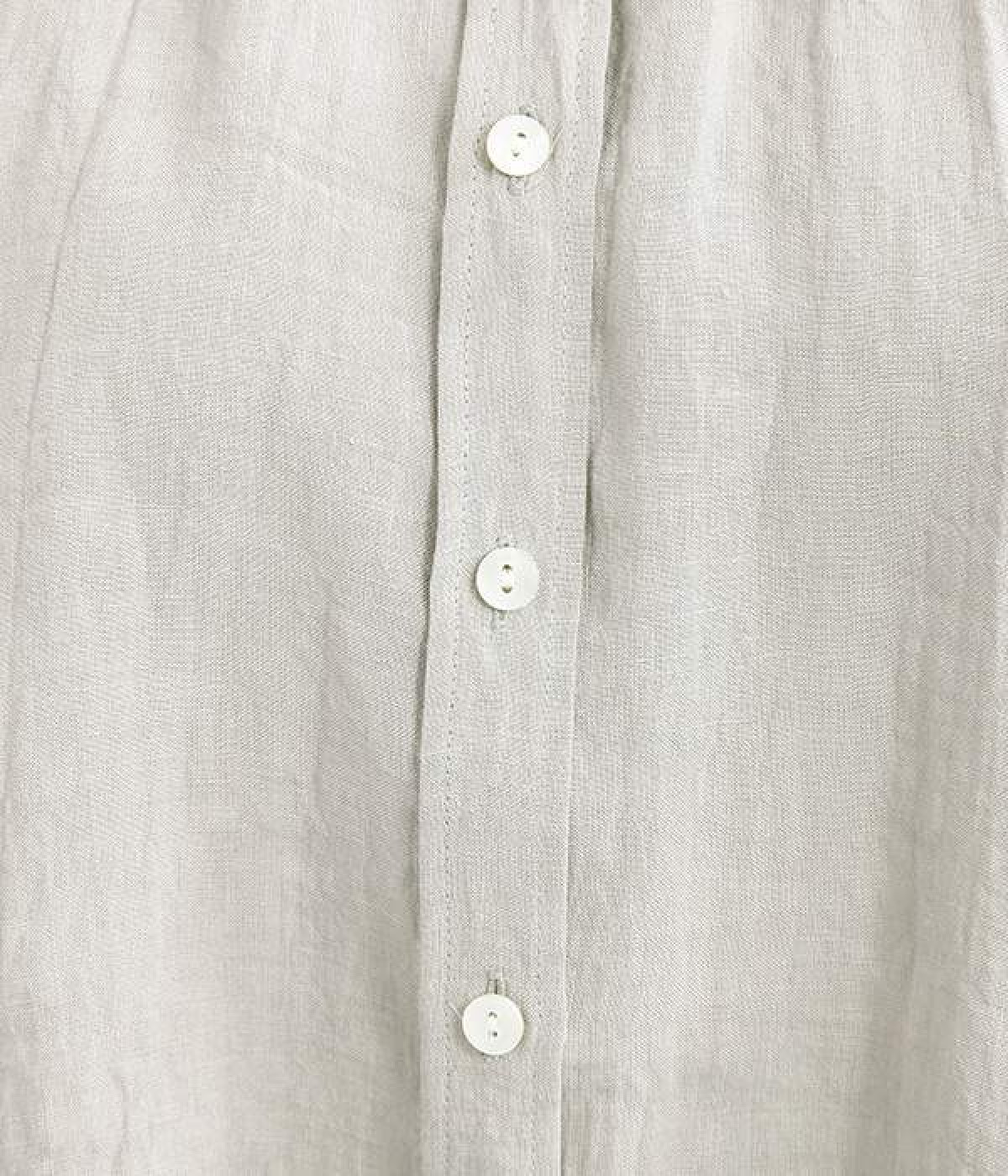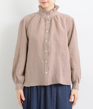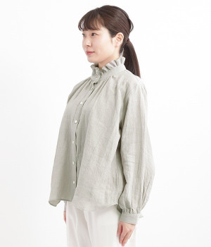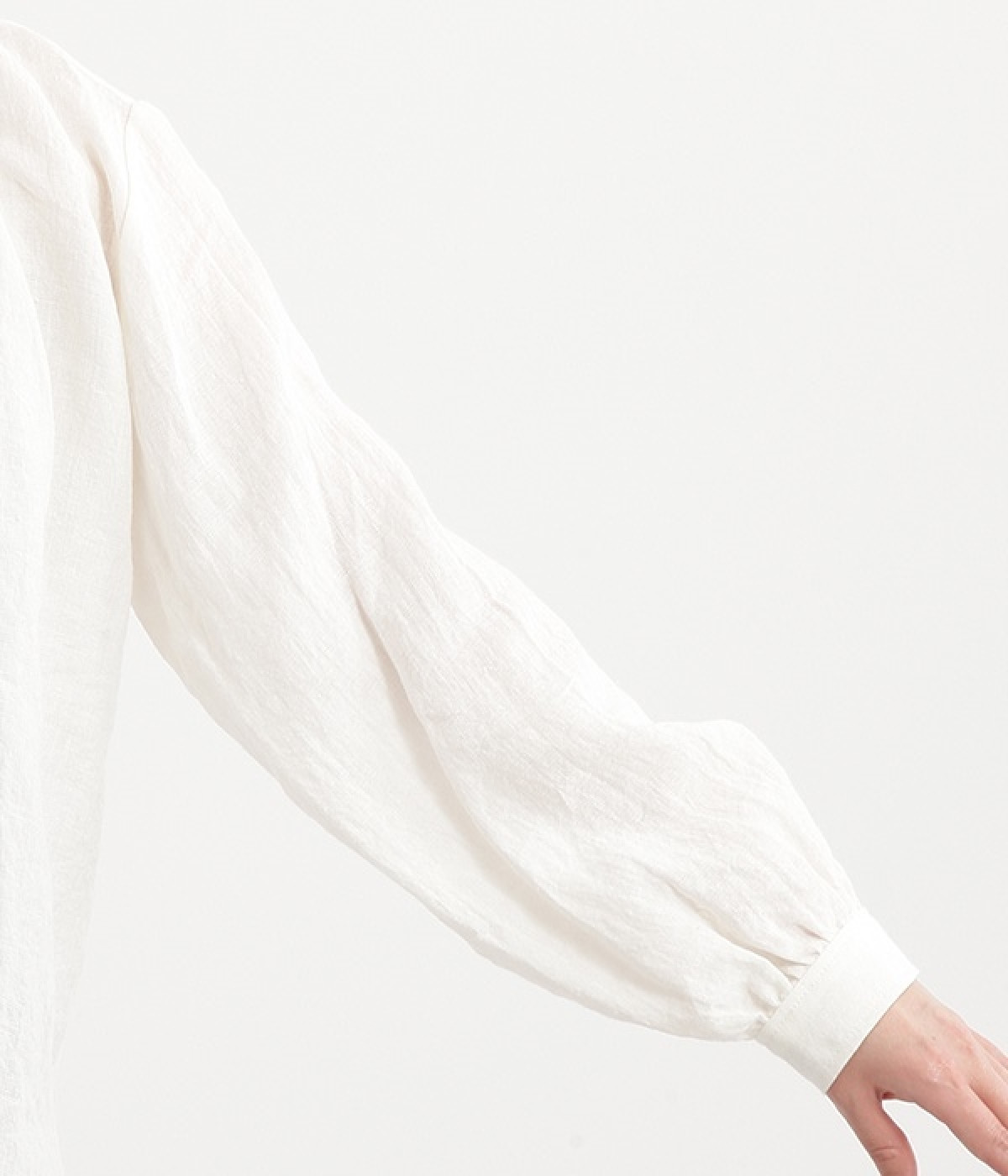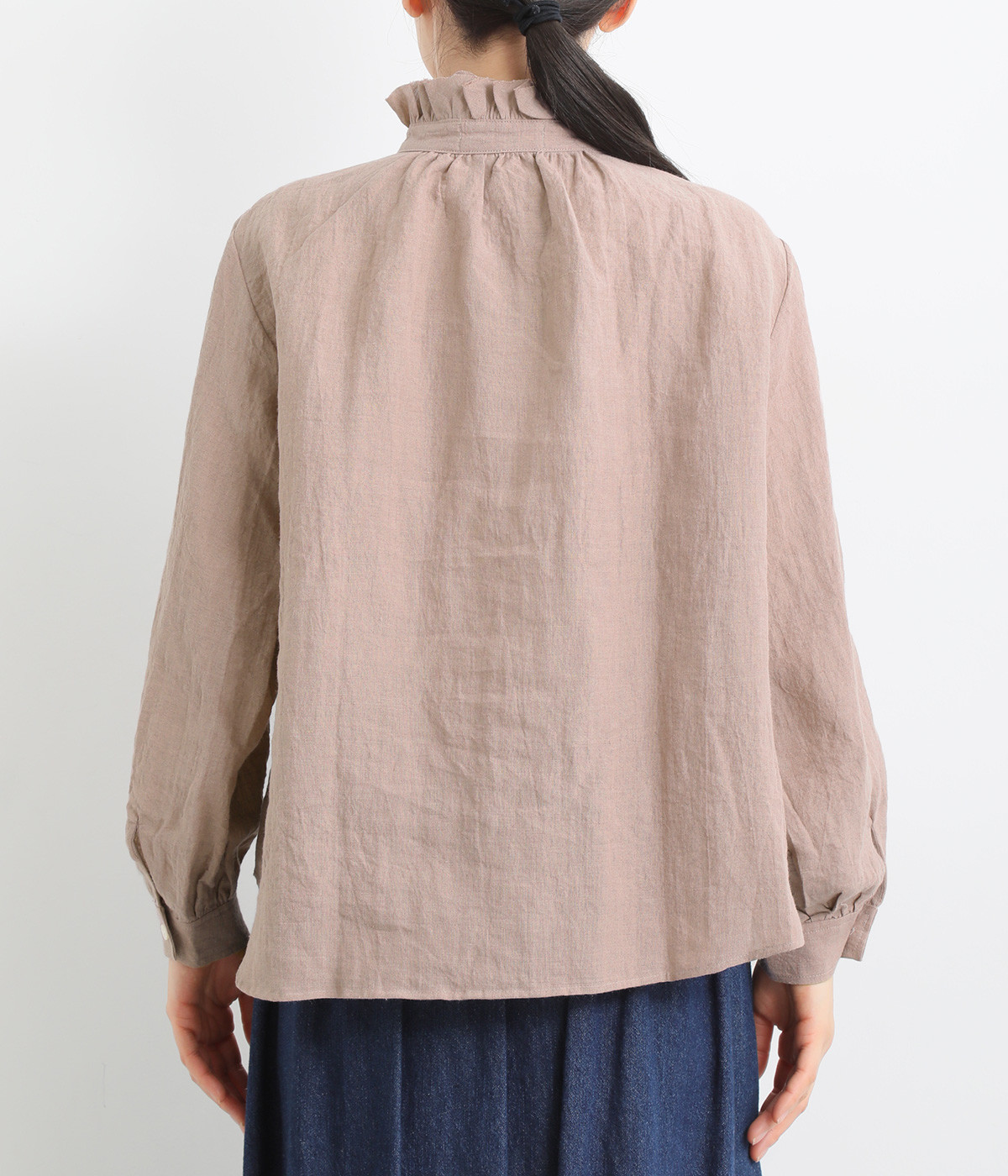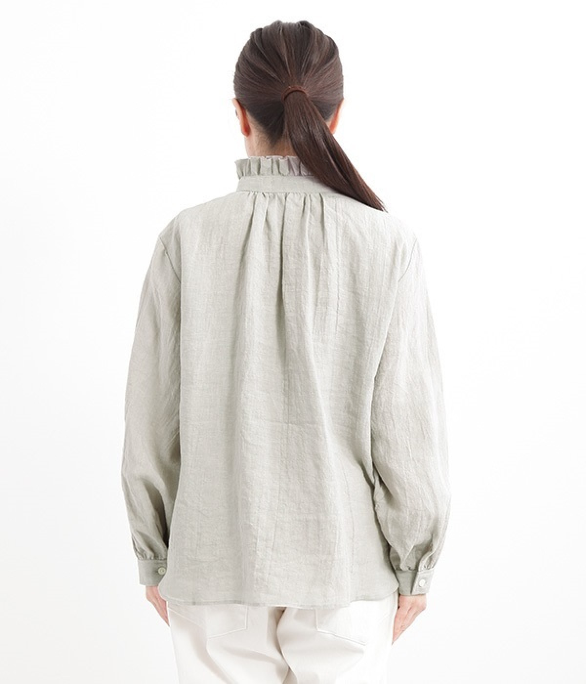 さらっとした肌触りとナチュラルなシワ感のあるフレンチリネンで仕立てたブラウスです。襟先を2重にしバイヤスカットすることで花弁のようなシルエットに仕上げました。ジャケットにインすれば襟元がアクセントになりシックに仕上がります。デニムなどのアイテムと合わせればきれいめなカジュアルダウンスタイルに変身。様々なコーディネートが楽しめるアイテムです。