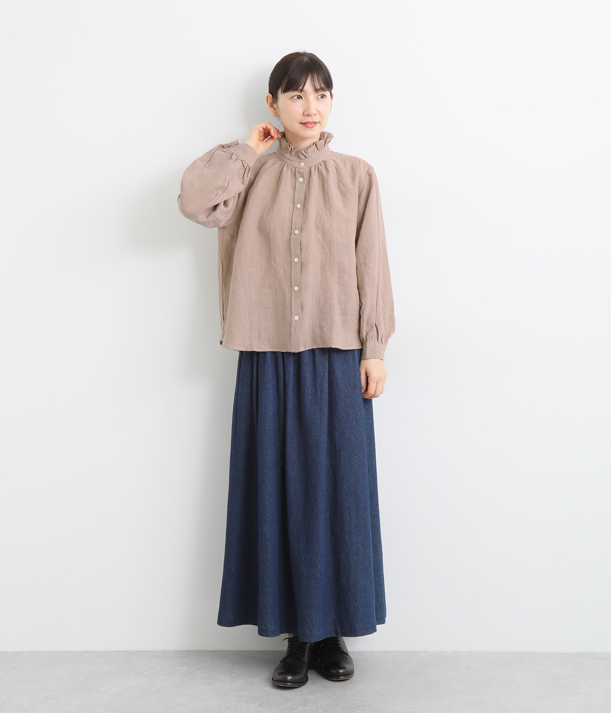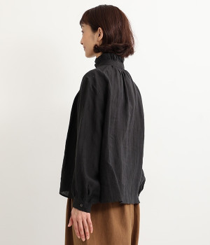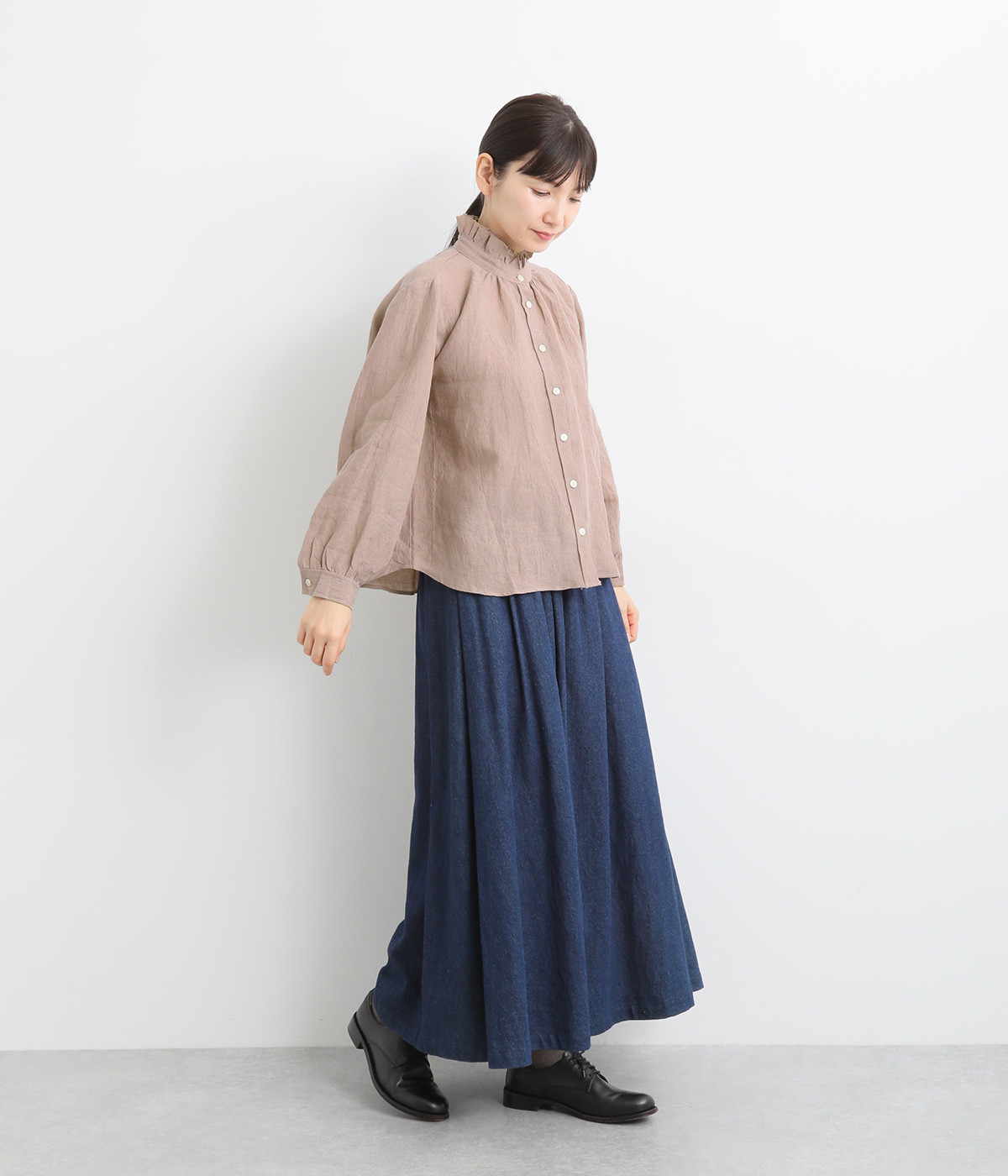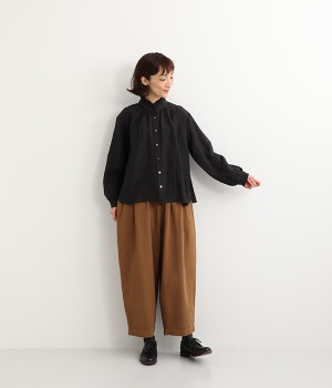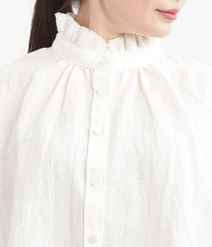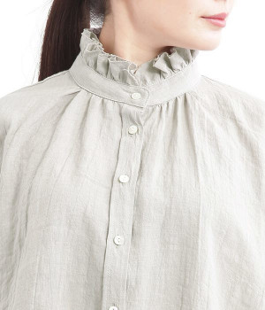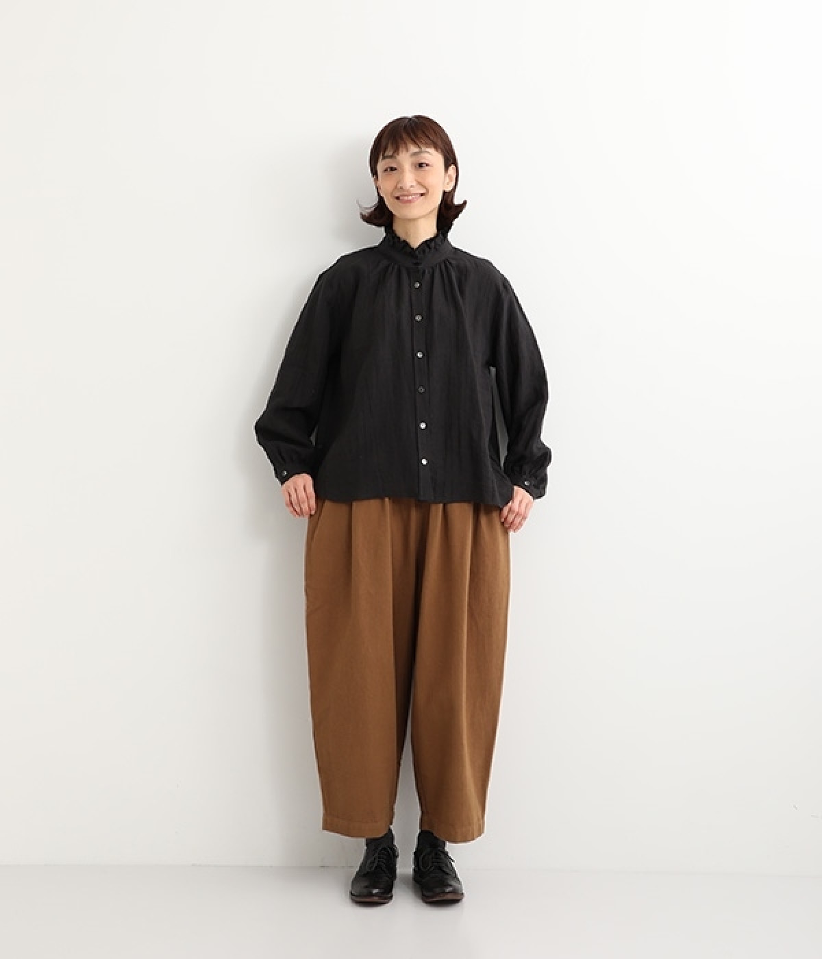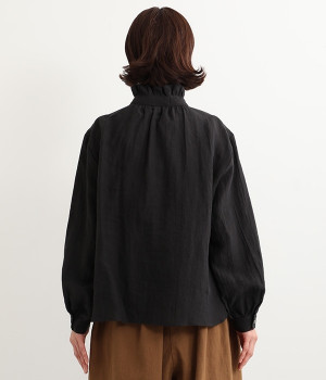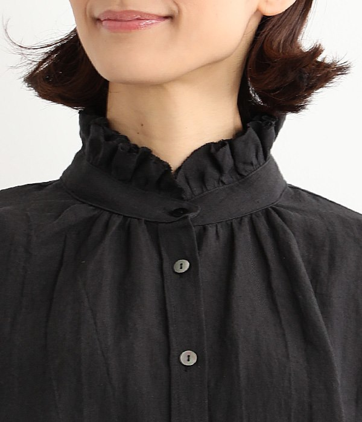さらっとした肌触りとナチュラルなシワ感のあるフレンチリネンで仕立てたブラウスです。襟先を2重にしバイヤスカットすることで花弁のようなシルエットに仕上げました。ジャケットにインすれば襟元がアクセントになりシックに仕上がります。デニムなどのアイテムと合わせればきれいめなカジュアルダウンスタイルに変身。様々なコーディネートが楽しめるアイテムです。