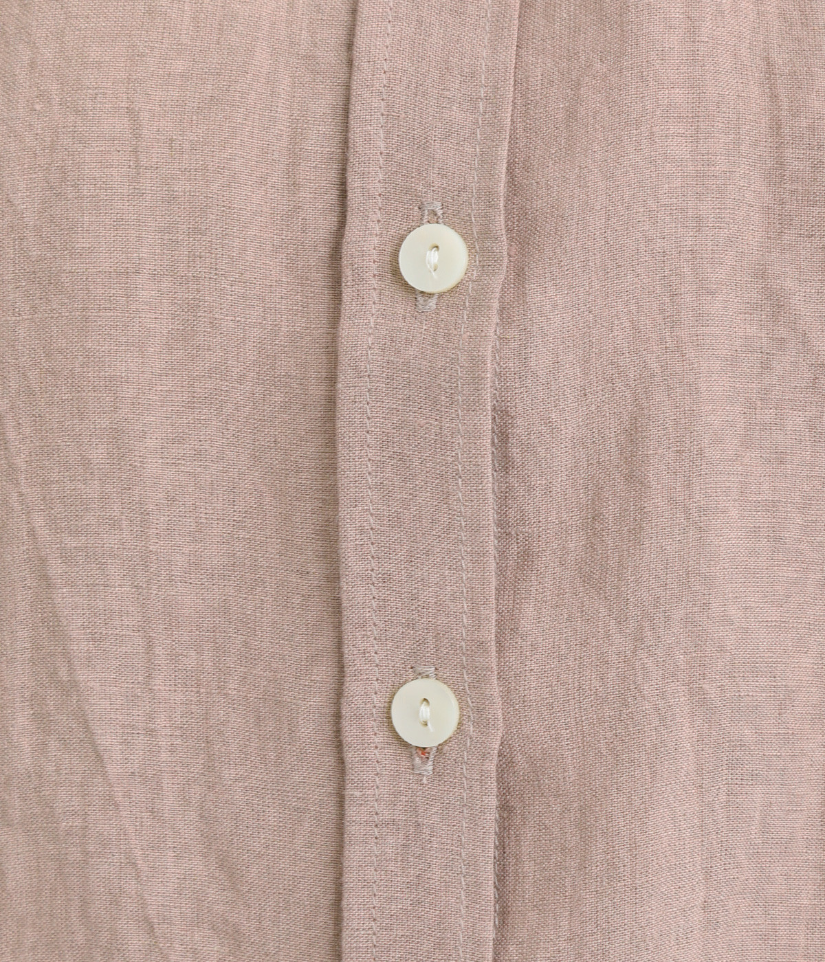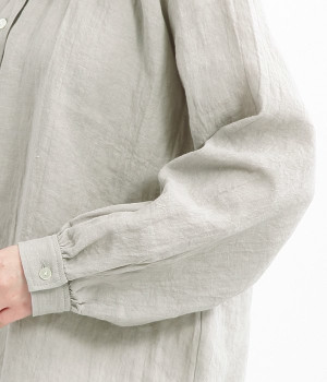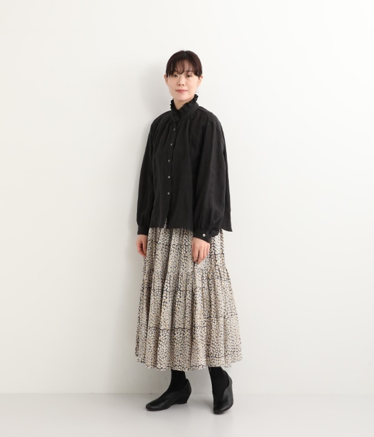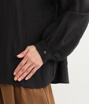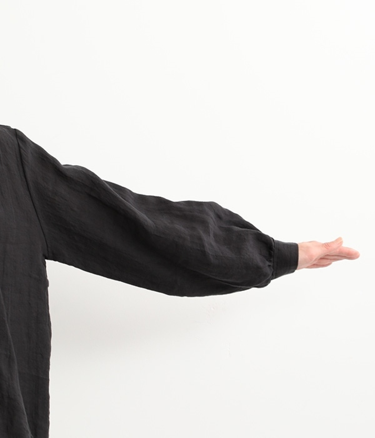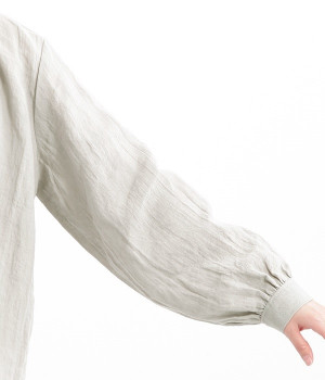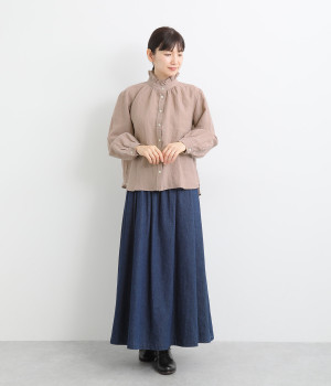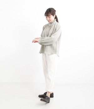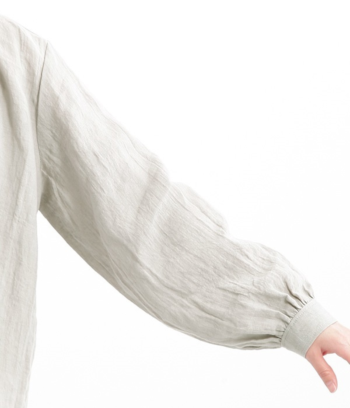 さらっとした肌触りとナチュラルなシワ感のあるフレンチリネンで仕立てたブラウスです。襟先を2重にしバイヤスカットすることで花弁のようなシルエットに仕上げました。ジャケットにインすれば襟元がアクセントになりシックに仕上がります。デニムなどのアイテムと合わせればきれいめなカジュアルダウンスタイルに変身。様々なコーディネートが楽しめるアイテムです。
