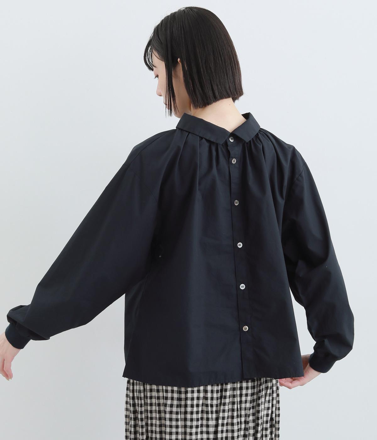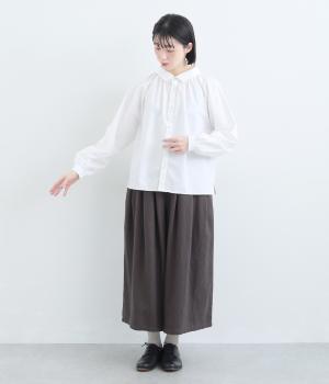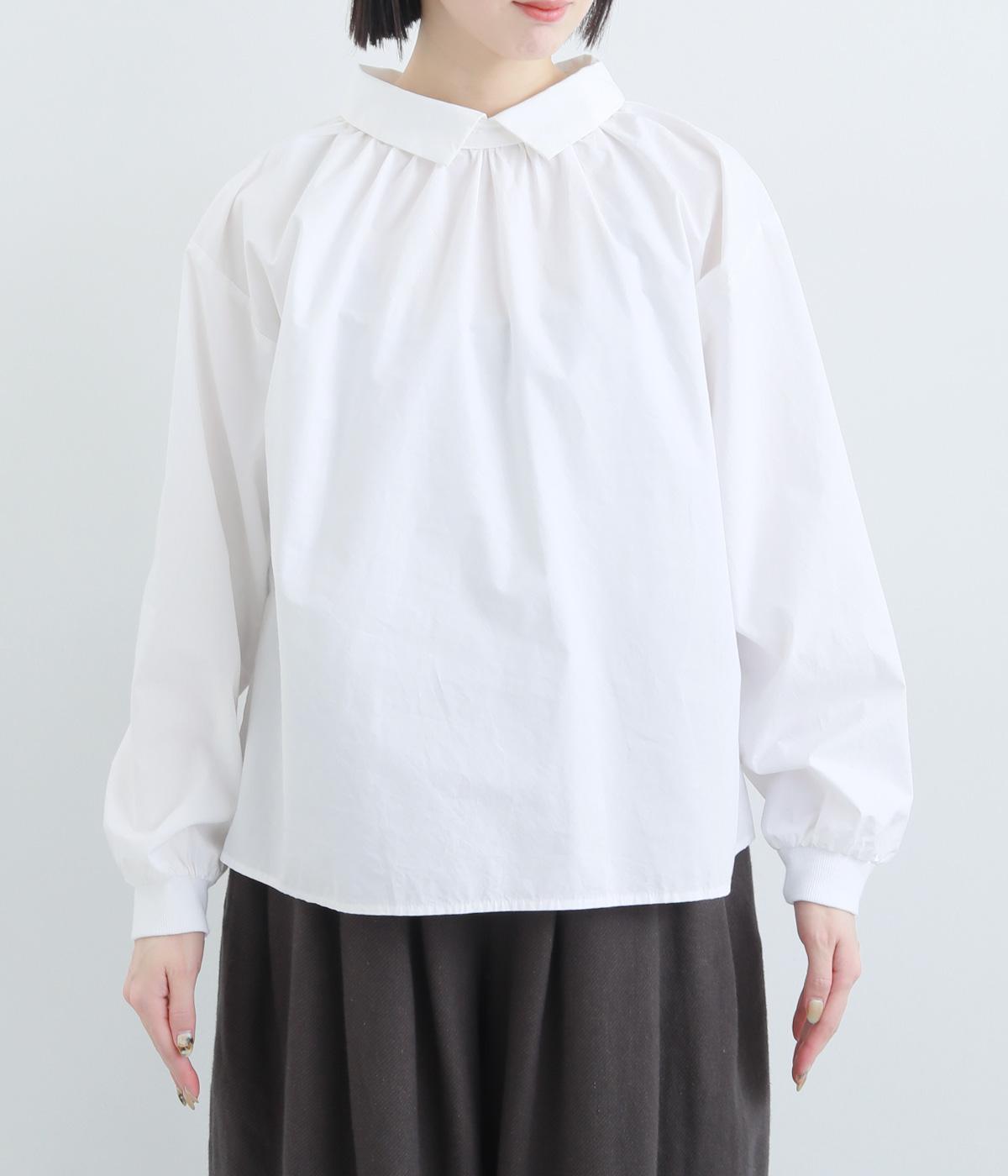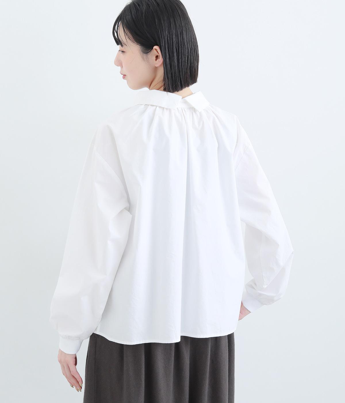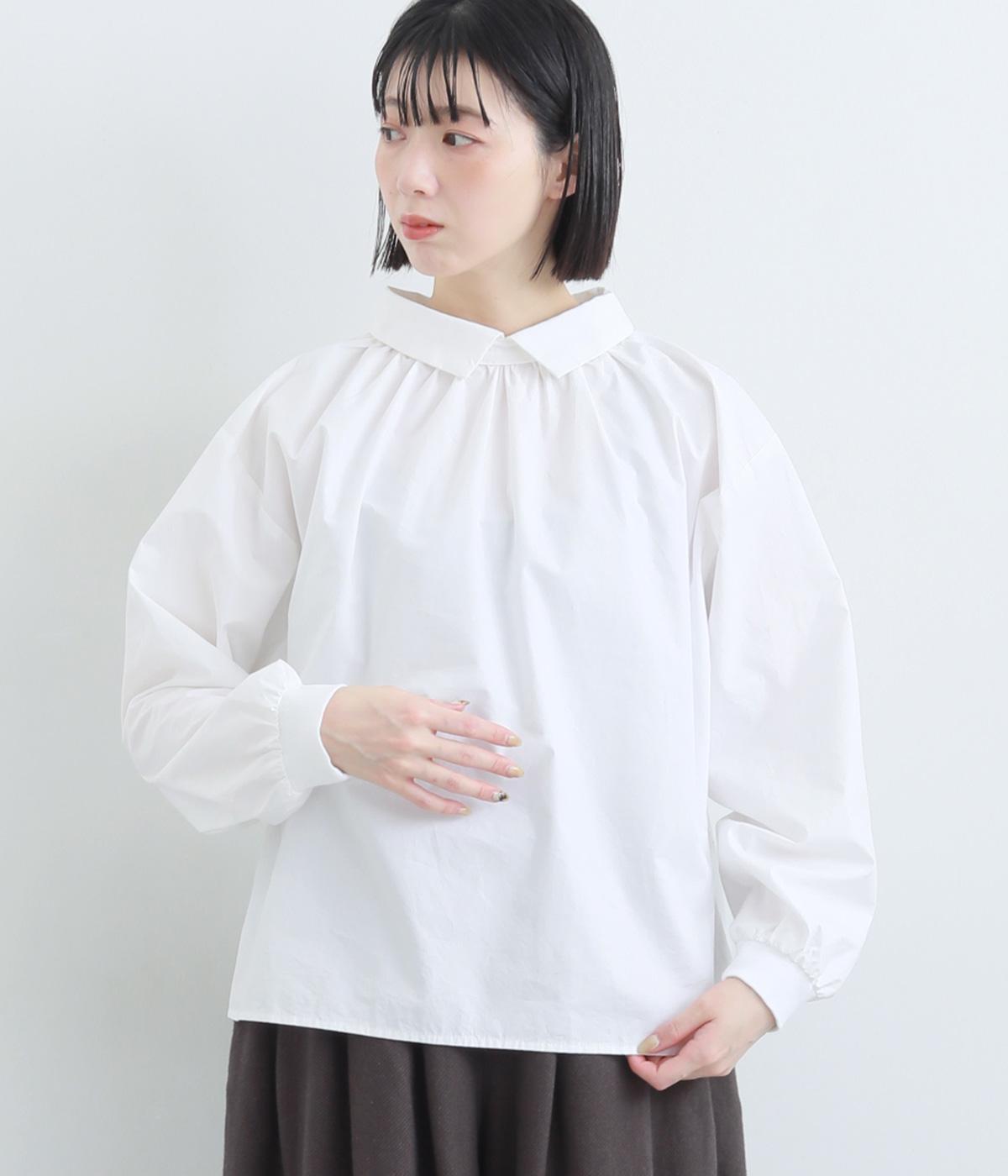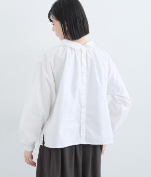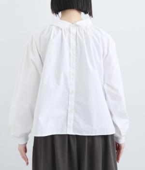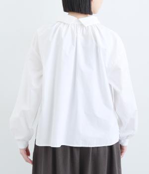 きちんと感のあるブラウスを前後で着用できる2wayに仕立てました。前後どちらもフラットな襟元がデザインポイントになっています。ギャザーを寄せた首まわりやふんわりした袖のシルエットが、さりげなく華やかさを添えています。