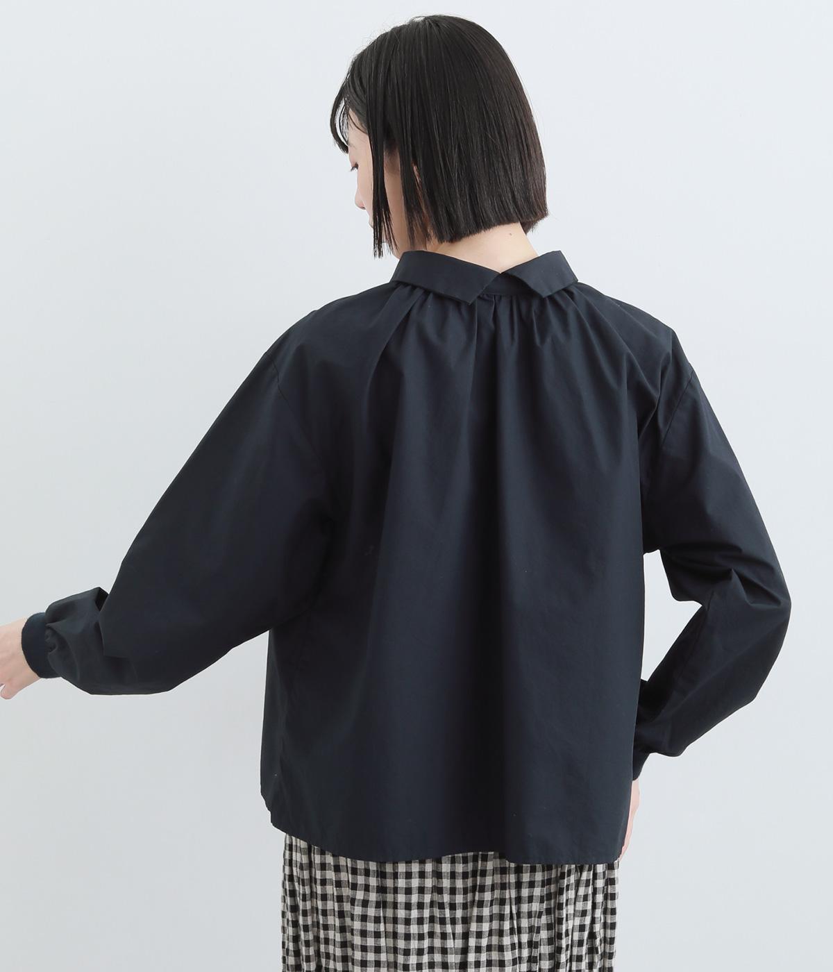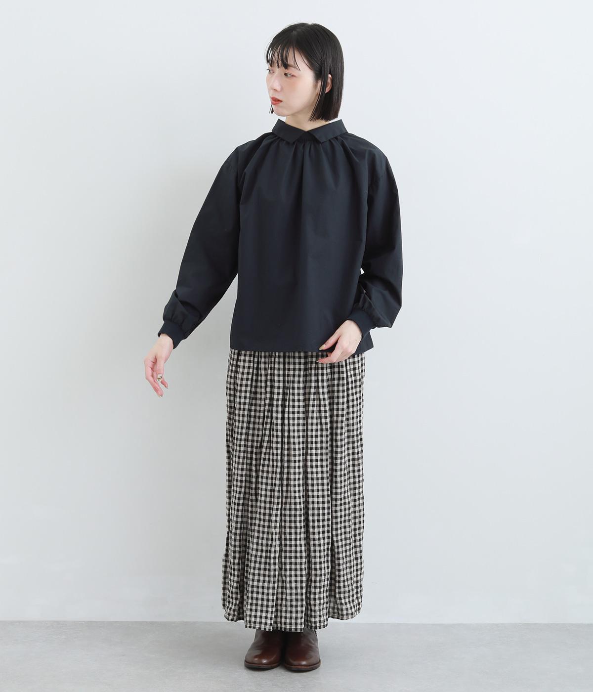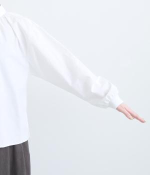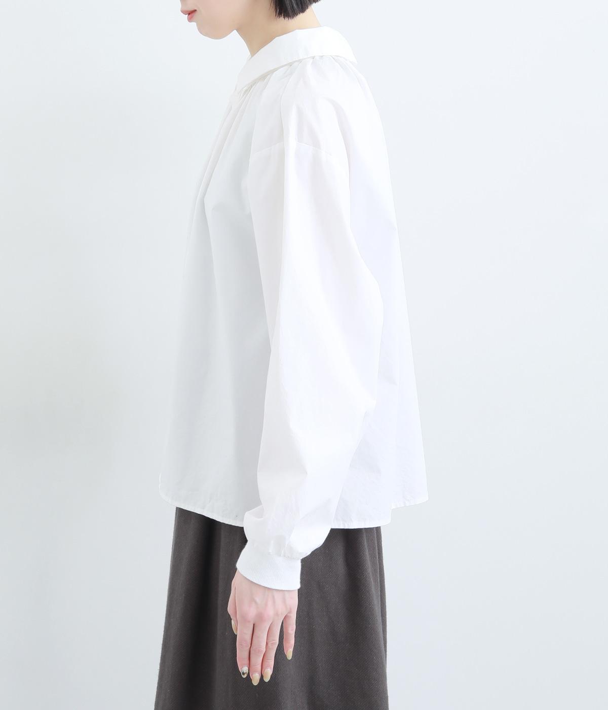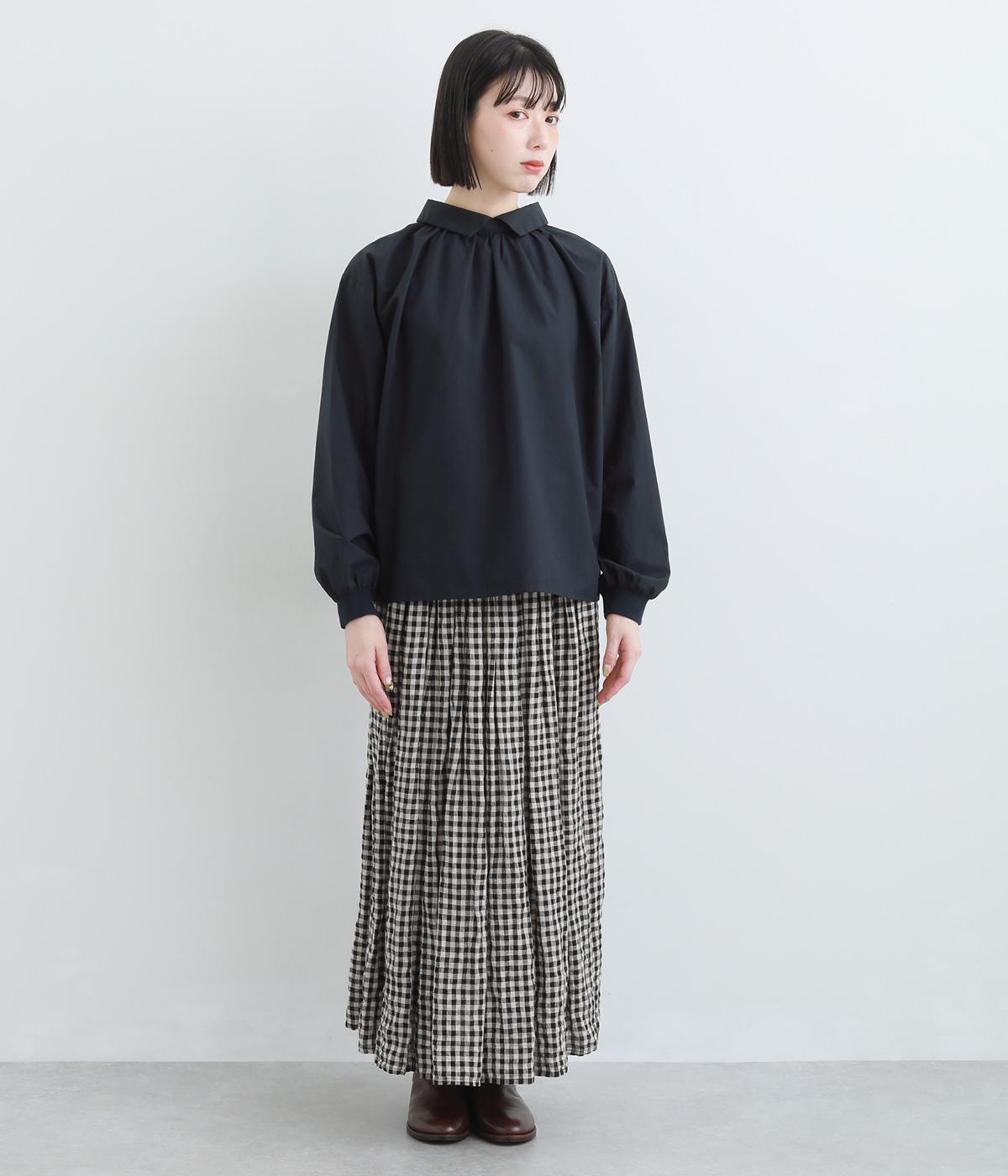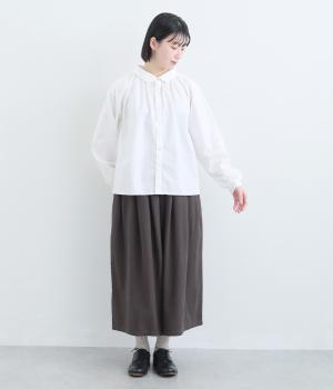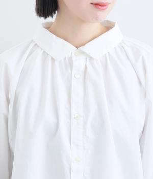 きちんと感のあるブラウスを前後で着用できる2wayに仕立てました。前後どちらもフラットな襟元がデザインポイントになっています。ギャザーを寄せた首まわりやふんわりした袖のシルエットが、さりげなく華やかさを添えています。