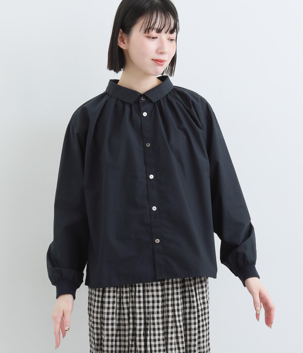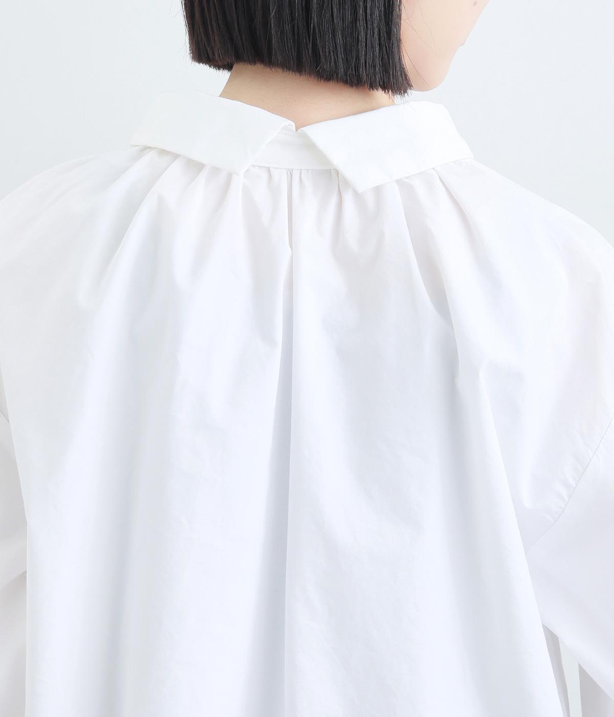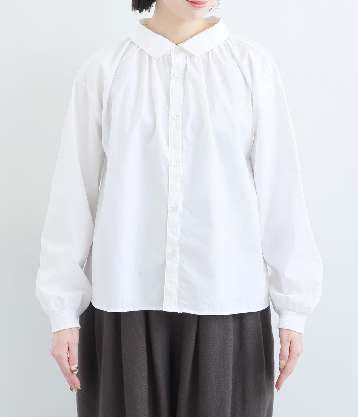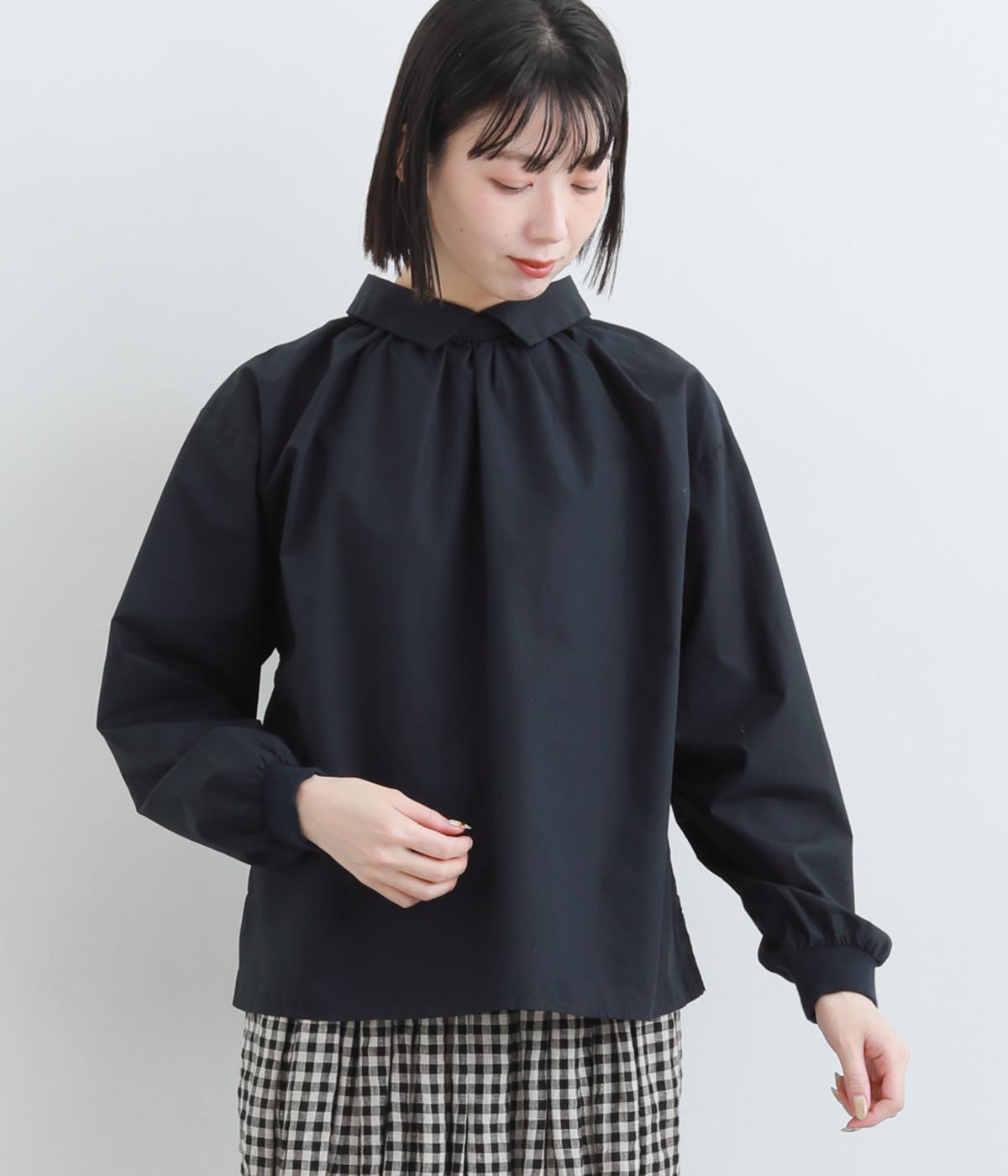 きちんと感のあるブラウスを前後で着用できる2wayに仕立てました。前後どちらもフラットな襟元がデザインポイントになっています。ギャザーを寄せた首まわりやふんわりした袖のシルエットが、さりげなく華やかさを添えています。